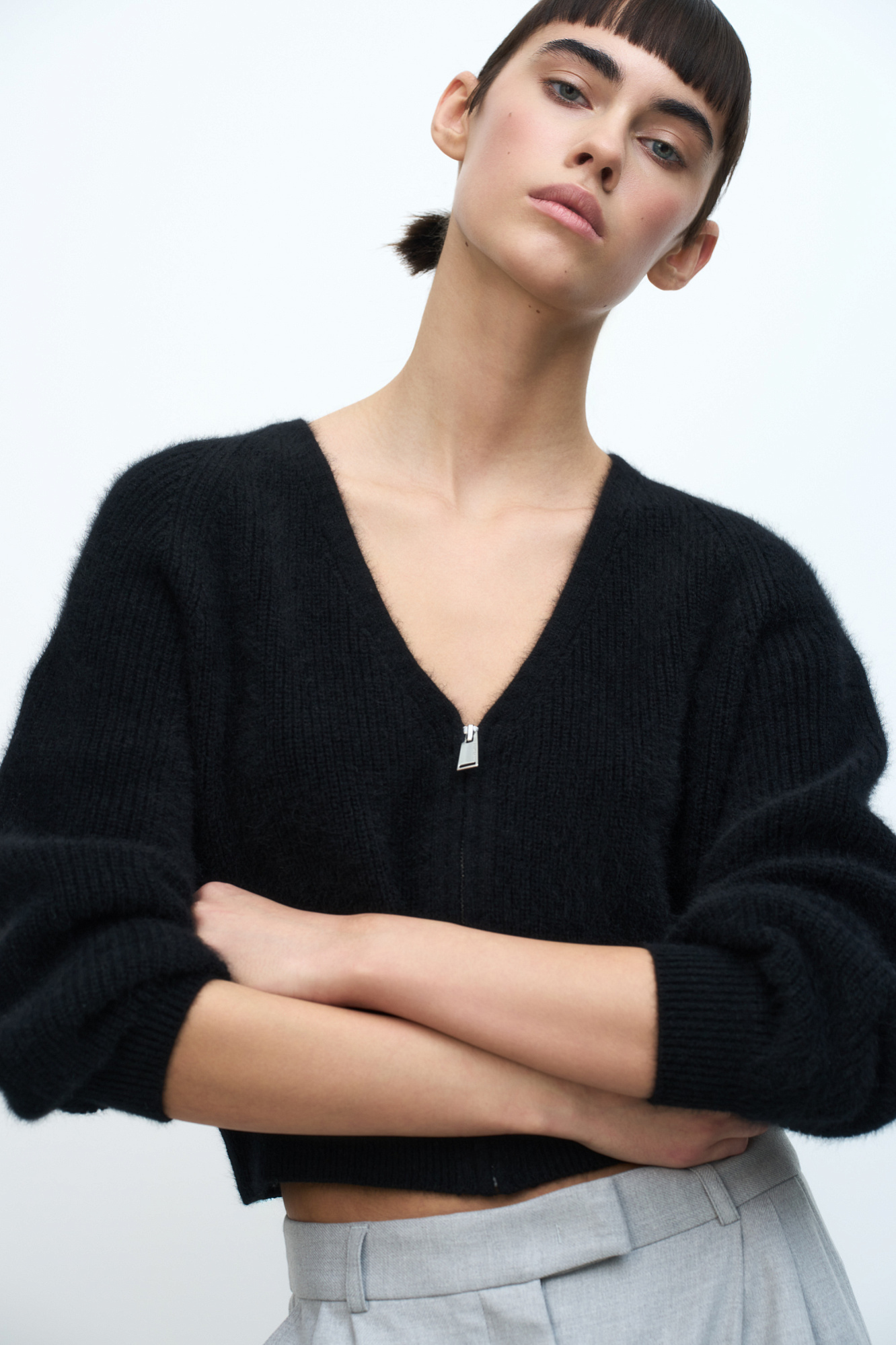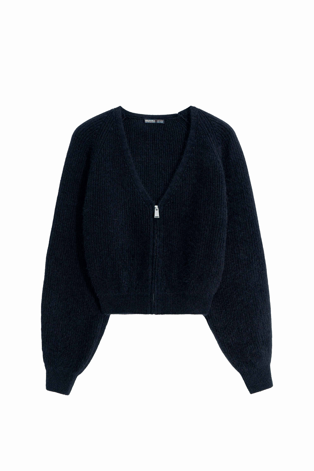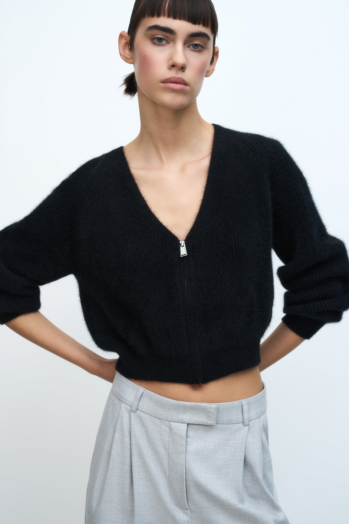 Укороченный кардиган на молнии с V-образным вырезом. Содержание в пряже 40% натурального пуха лисы делает изделие теплым, мягким и в тоже время очень легким.