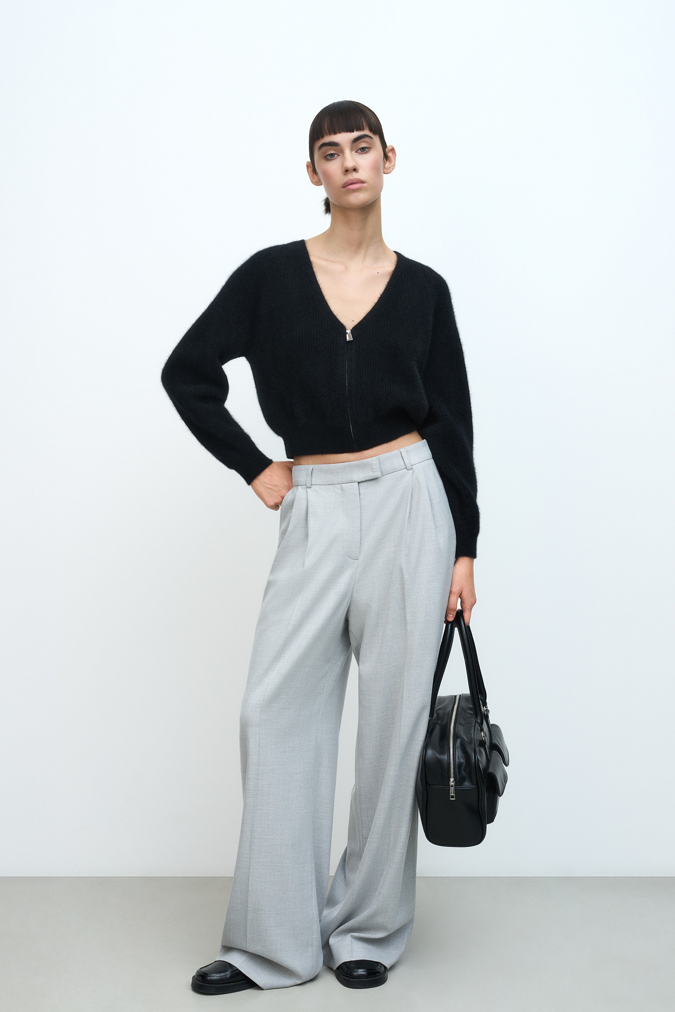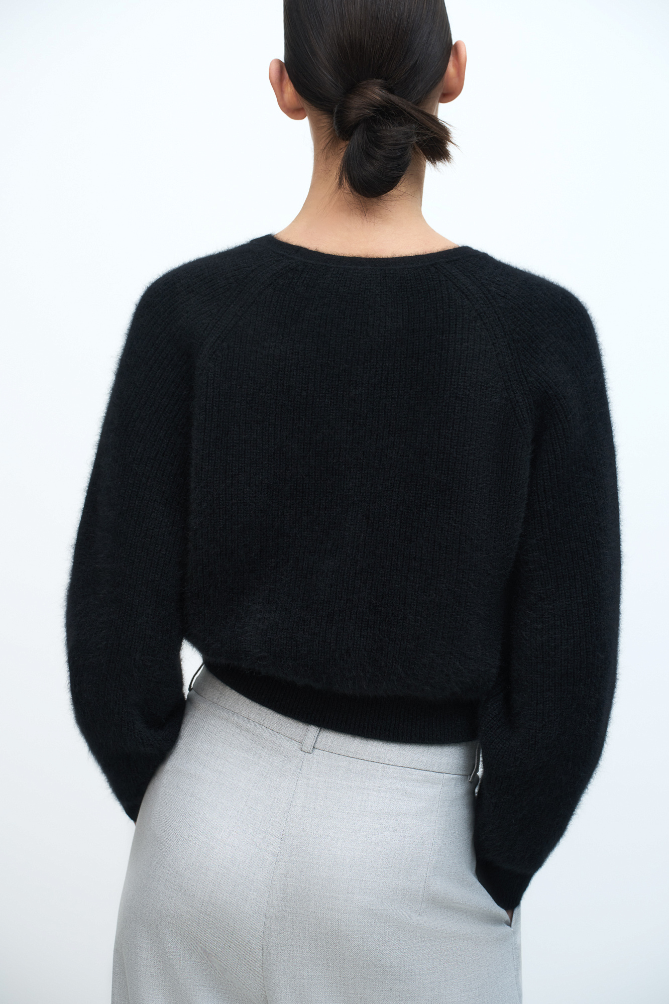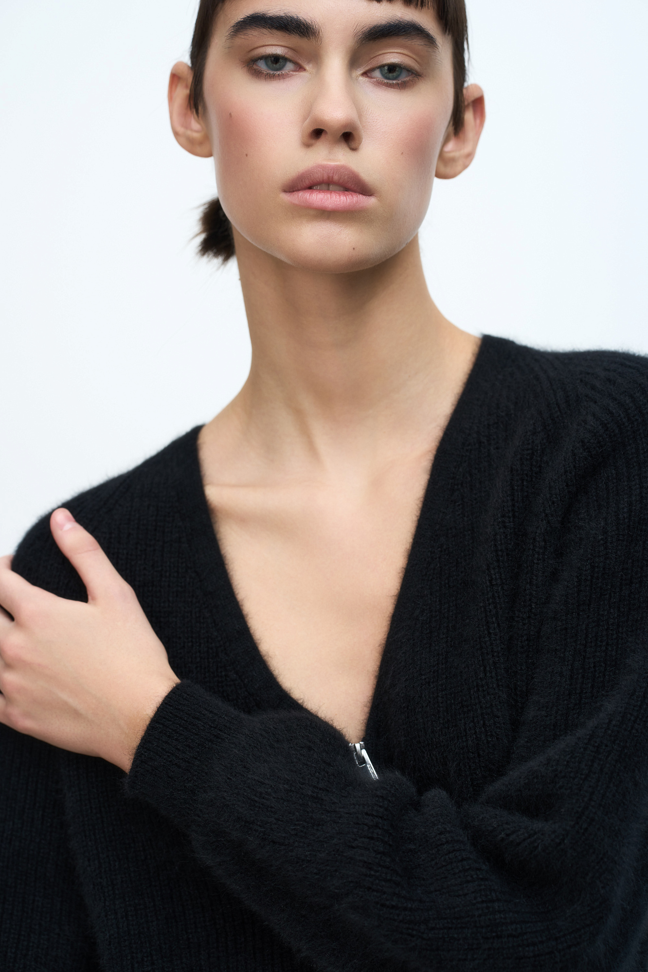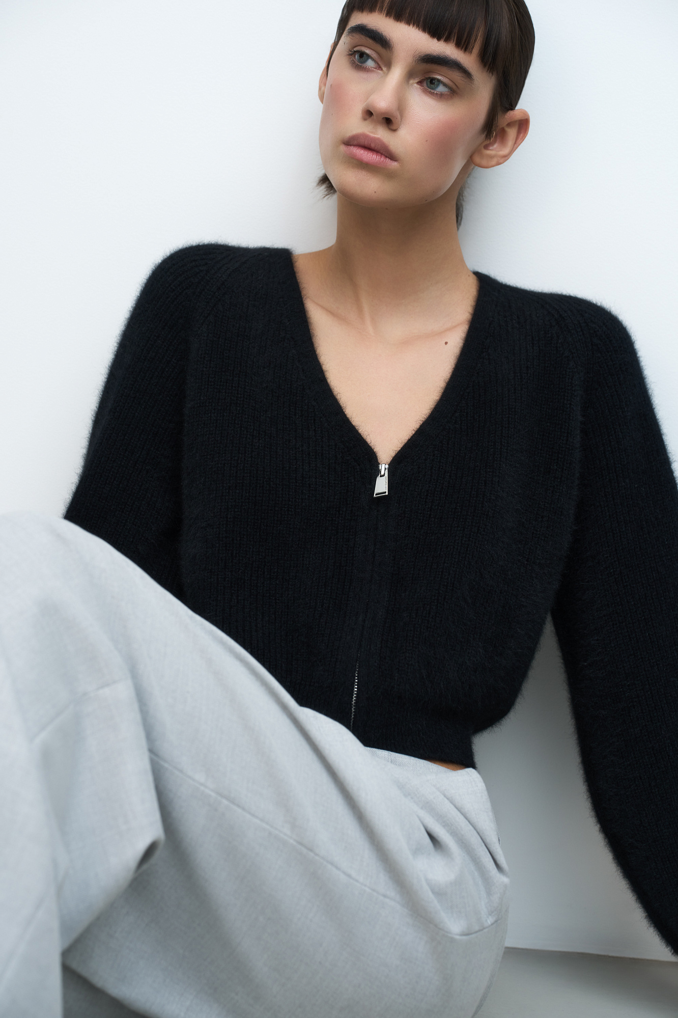 Укороченный кардиган на молнии с V-образным вырезом. Содержание в пряже 40% натурального пуха лисы делает изделие теплым, мягким и в тоже время очень легким.