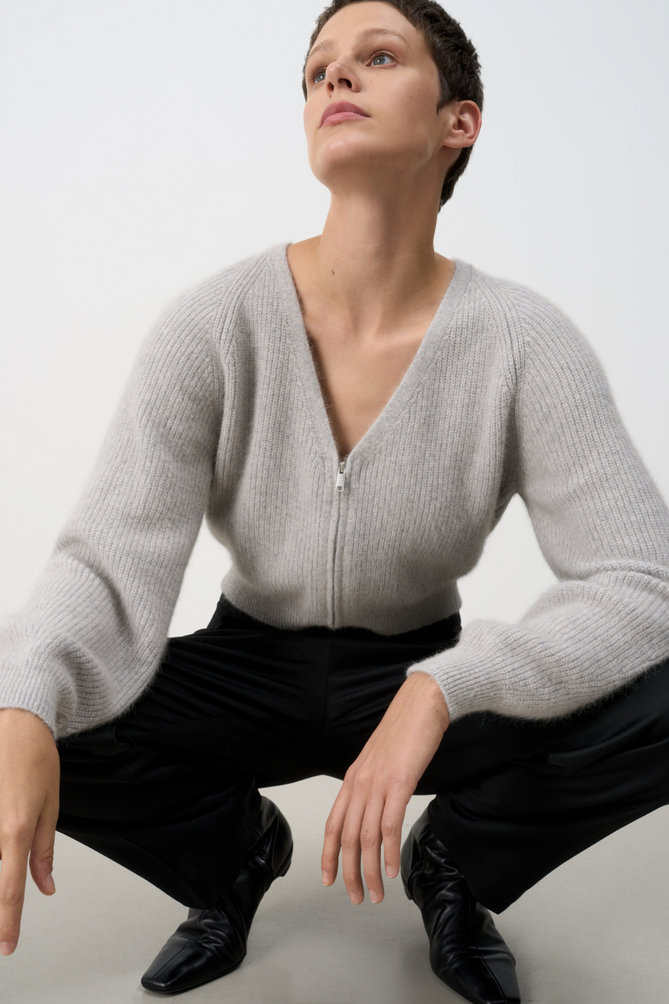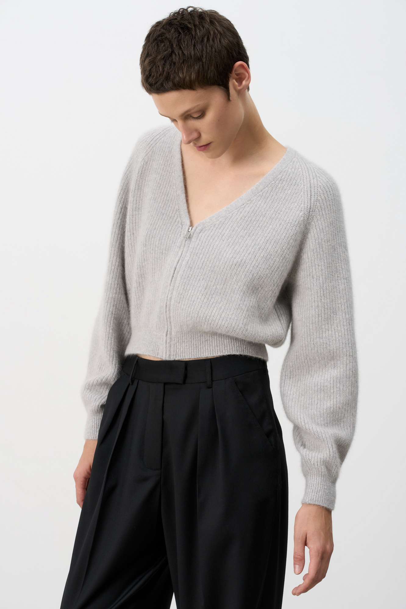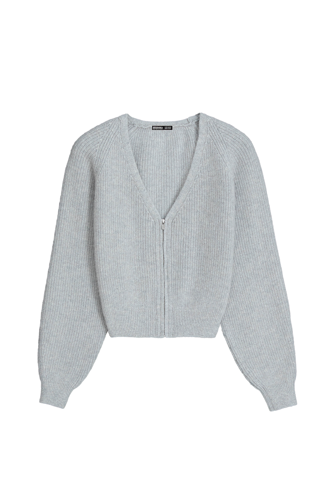 Укороченный кардиган на молнии с V-образным вырезом. Содержание в пряже 40% натурального пуха лисы делает изделие теплым, мягким и в тоже время очень легким.