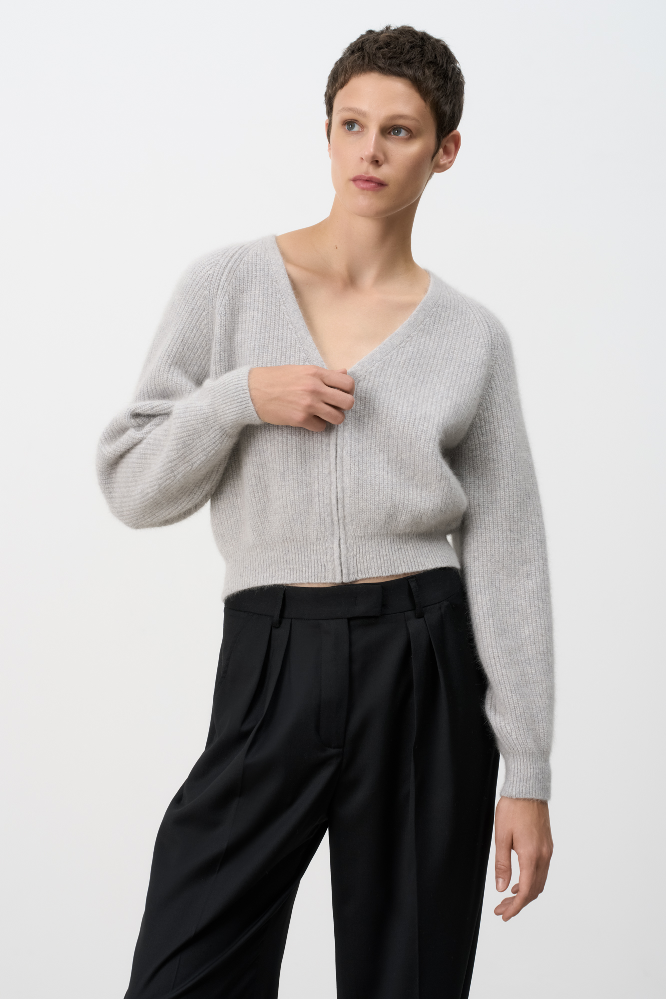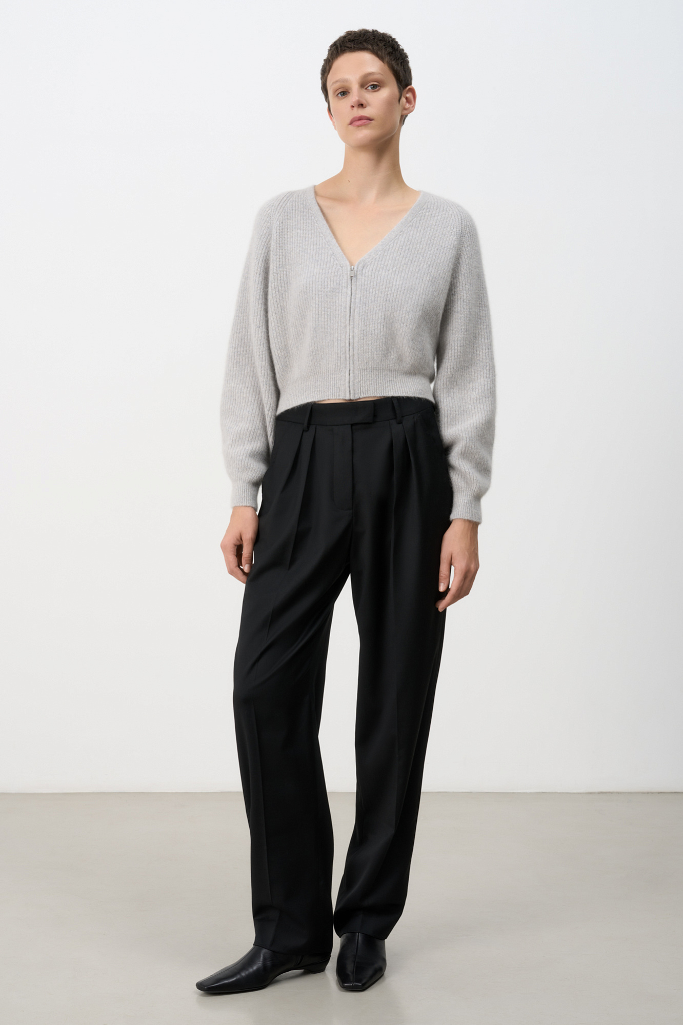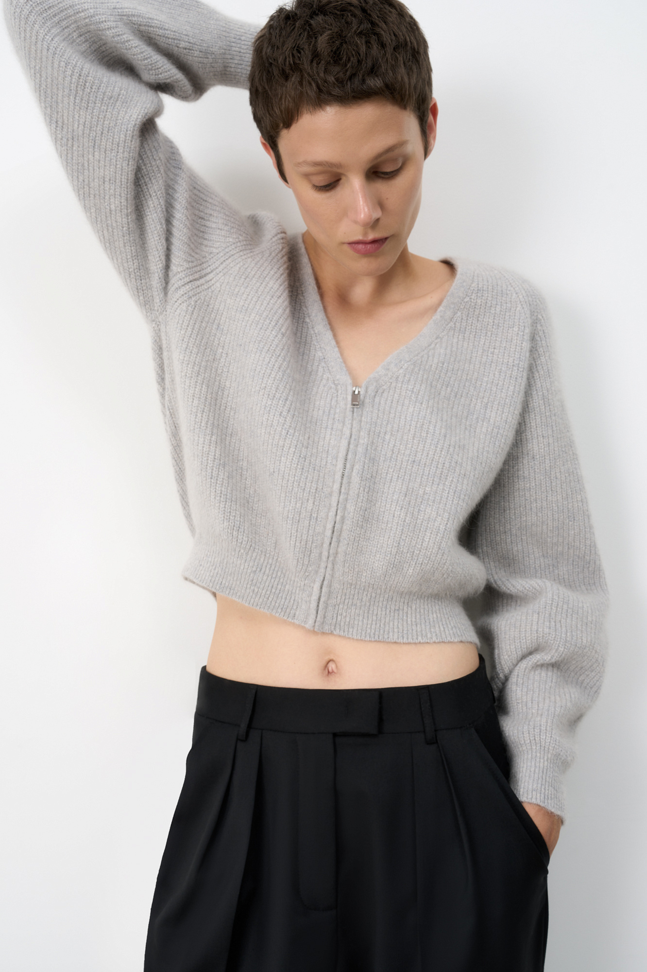 Укороченный кардиган на молнии с V-образным вырезом. Содержание в пряже 40% натурального пуха лисы делает изделие теплым, мягким и в тоже время очень легким.