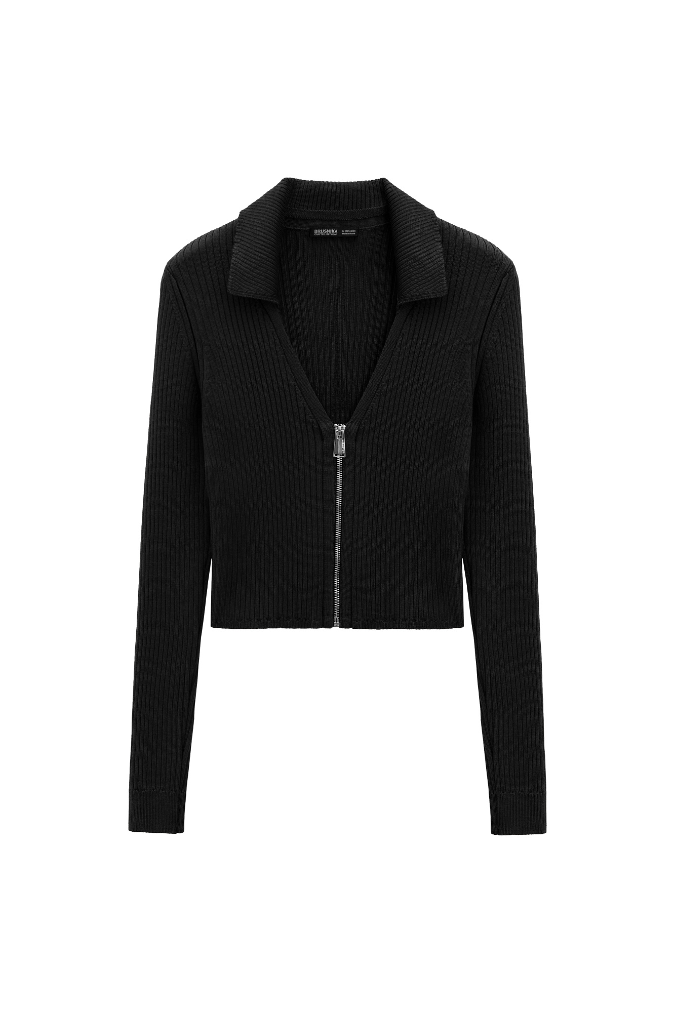 Укороченный кардиган на молнии. Модель приталенного силуэта с отложным воротником и застежкой на молнию.