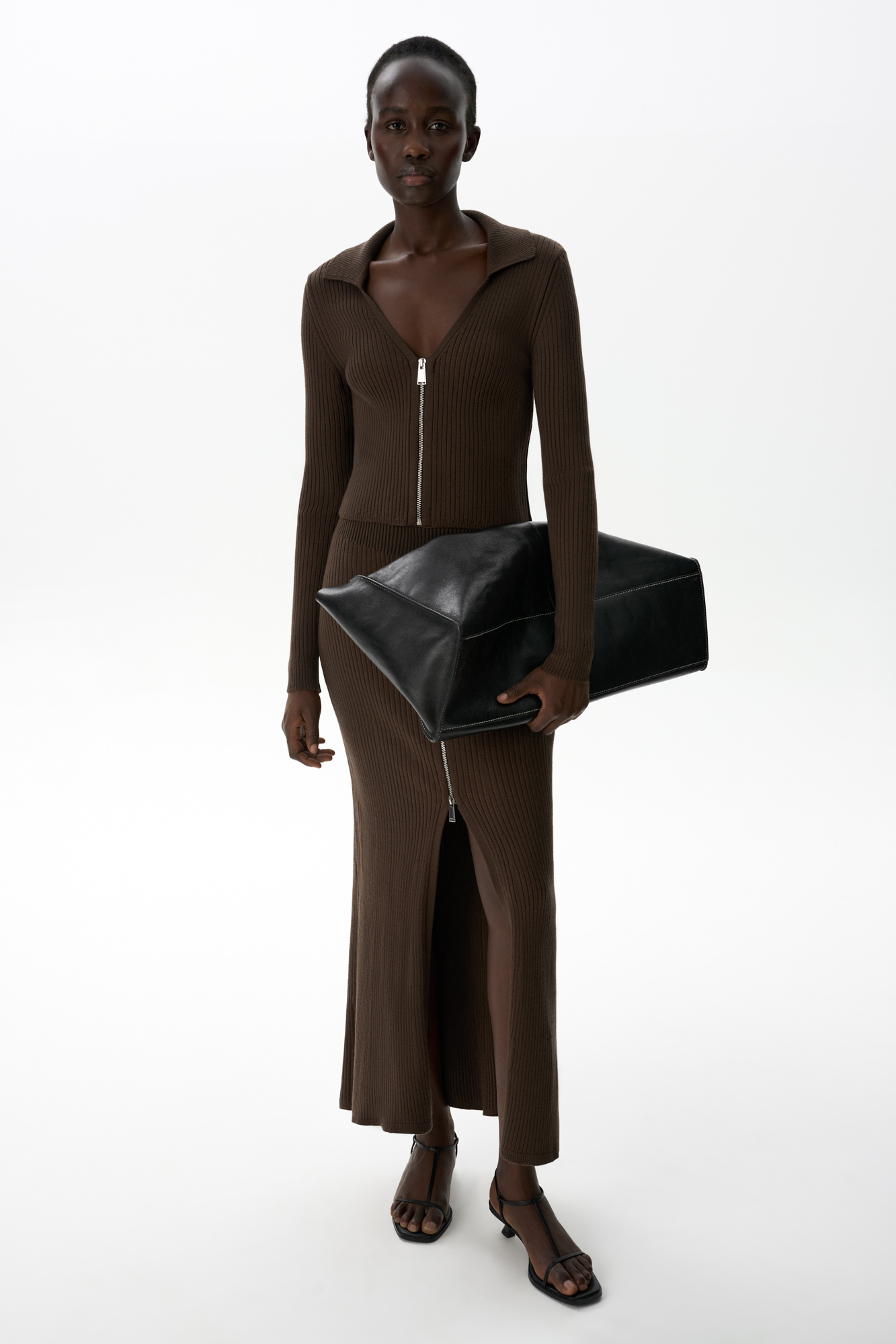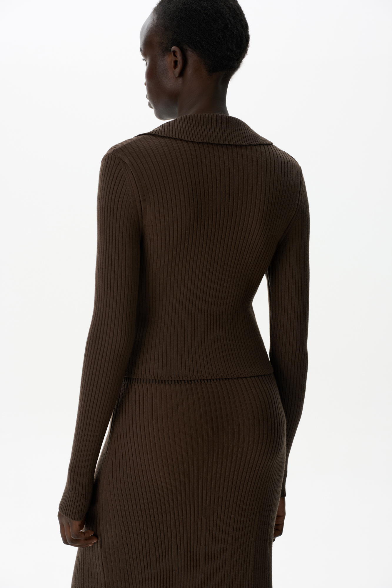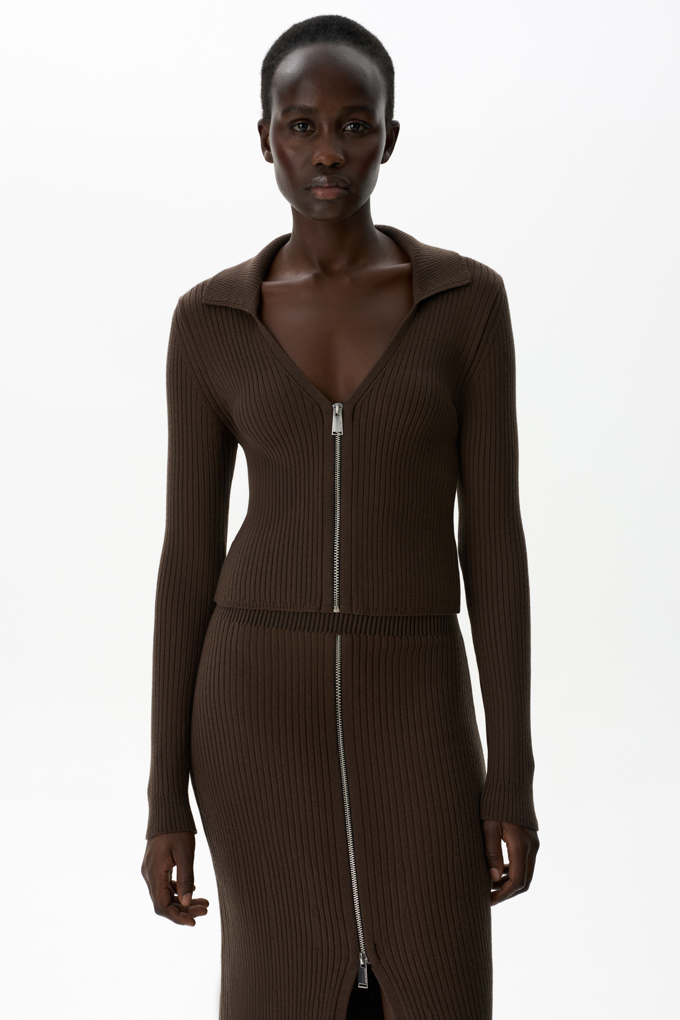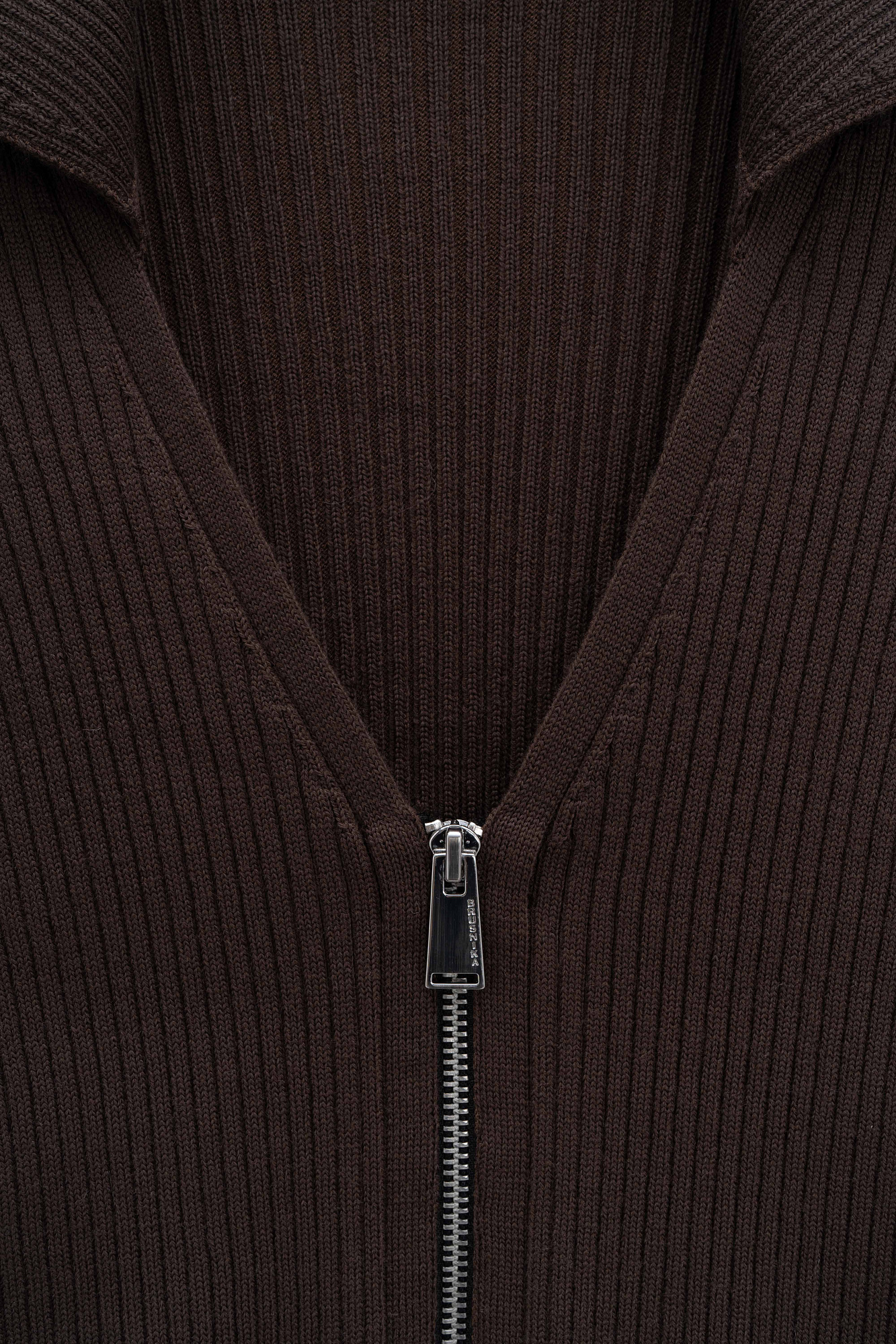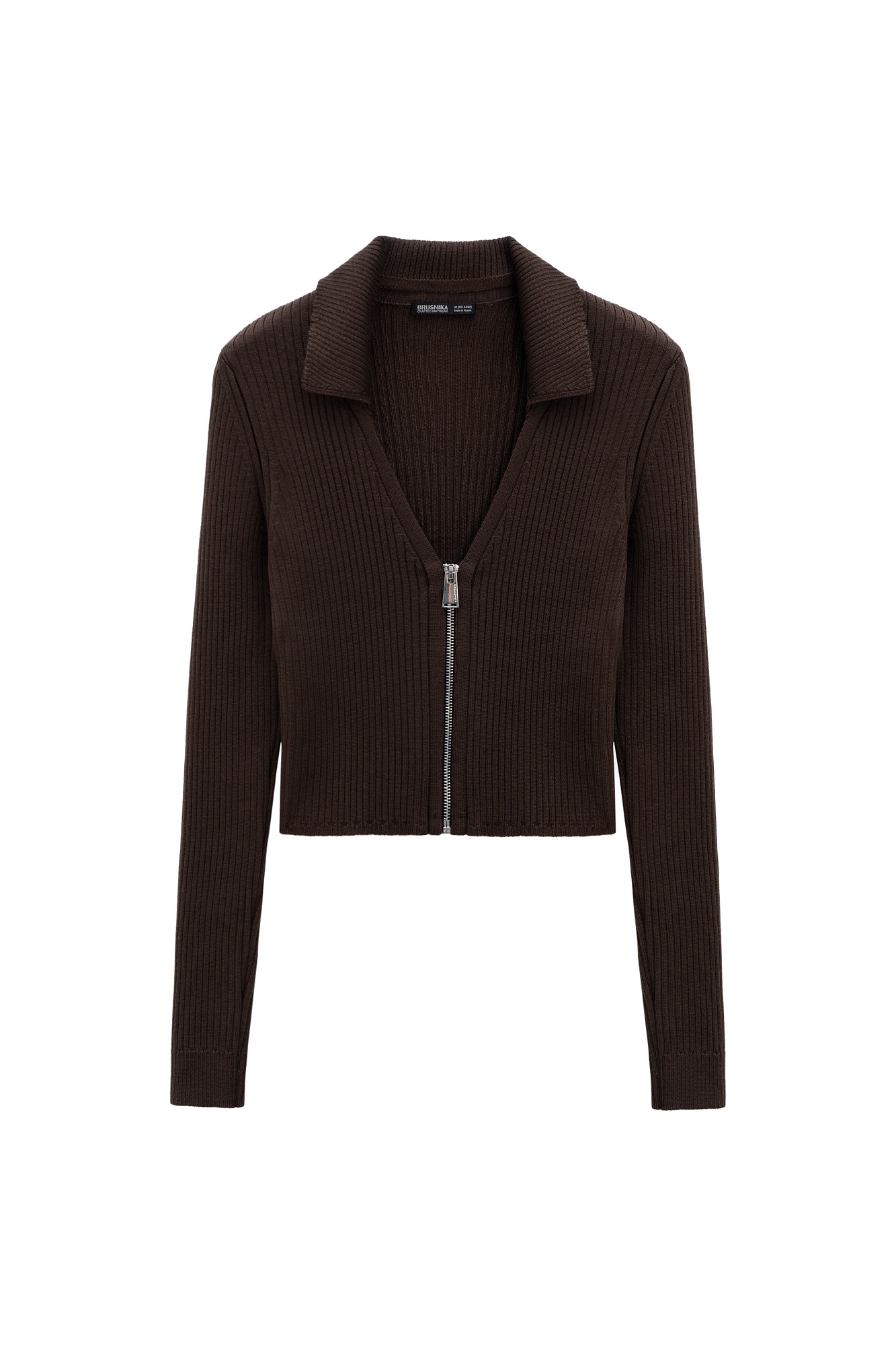 Укороченный кардиган на молнии. Модель приталенного силуэта с отложным воротником и застежкой на молнию.