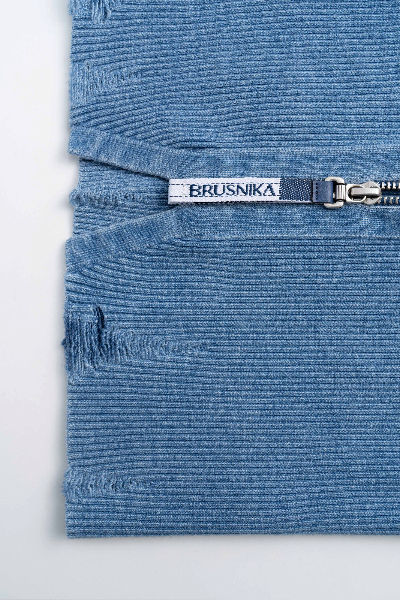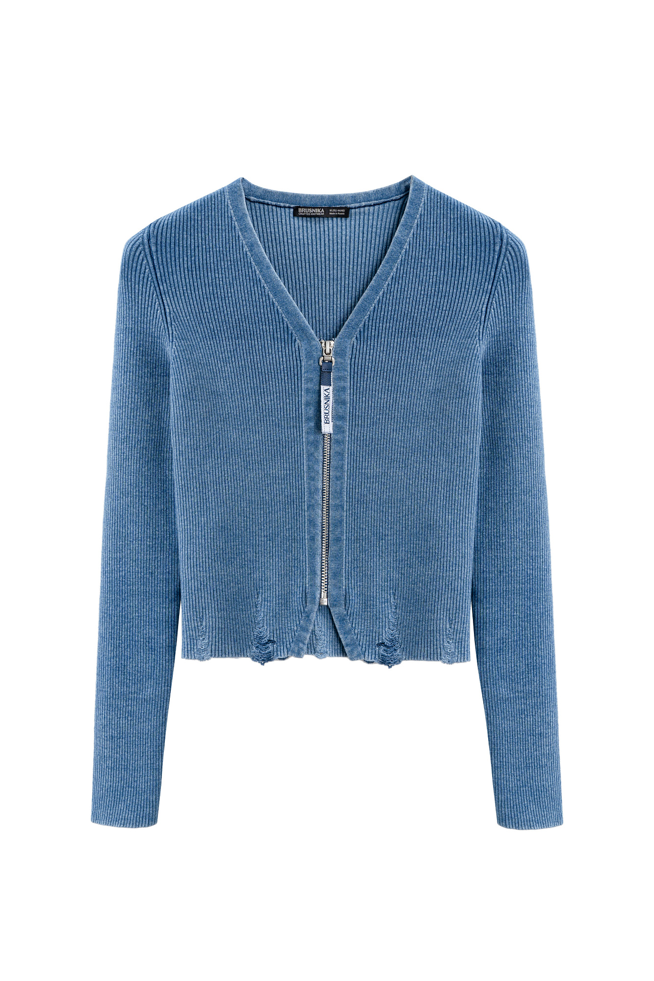 Трикотажный кардиган из хлопка с добавлением эластана. Модель приталенного силуэта, с длинным рукавом и V-образным вырезом горловины. Застежка на молнию. Изделие декорировано рванью и потертостями по нижнему краю. Цвет имитирует вареную джинсу.