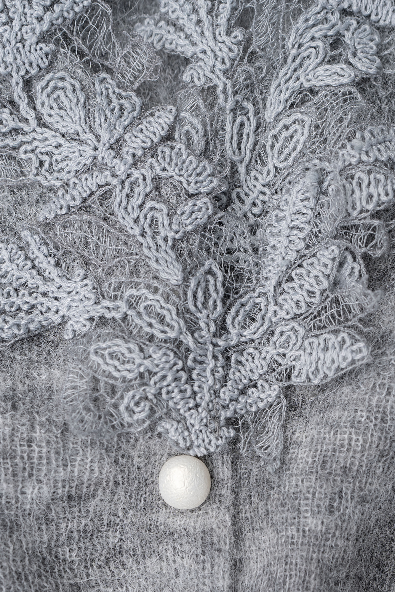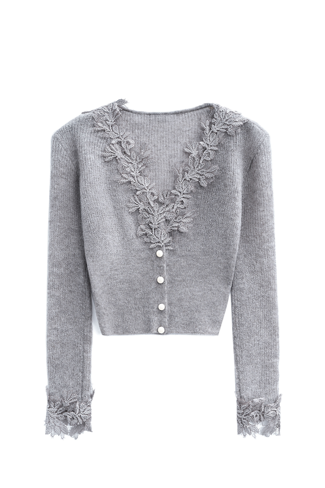 Короткий трикотажный кардиган из тонкой шерсти мериноса экстрафайн и альпака экстрафайн. Модель по фигуре с глубоким V-образным вырезом. Застежка на маленькие жемчужные пуговицы. Изделие декорировано тонким кружевом.