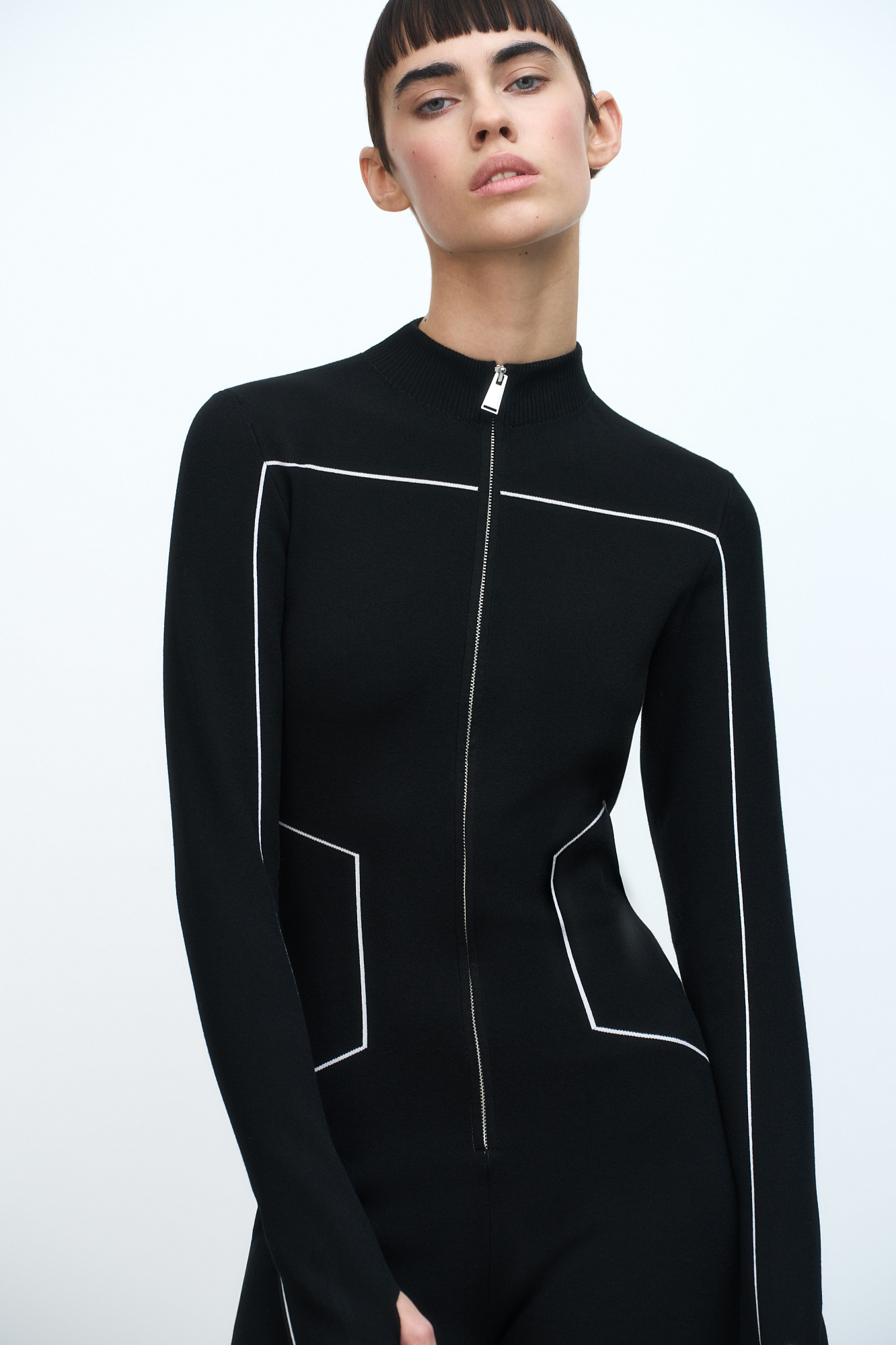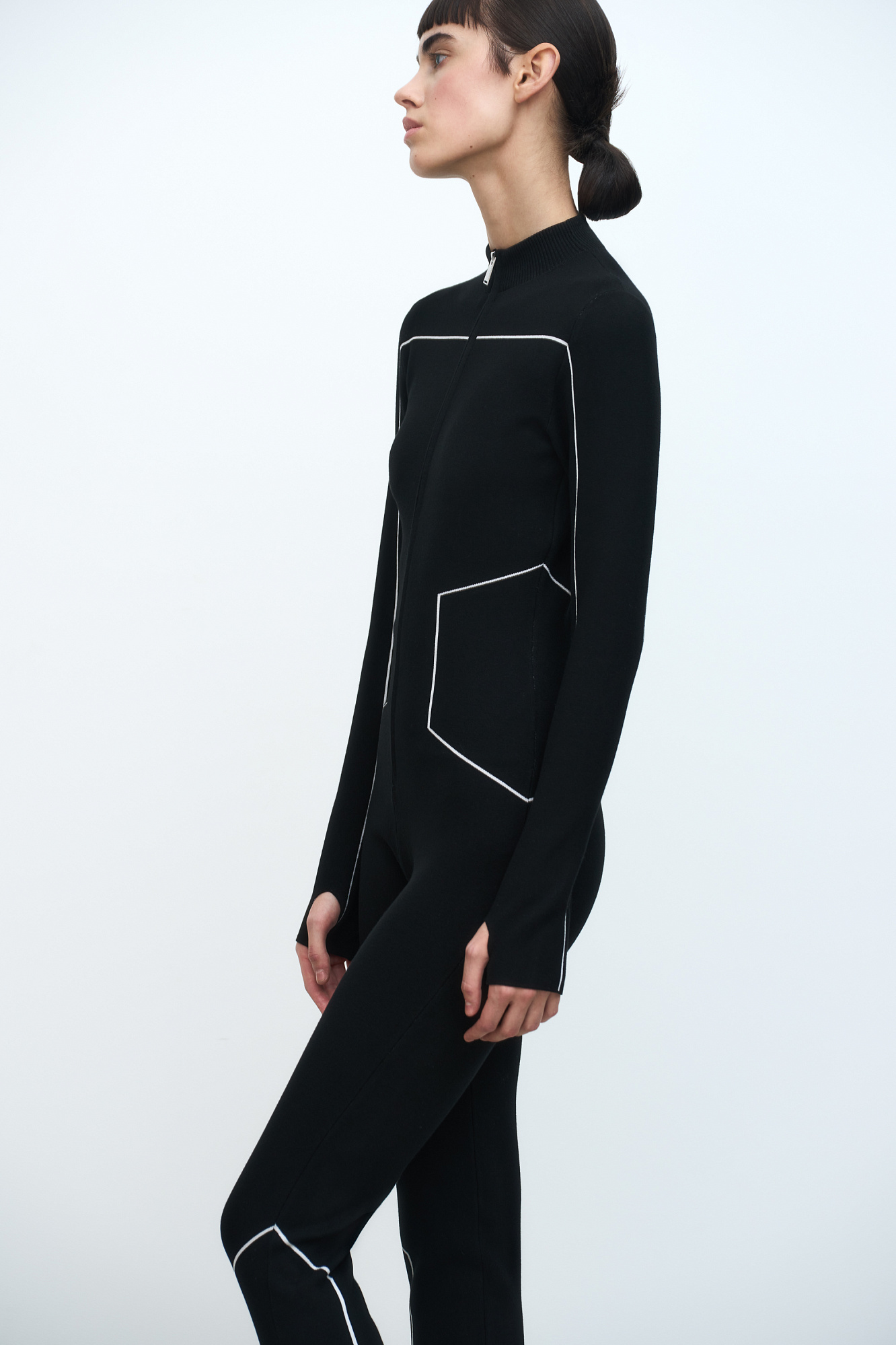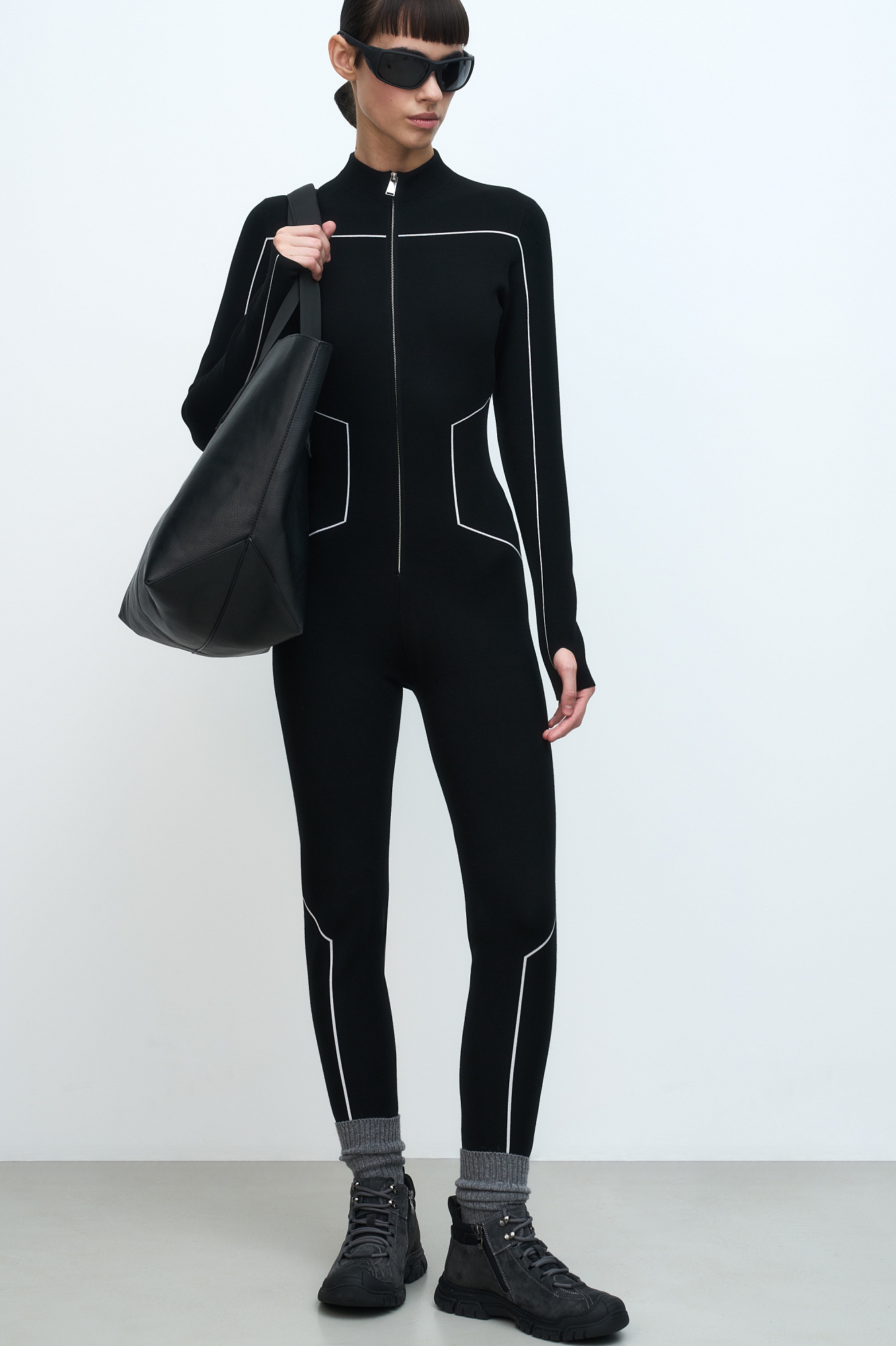 Трикотажный комбинезон из вискозы. Модель приталенного силуэта с застежкой на молнию и контрастными полосами.