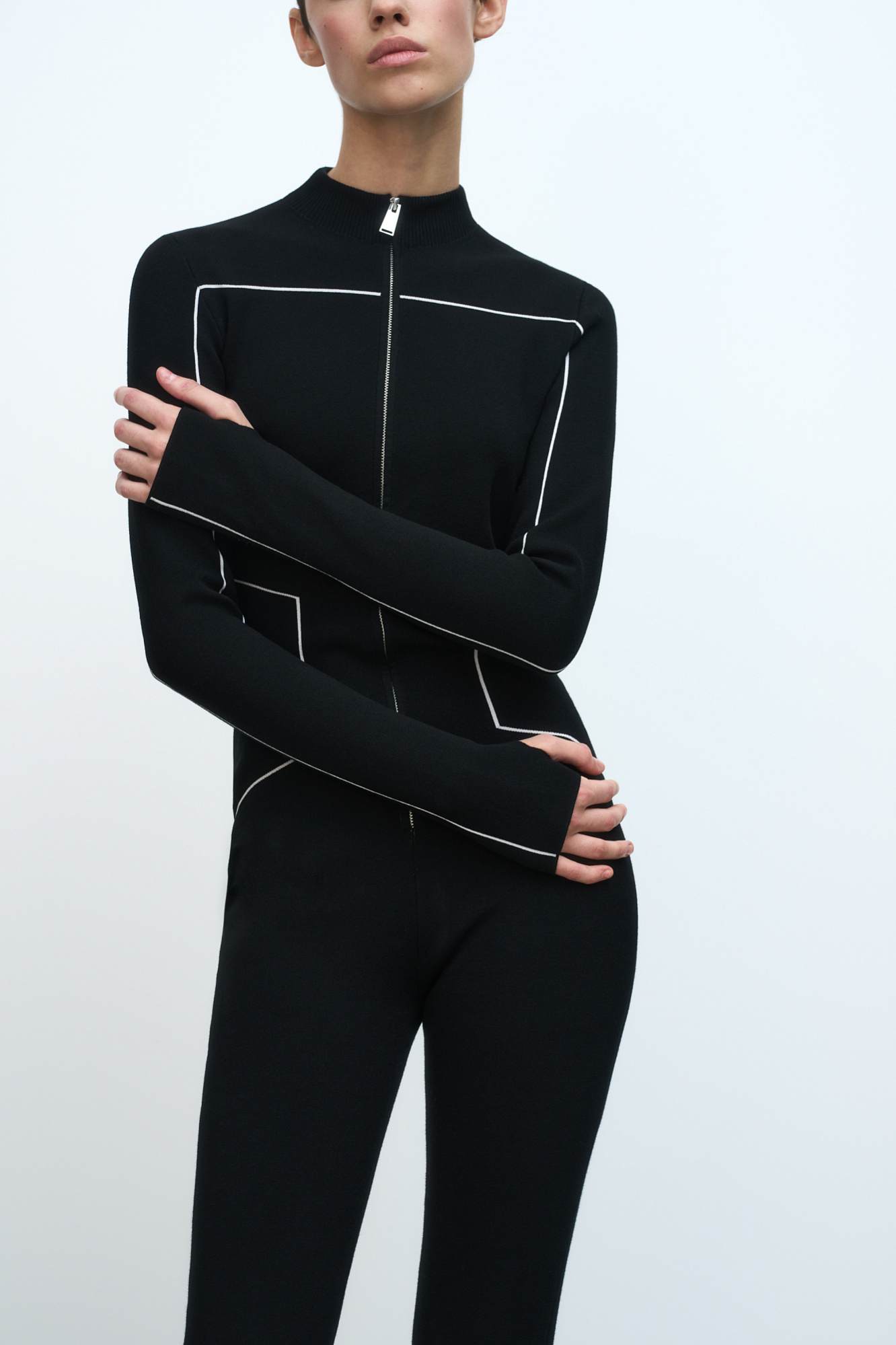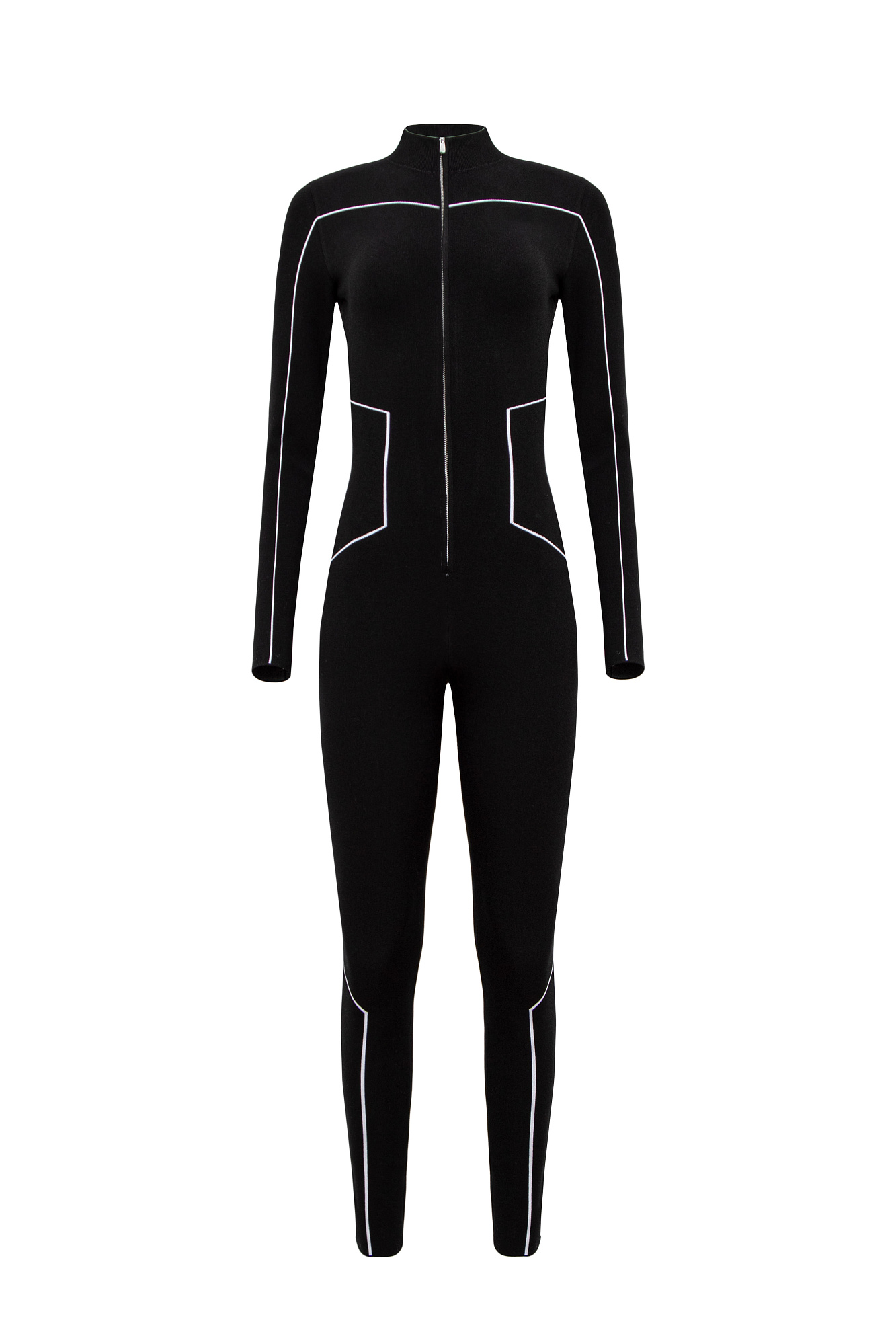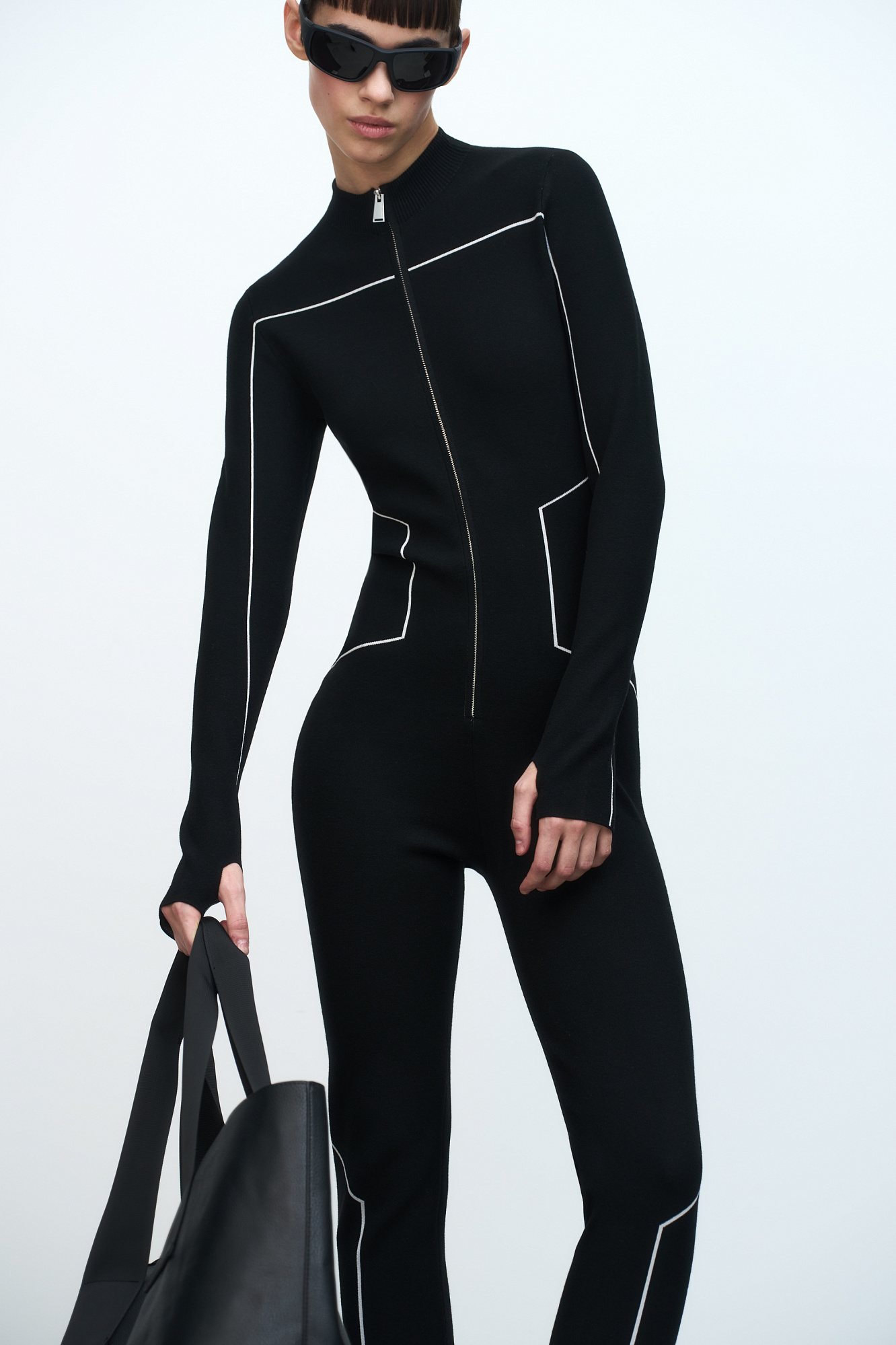 Трикотажный комбинезон из вискозы. Модель приталенного силуэта с застежкой на молнию и контрастными полосами.