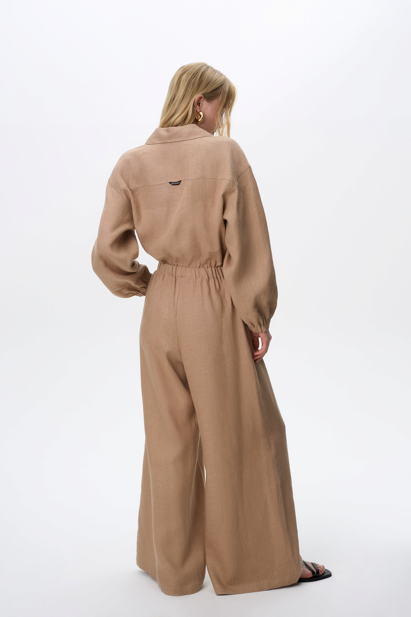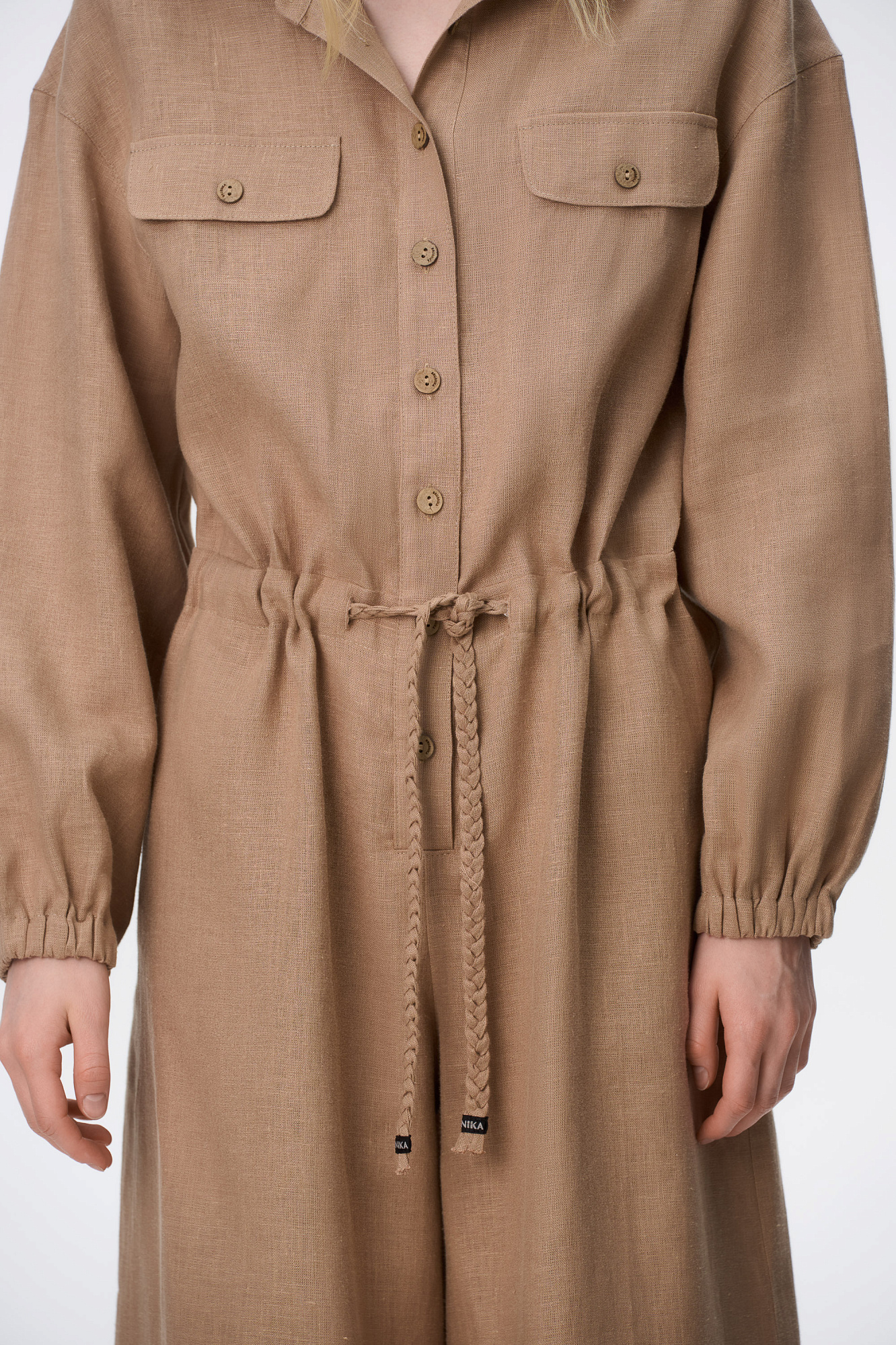 Комбинезон из 100% льна с накладными карманами на груди, длинным рукавом. Застежка на пуговицы.