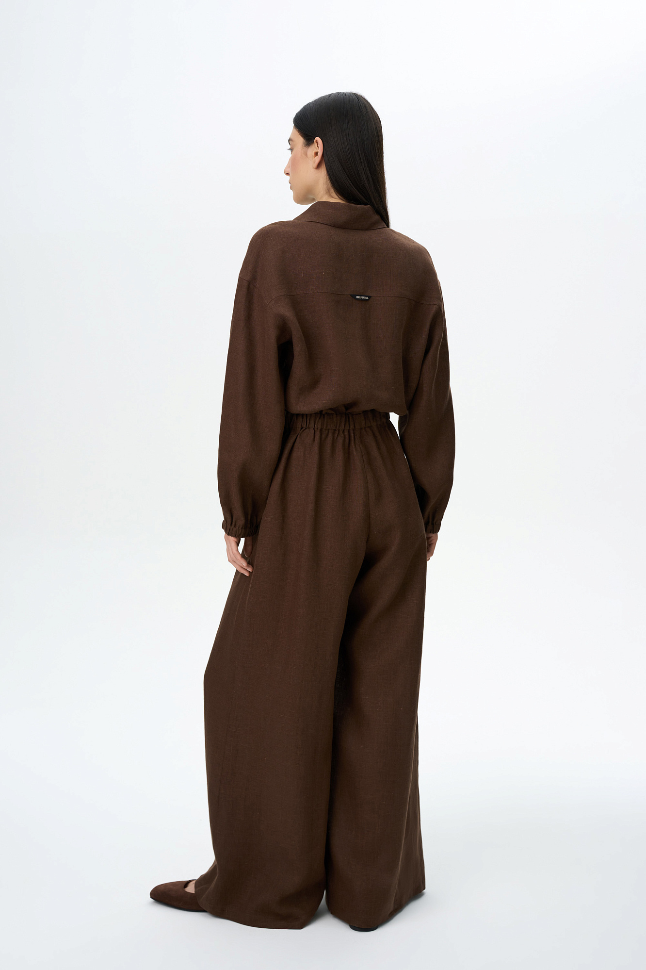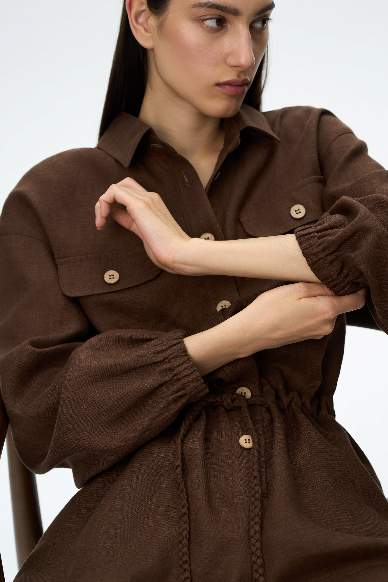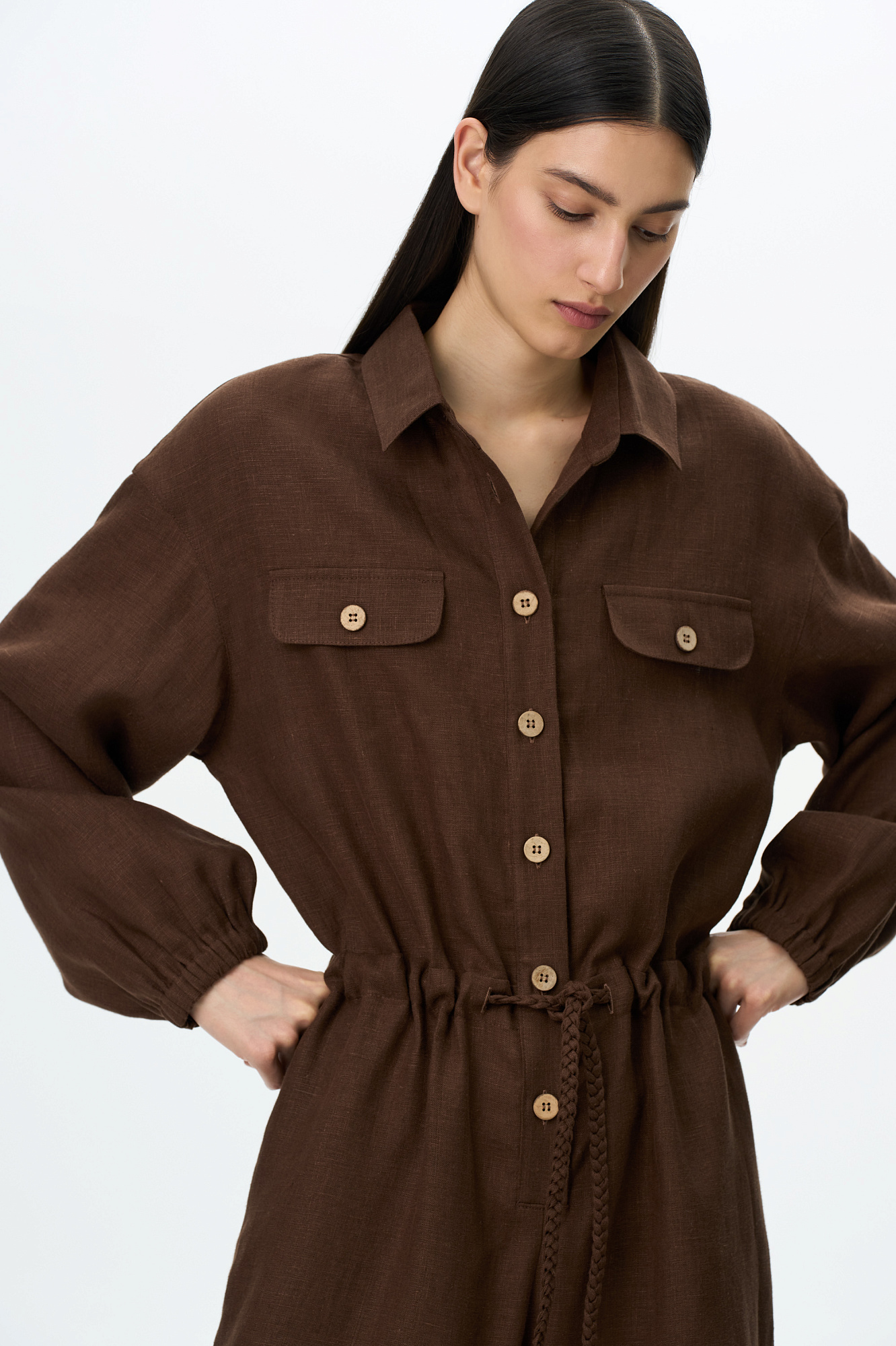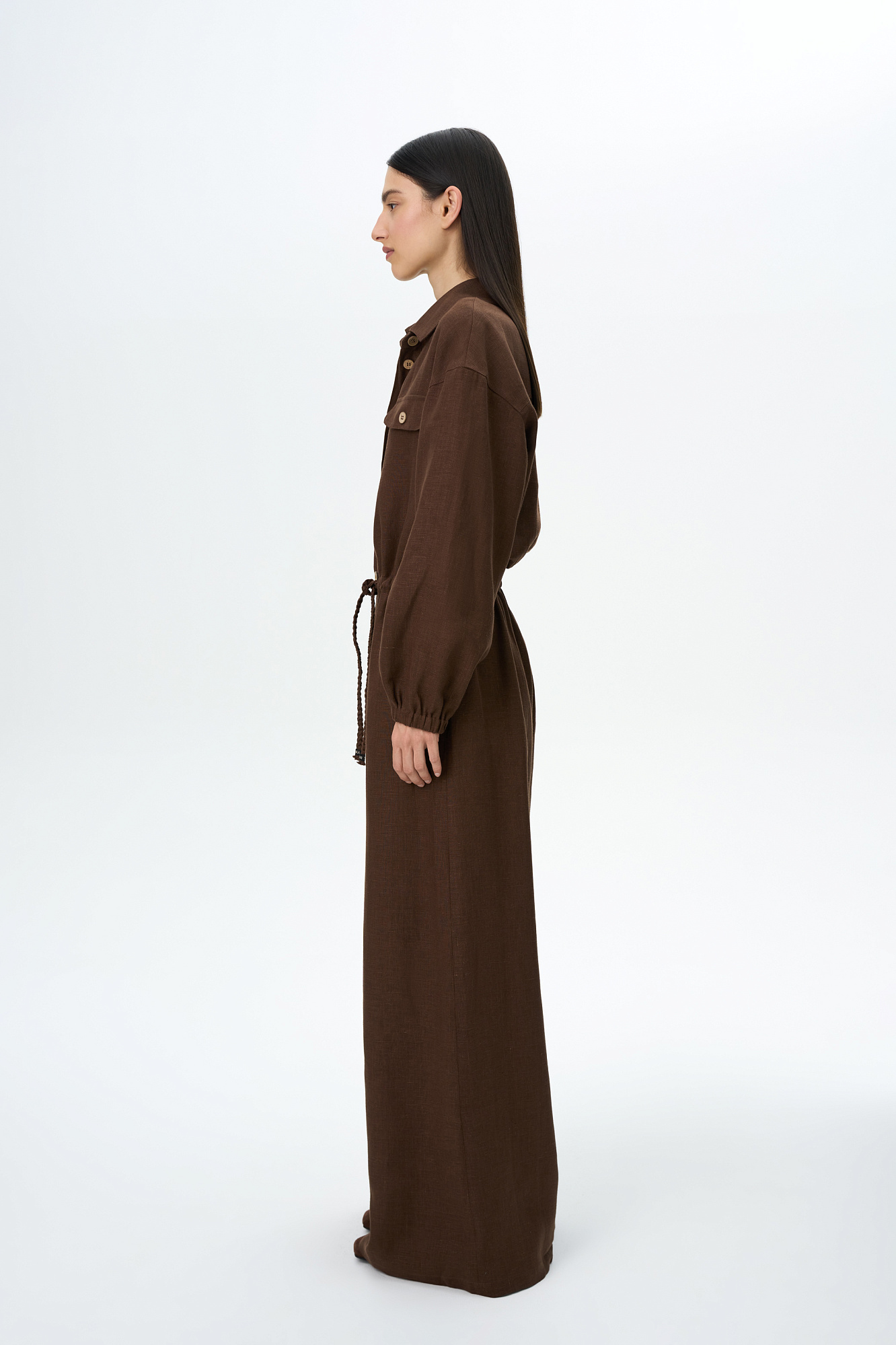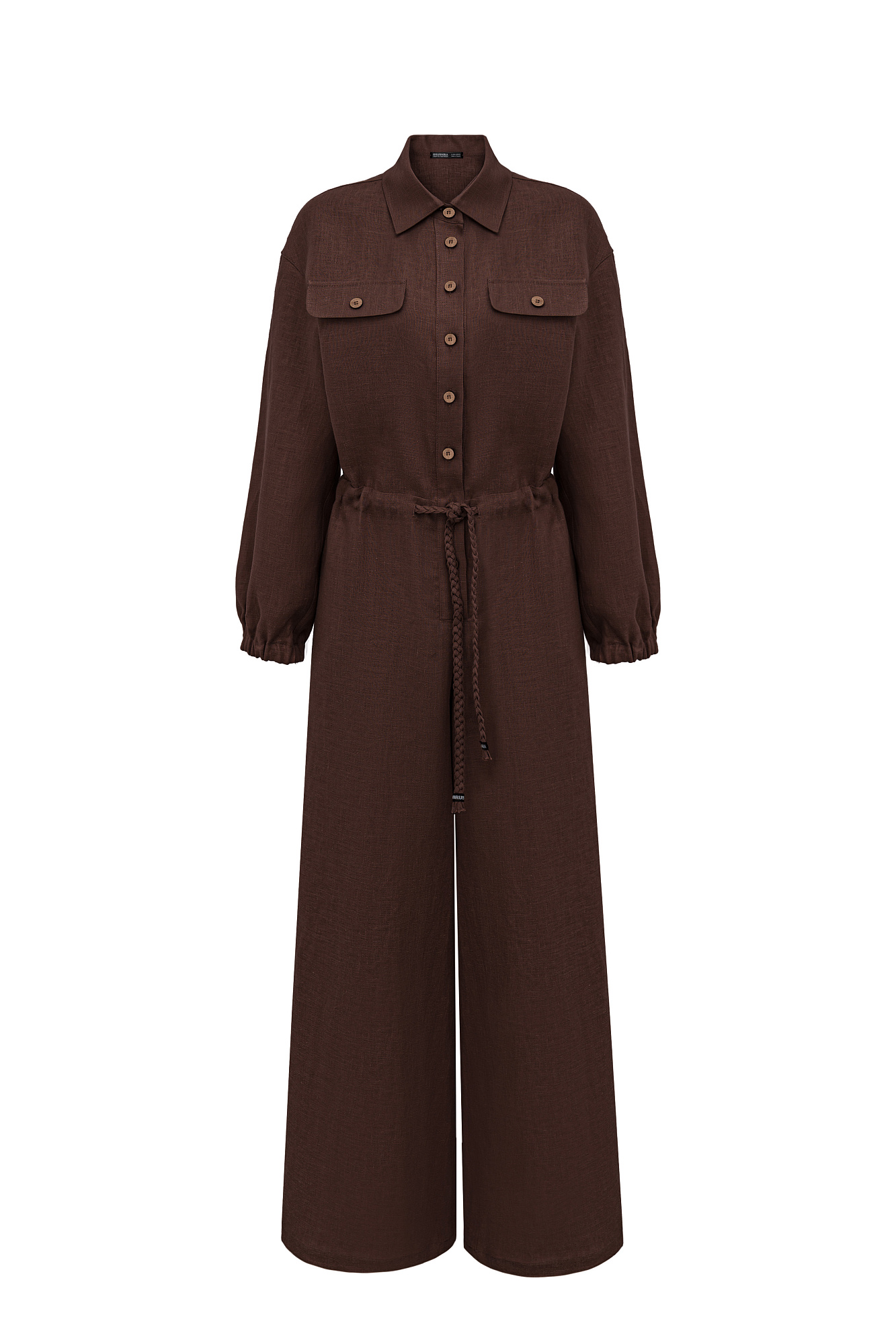 Комбинезон из 100% льна с накладными карманами на груди, длинным рукавом. Застежка на пуговицы.
