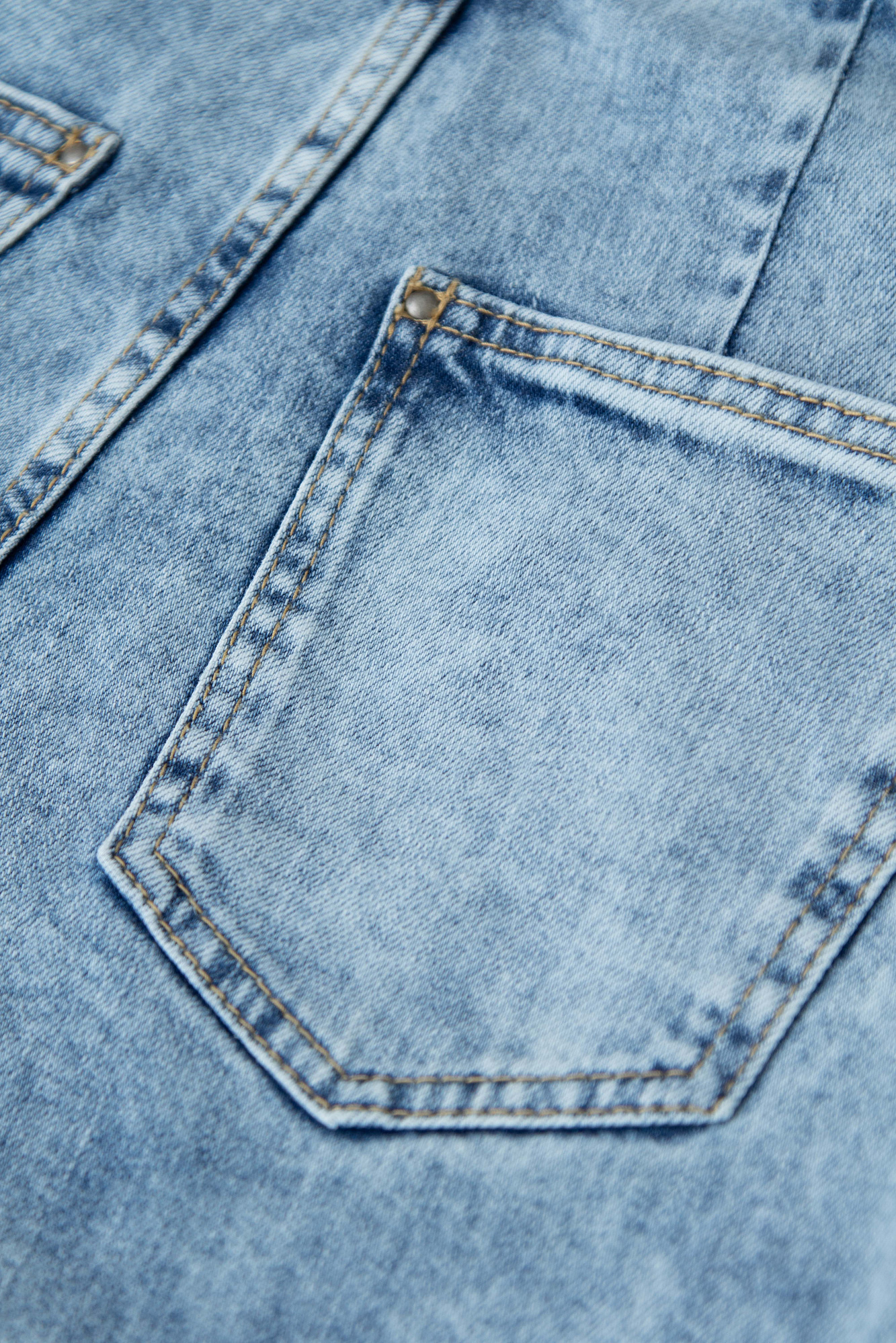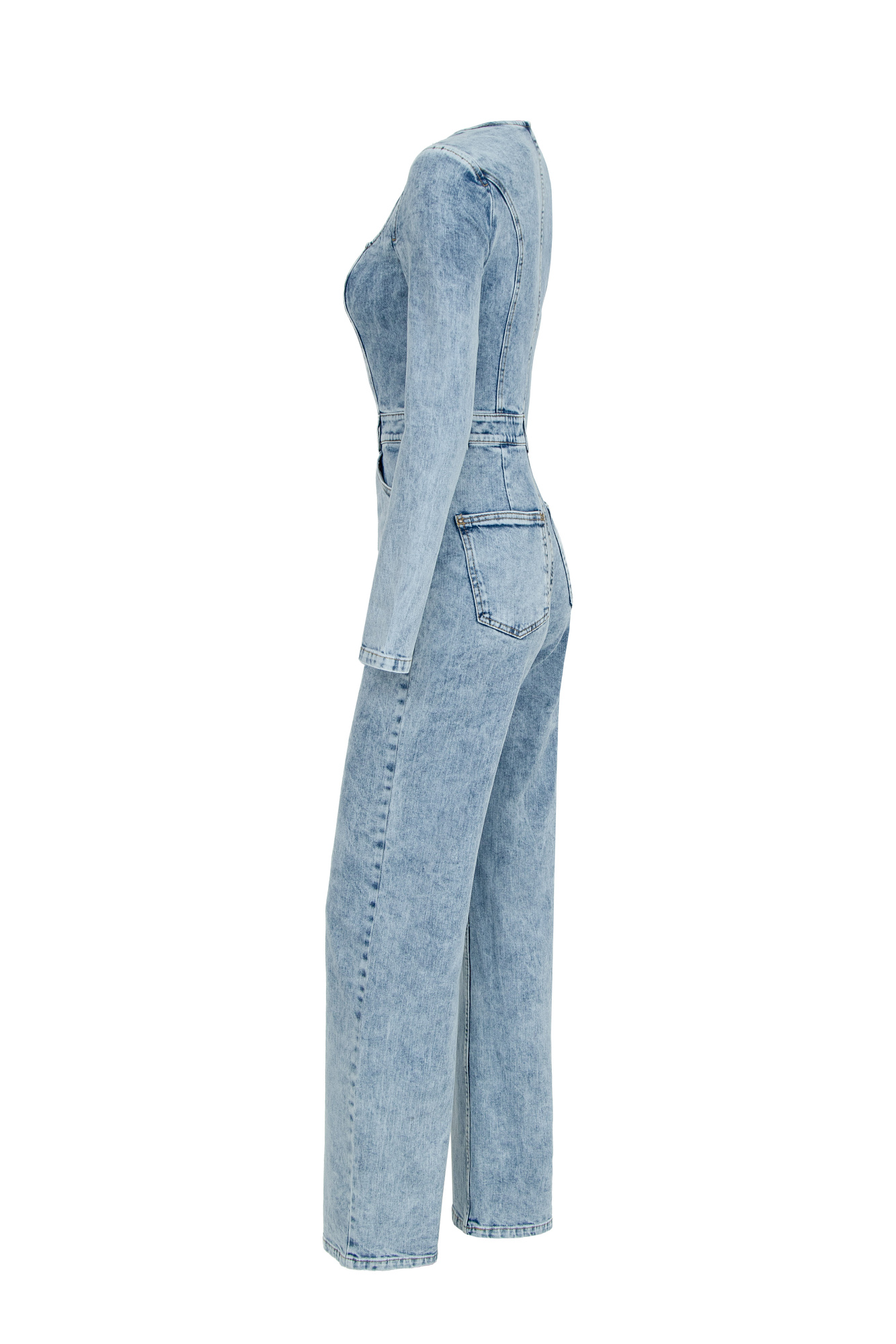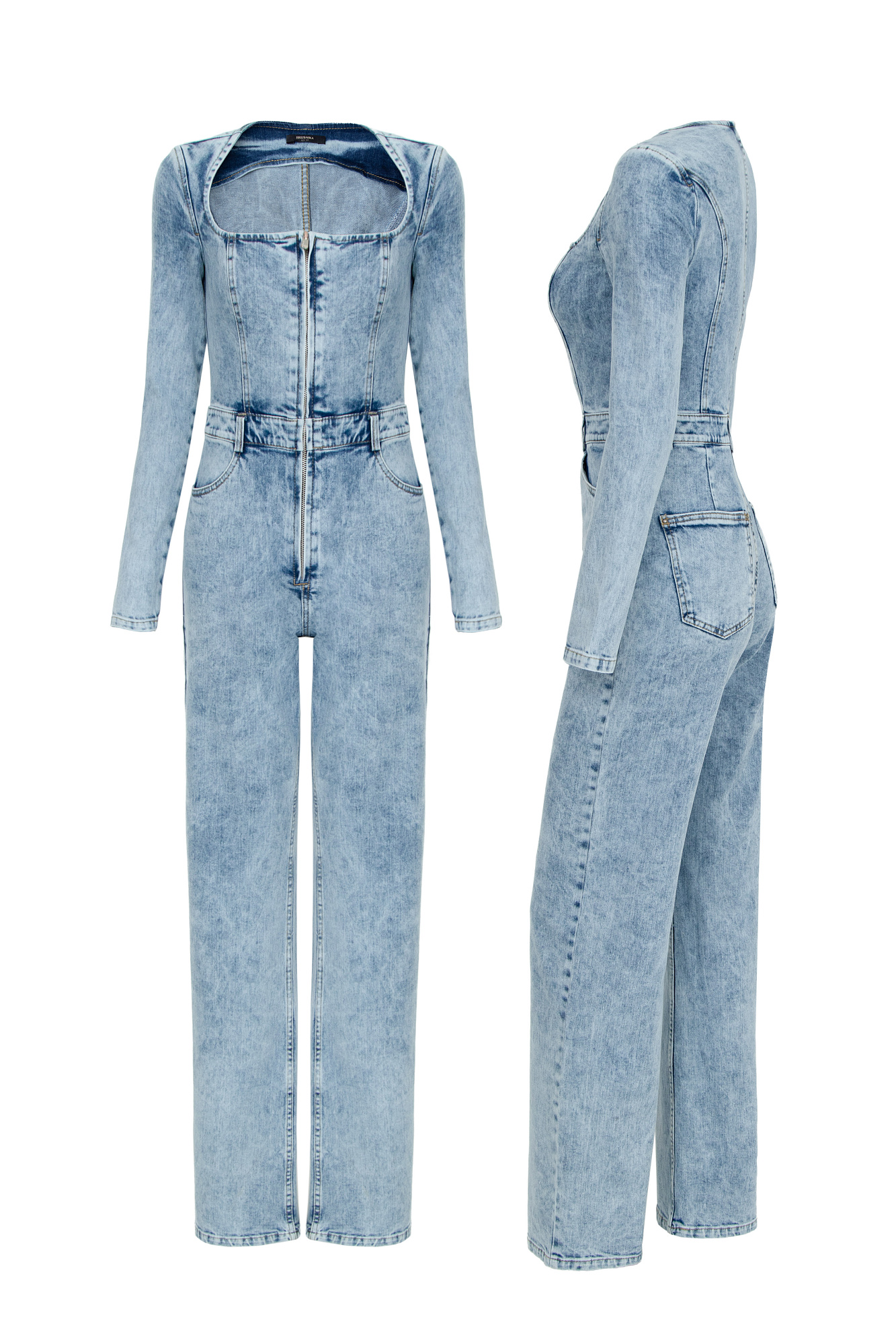 Джинсовый комбинезон с длинным рукавом. Модель приталенного силуэта с застежкой на молнию.