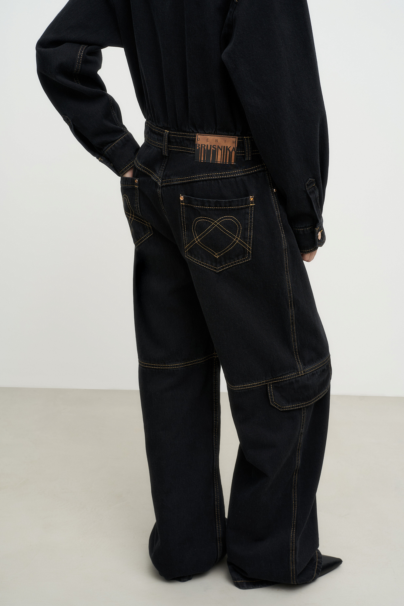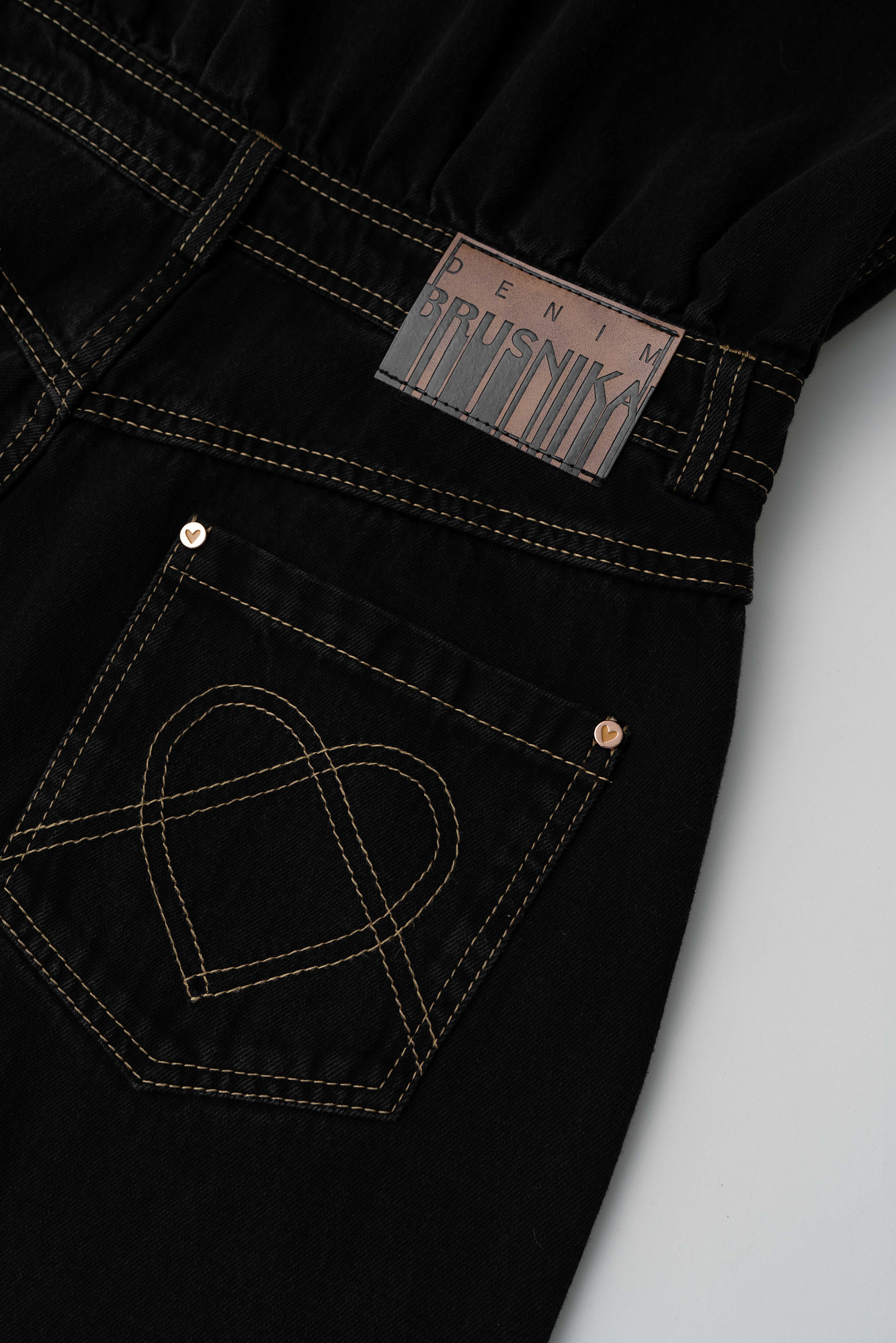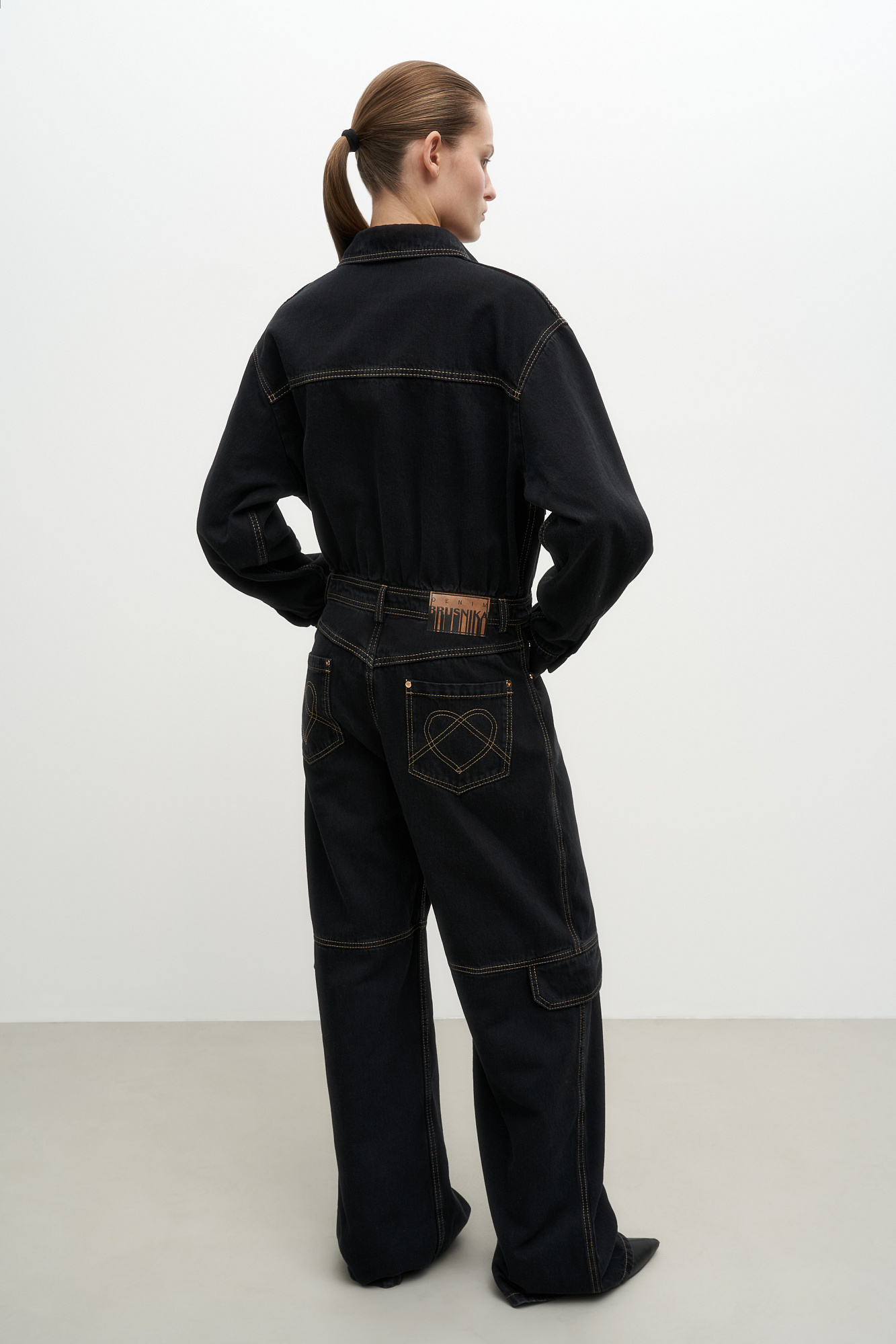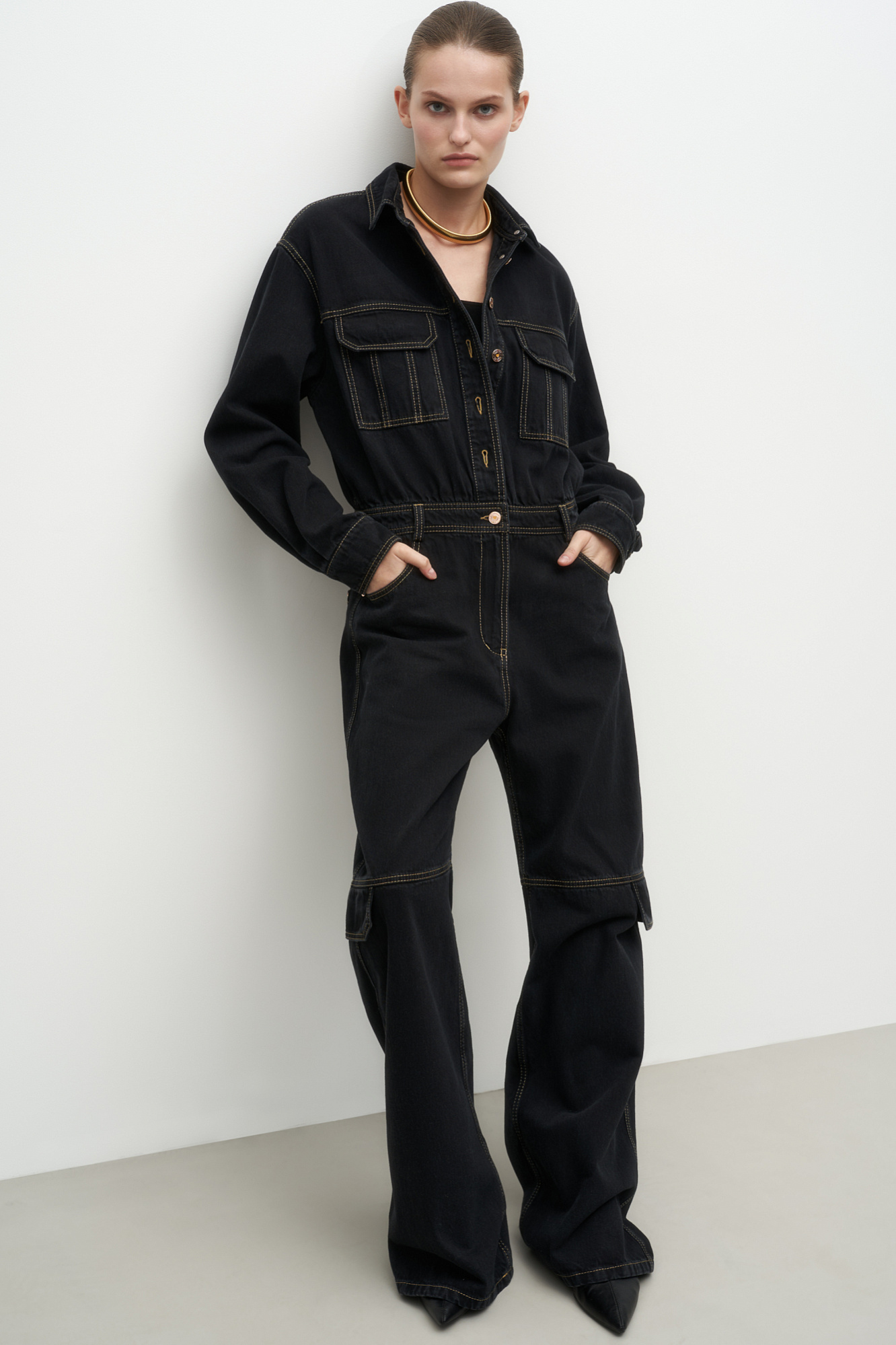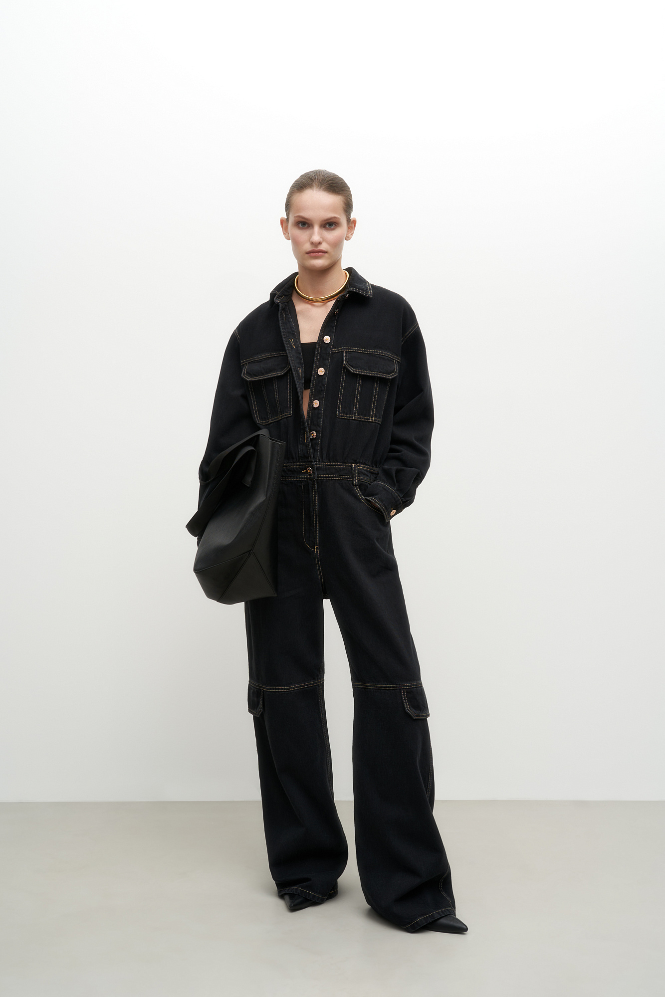 Джинсовый комбинезон из денима. Длинные рукава с манжетами. Отложной воротник. Передние накладные карманы на груди, боковые карманы и накладные карманы сзади. На поясе штрипки под ремень. Застежка на молнию и металлические пуговицы.
