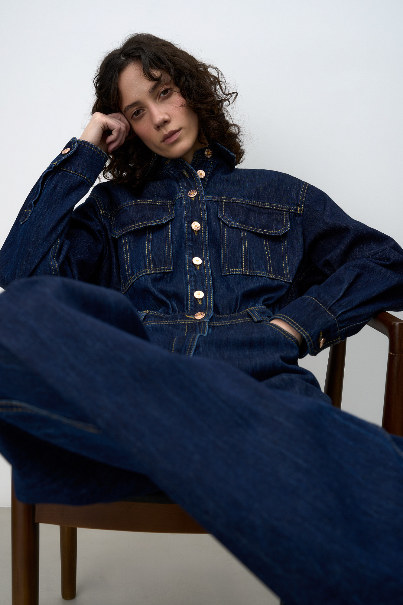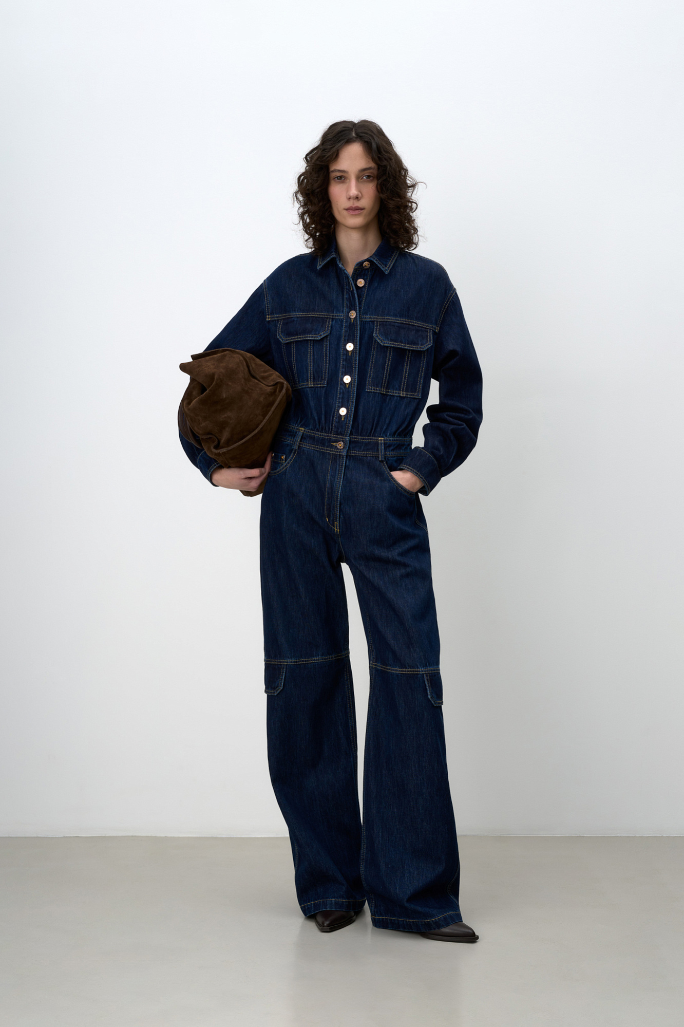 Джинсовый комбинезон из денима. Длинные рукава с манжетами. Отложной воротник. Передние накладные карманы на груди, боковые карманы и накладные карманы сзади. На поясе штрипки под ремень. Застежка на молнию и металлические пуговицы.