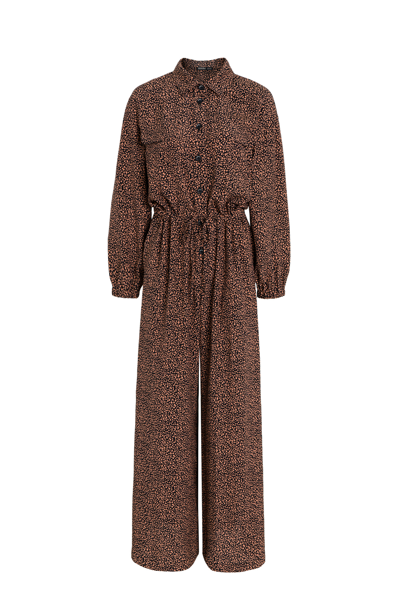 Принтованный комбинезон из 100% вискозы с поясом и застежкой на пуговицы.