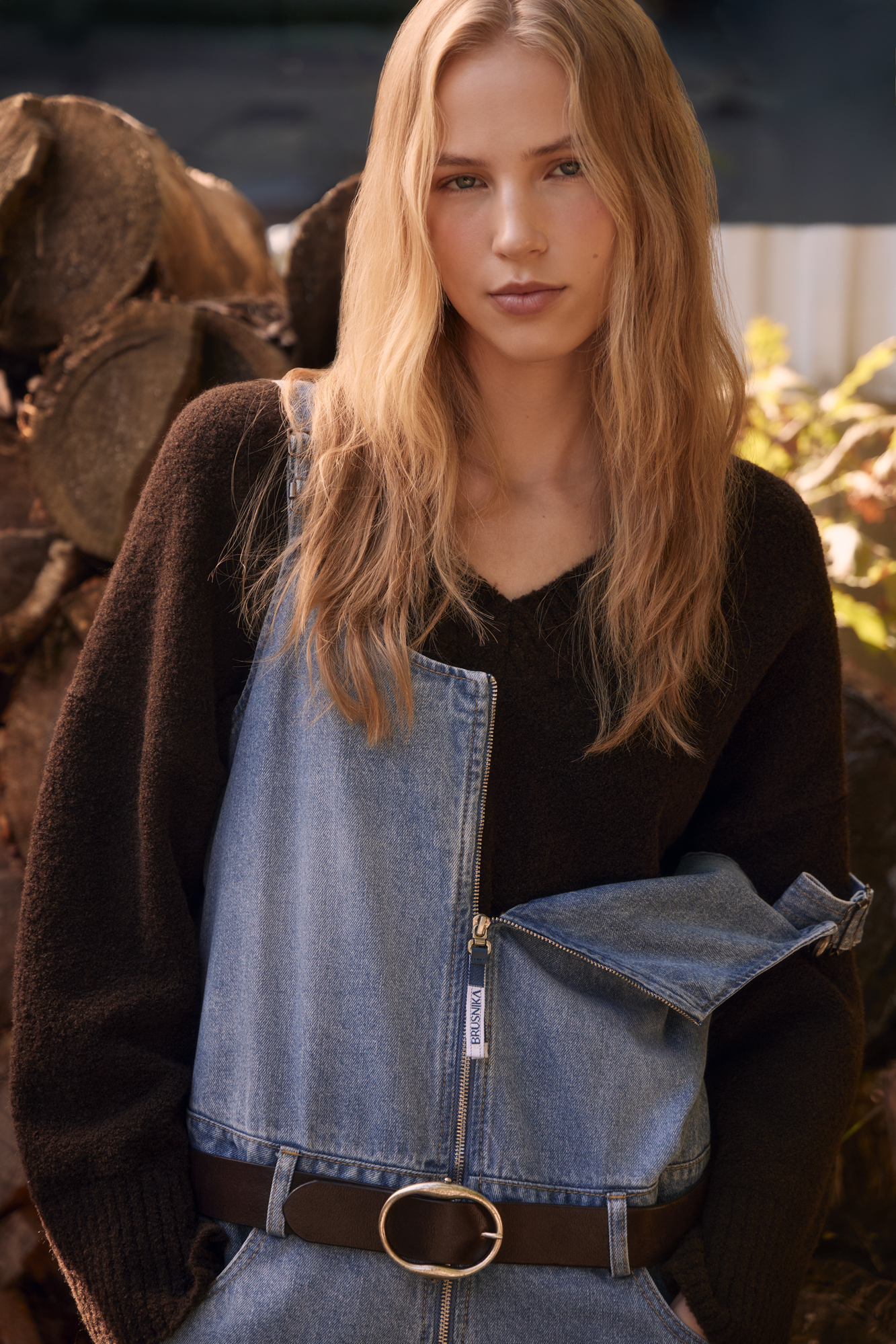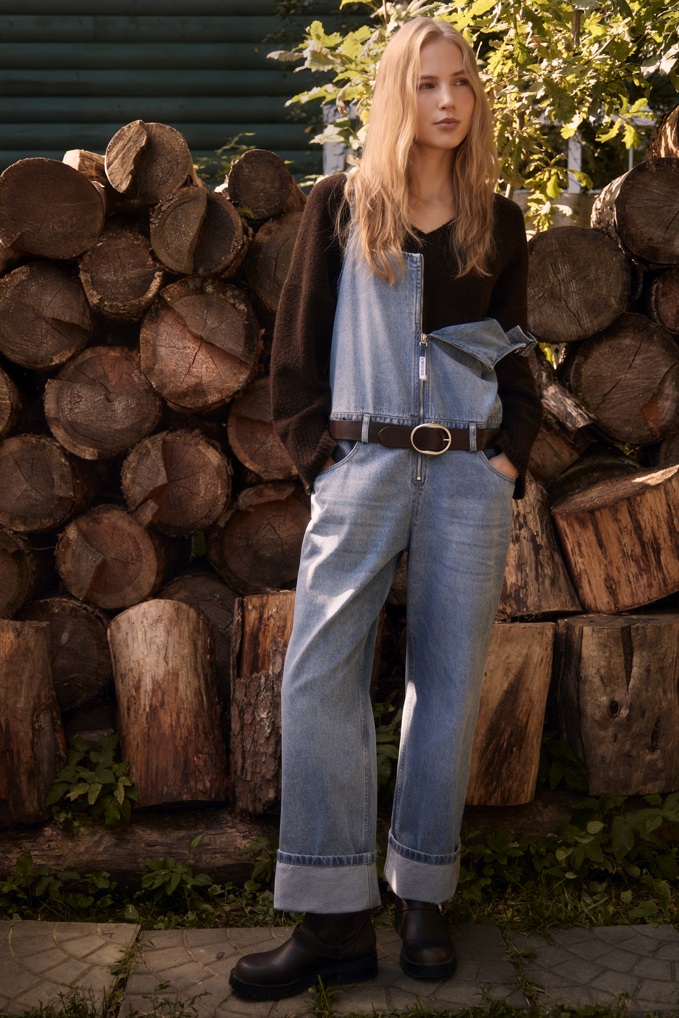 Джинсовый комбинезон из 100% хлопка. Модель свободного силуэта с широкими брюками, шлевками на поясе для ремня, боковыми и задними карманами. Верхняя часть комбинезона застегивается на молнию. Бретели регулируются по длине. Вышитый логотип бренда на груди.