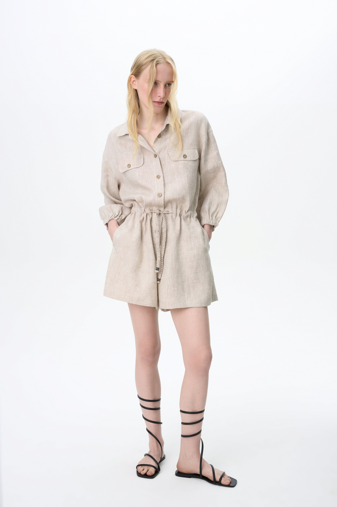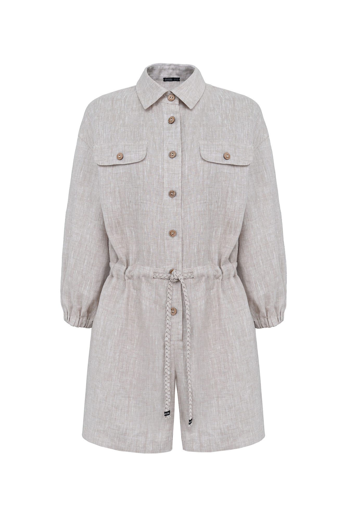 Комбинезон из 100% льна. Модель с рубашечным верхом, отложным воротником, накладными карманами на груди, длинными рукавами и застежкой на пуговицы. Регулируемая кулиска на поясе.