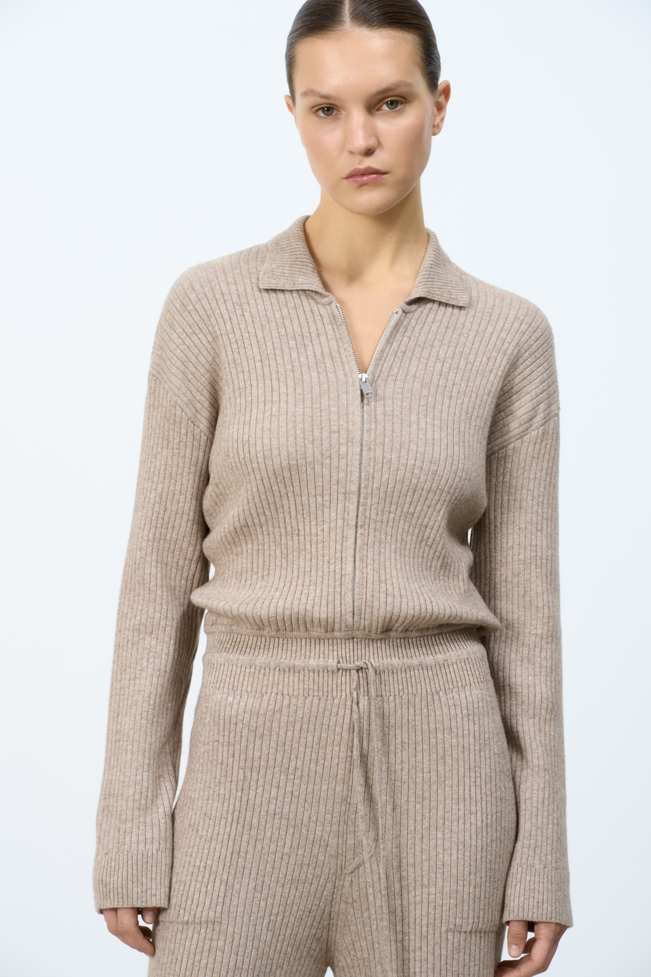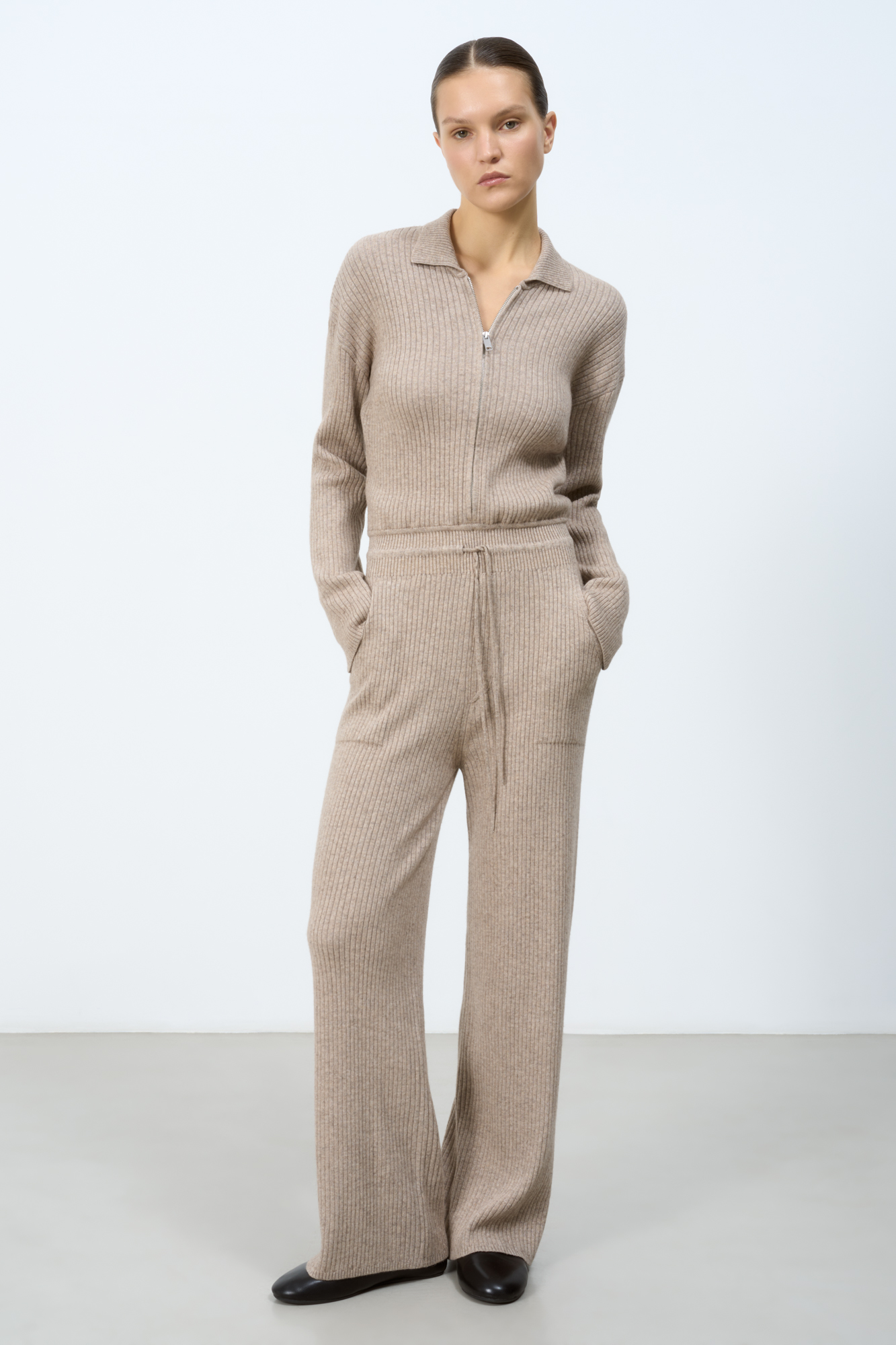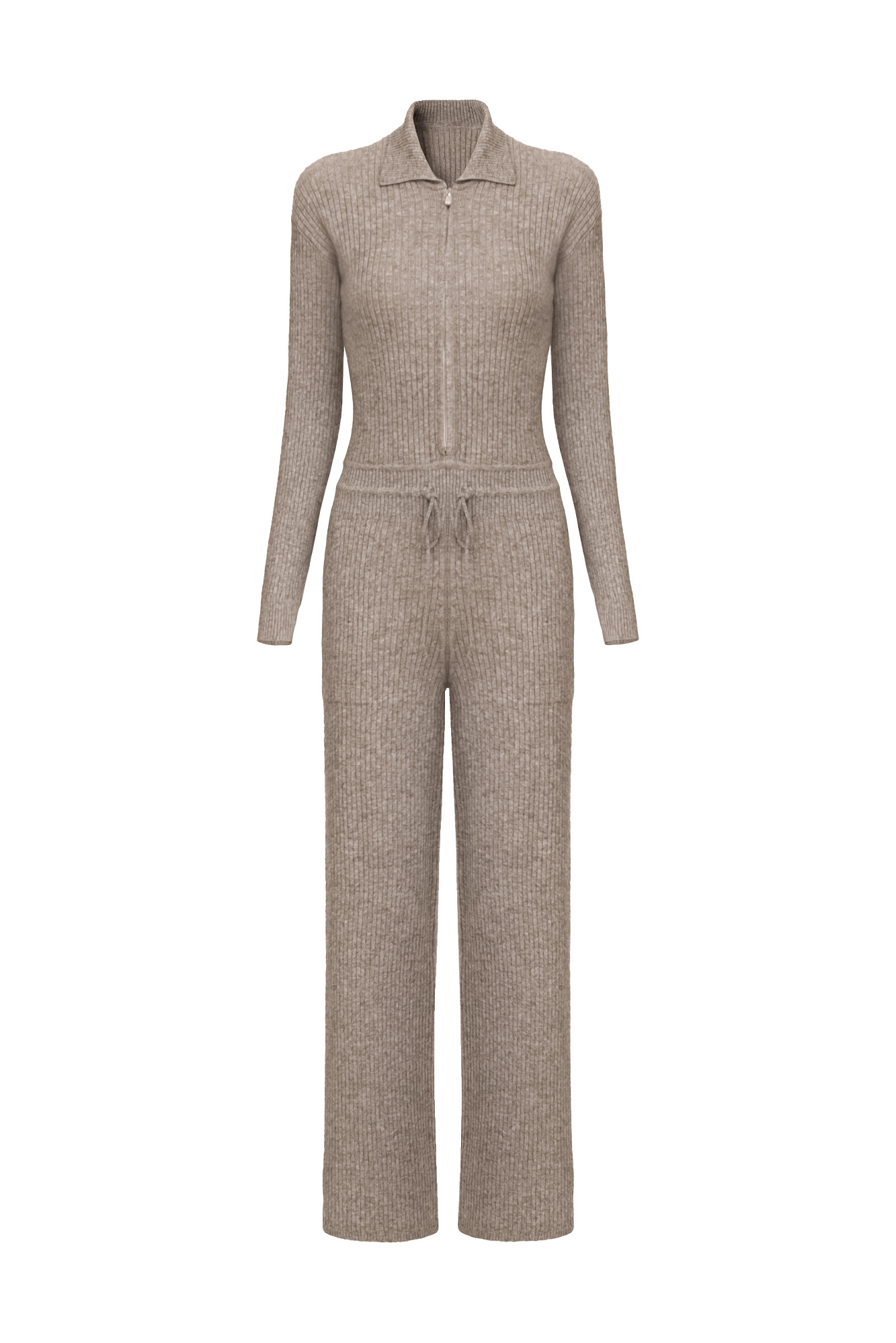Трикотажный комбинезон из смесовой шерсти с добавлением кашемира. Длинные рукава, пояс на кулиске и отложной воротник. Застежка на молнию.