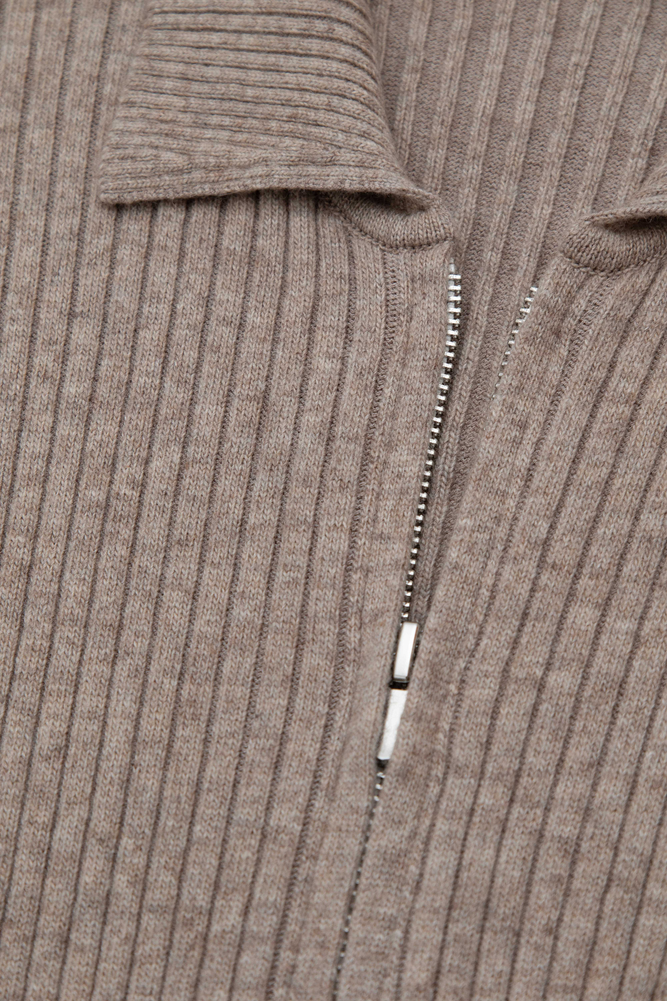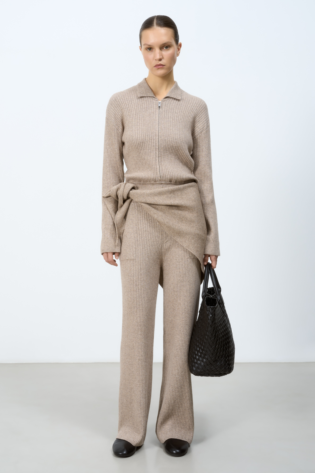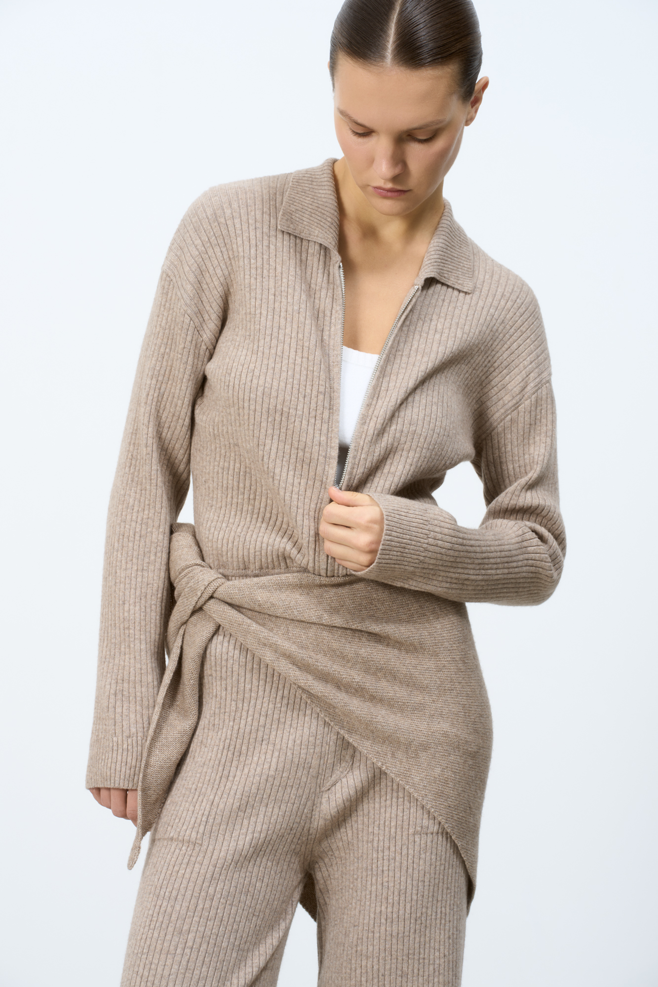 Трикотажный комбинезон из смесовой шерсти с добавлением кашемира. Длинные рукава, пояс на кулиске и отложной воротник. Застежка на молнию.