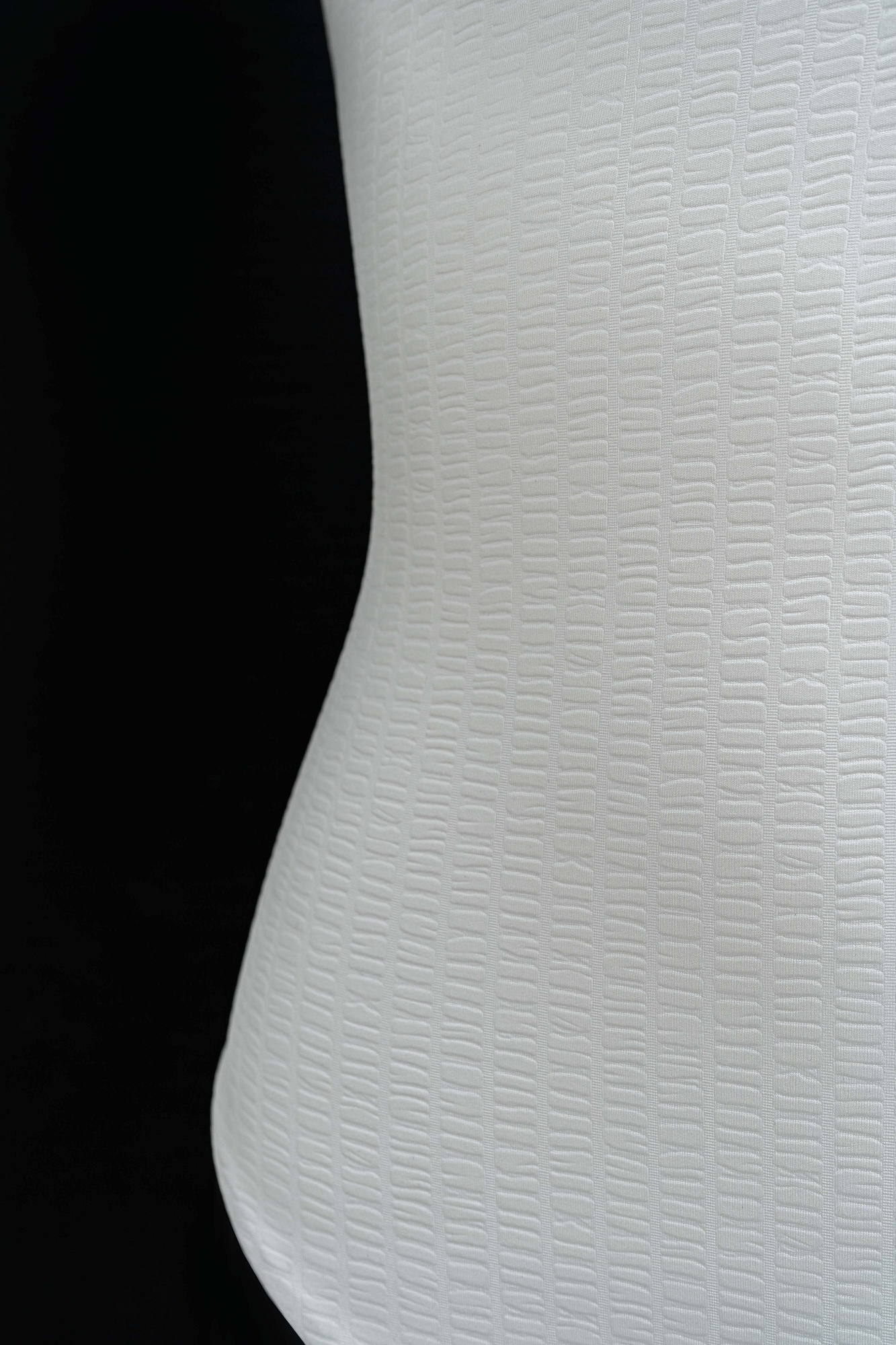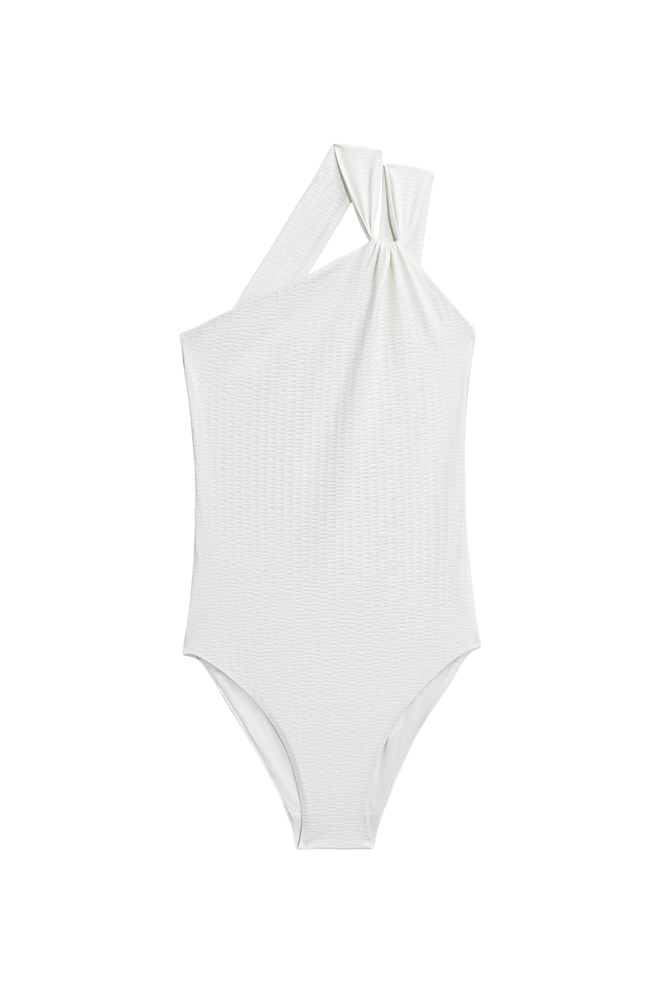 Слитный купальник с асимметричным верхом. Модель выполнена из текстурного материала.