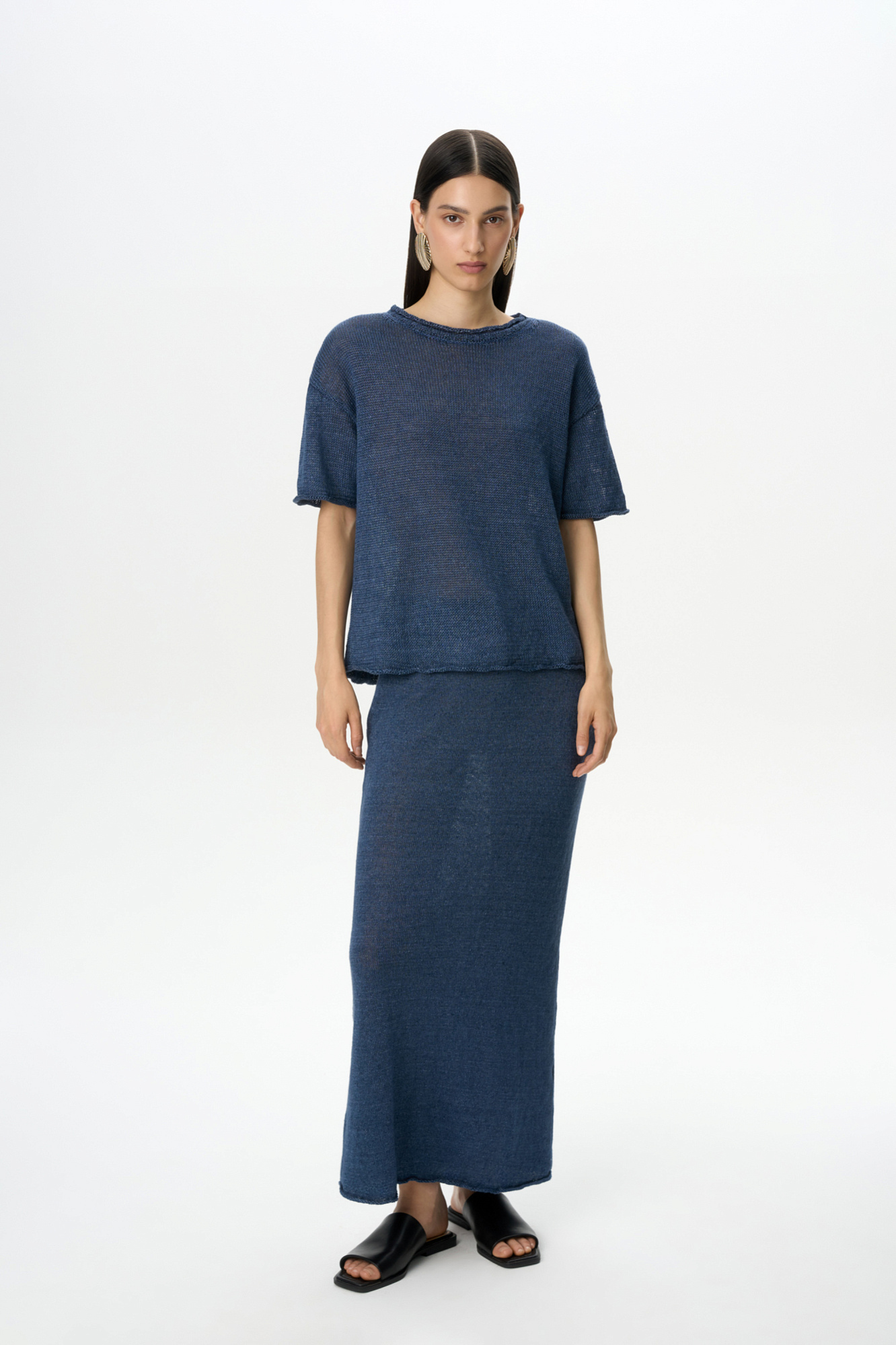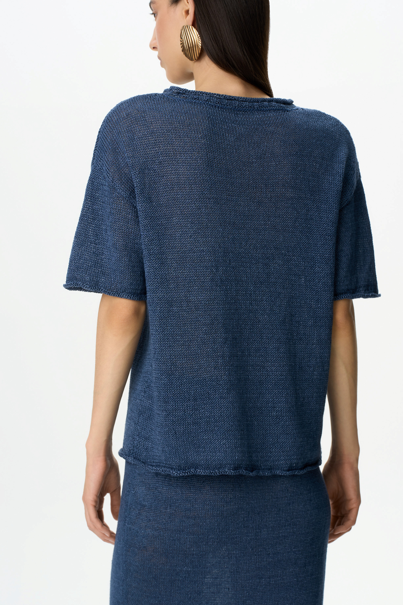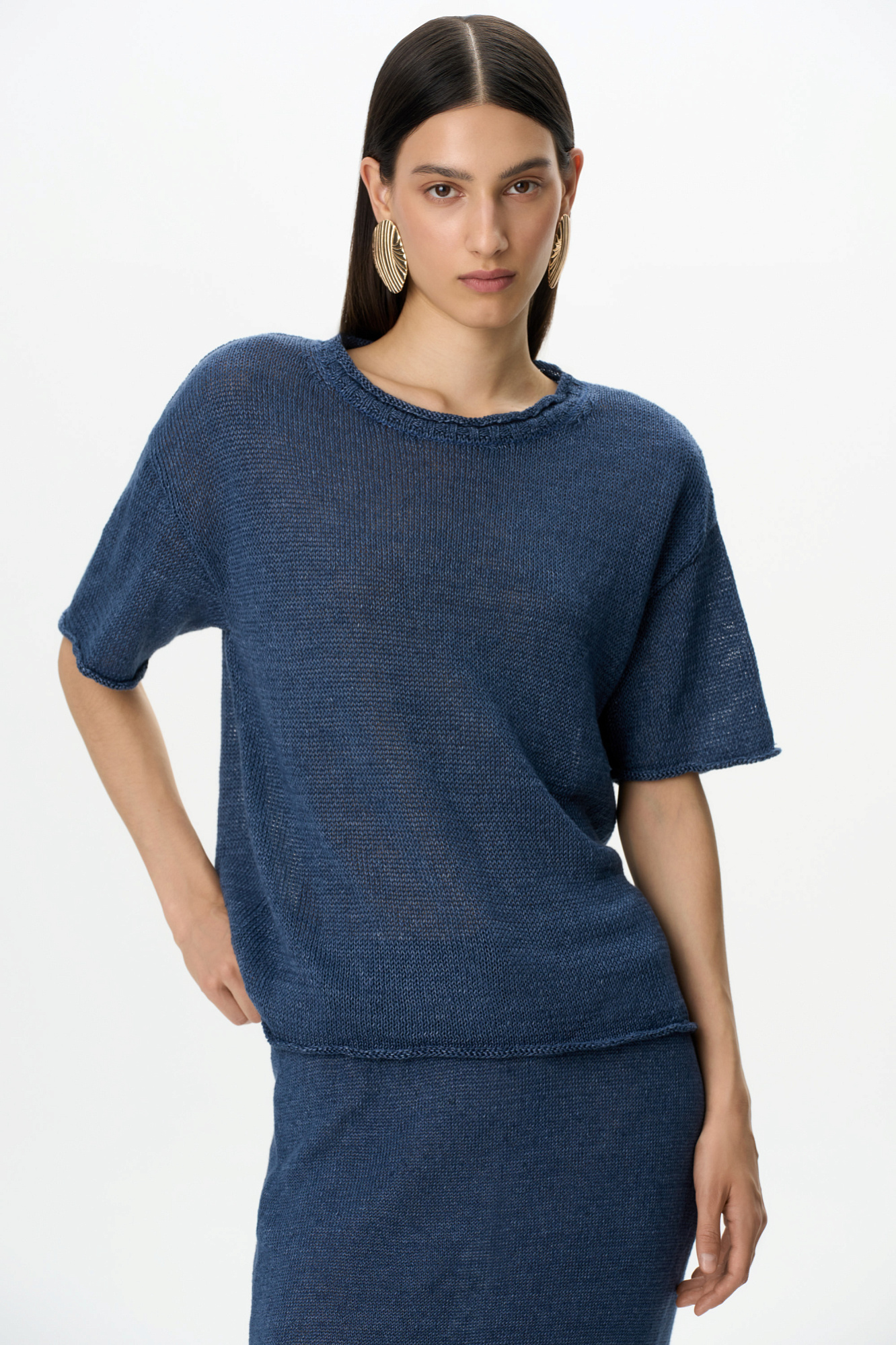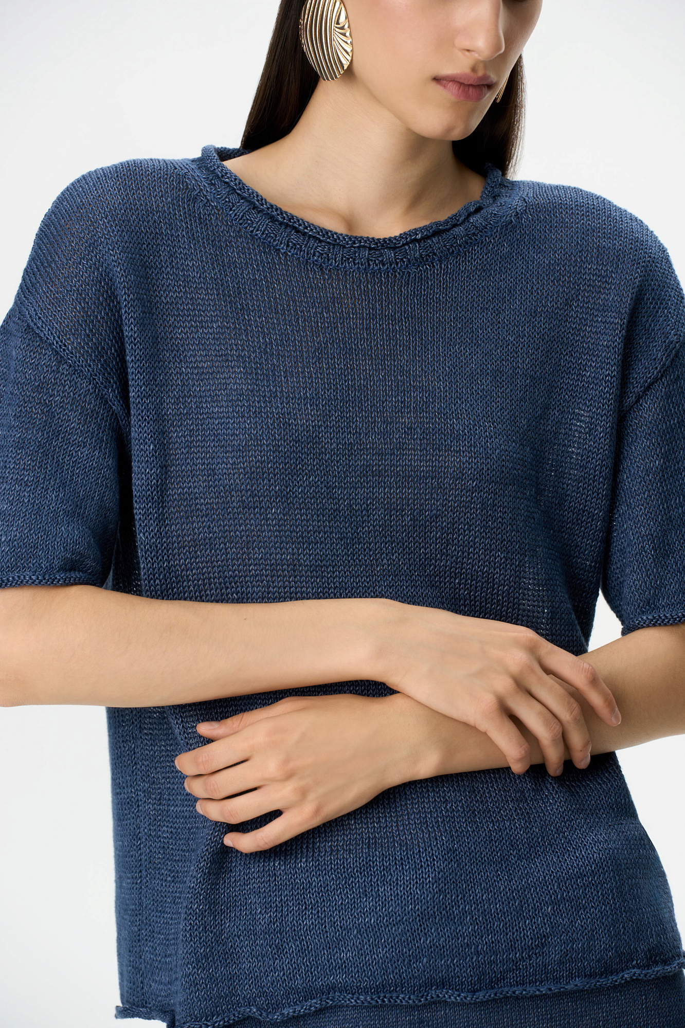 Трикотажная футболка из 100% льна. Модель свободного силуэта со спущенной линией плеча, коротким рукавом и круглымм вырезом горловины.