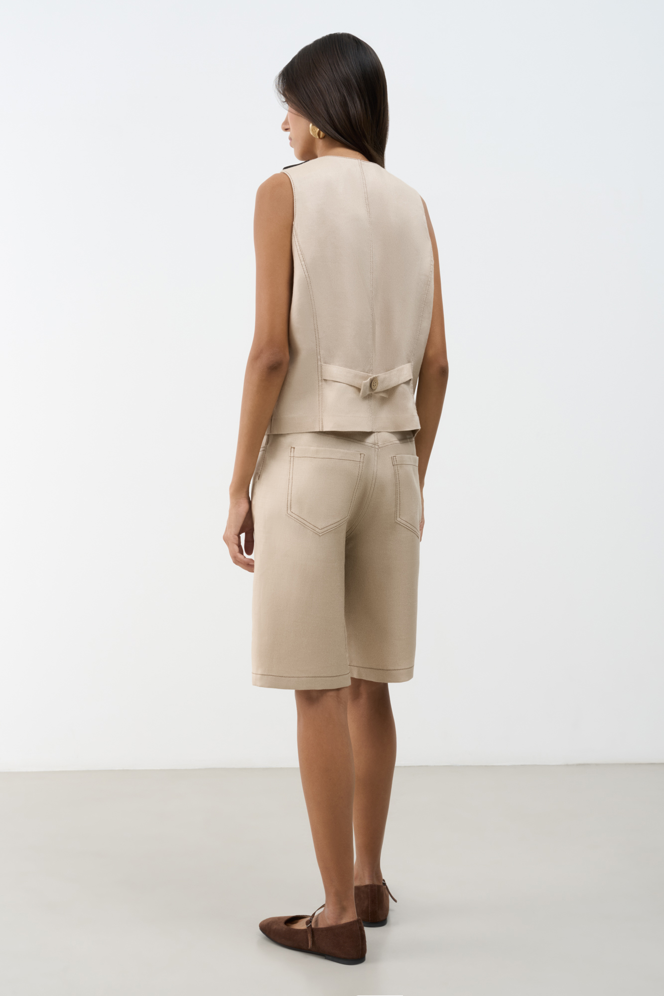 Шорты из 100% льна с брендированным ярлыком на поясе. Пять карманов, застежка на молнию и пуговицу.
