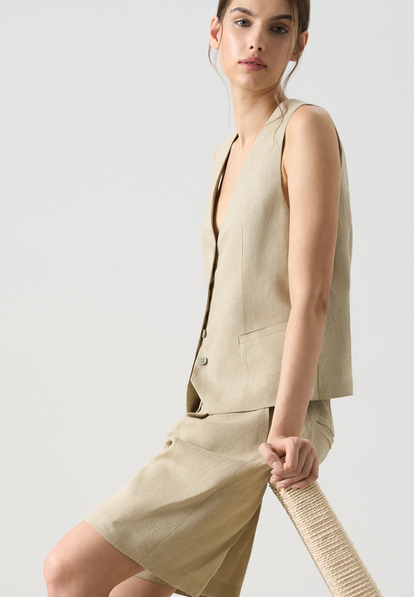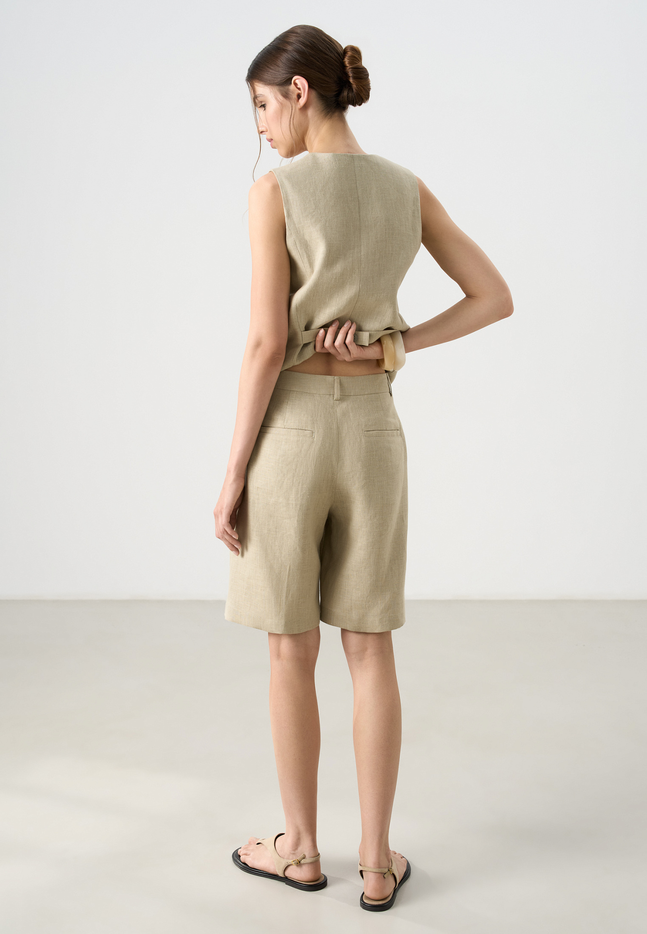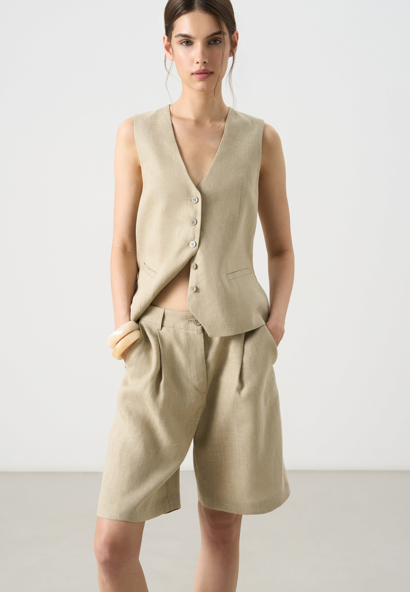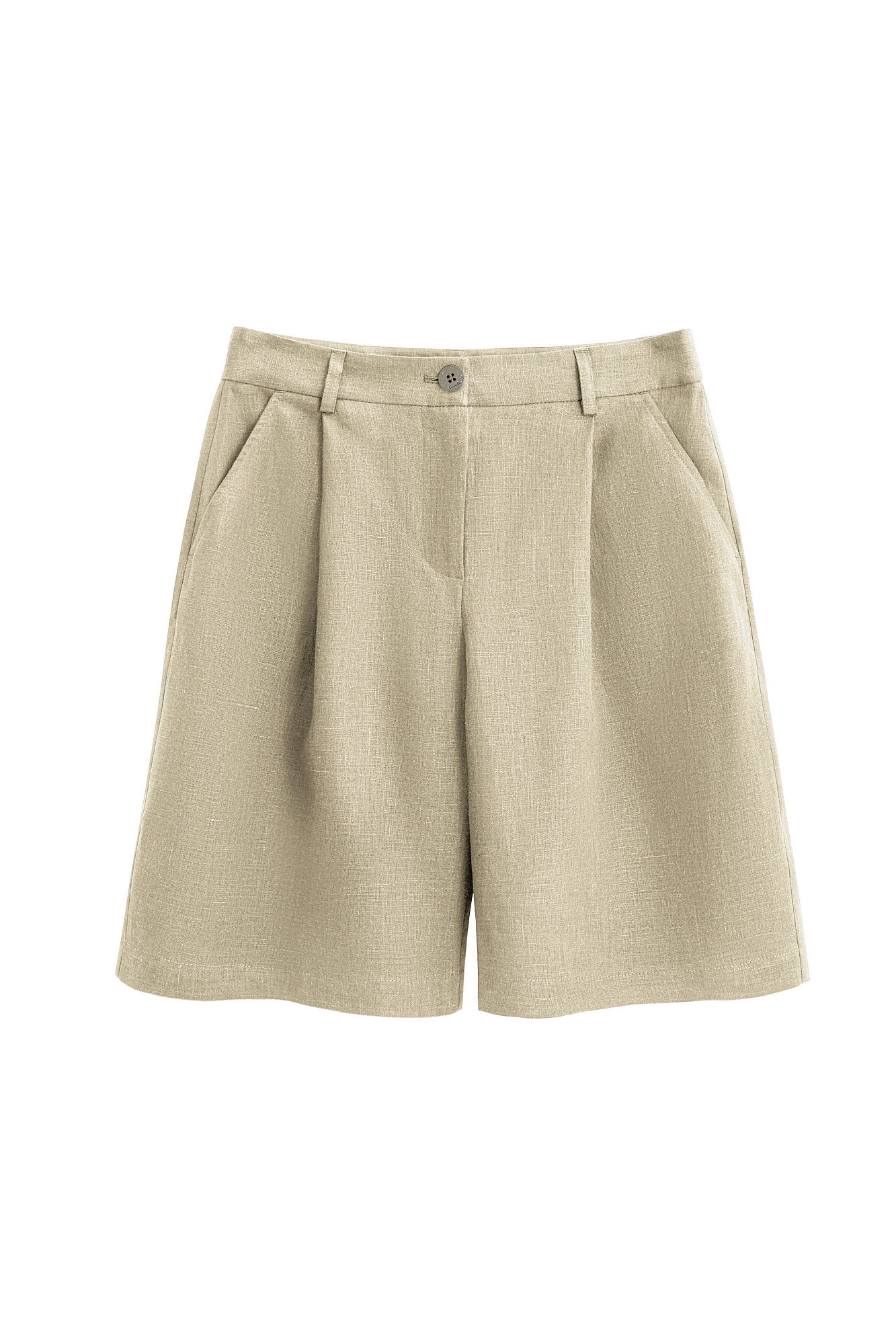 Шорты из 100% льна. Модель с высокой посадкой, широкими штанинами и складками спереди. Два кармана спереди и сзади. Застежка на пуговицу и молнию. Шлевки на поясе для ремня.