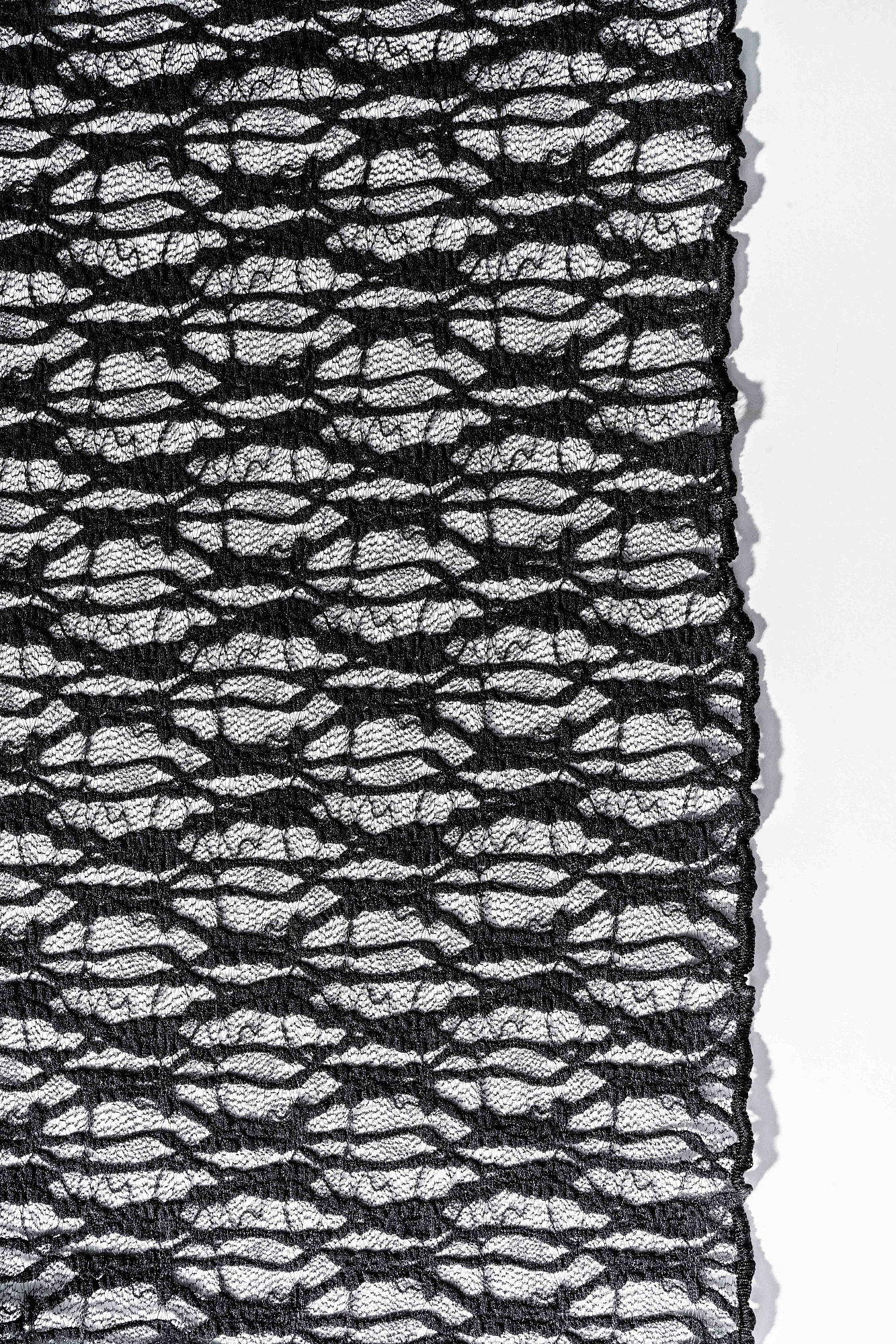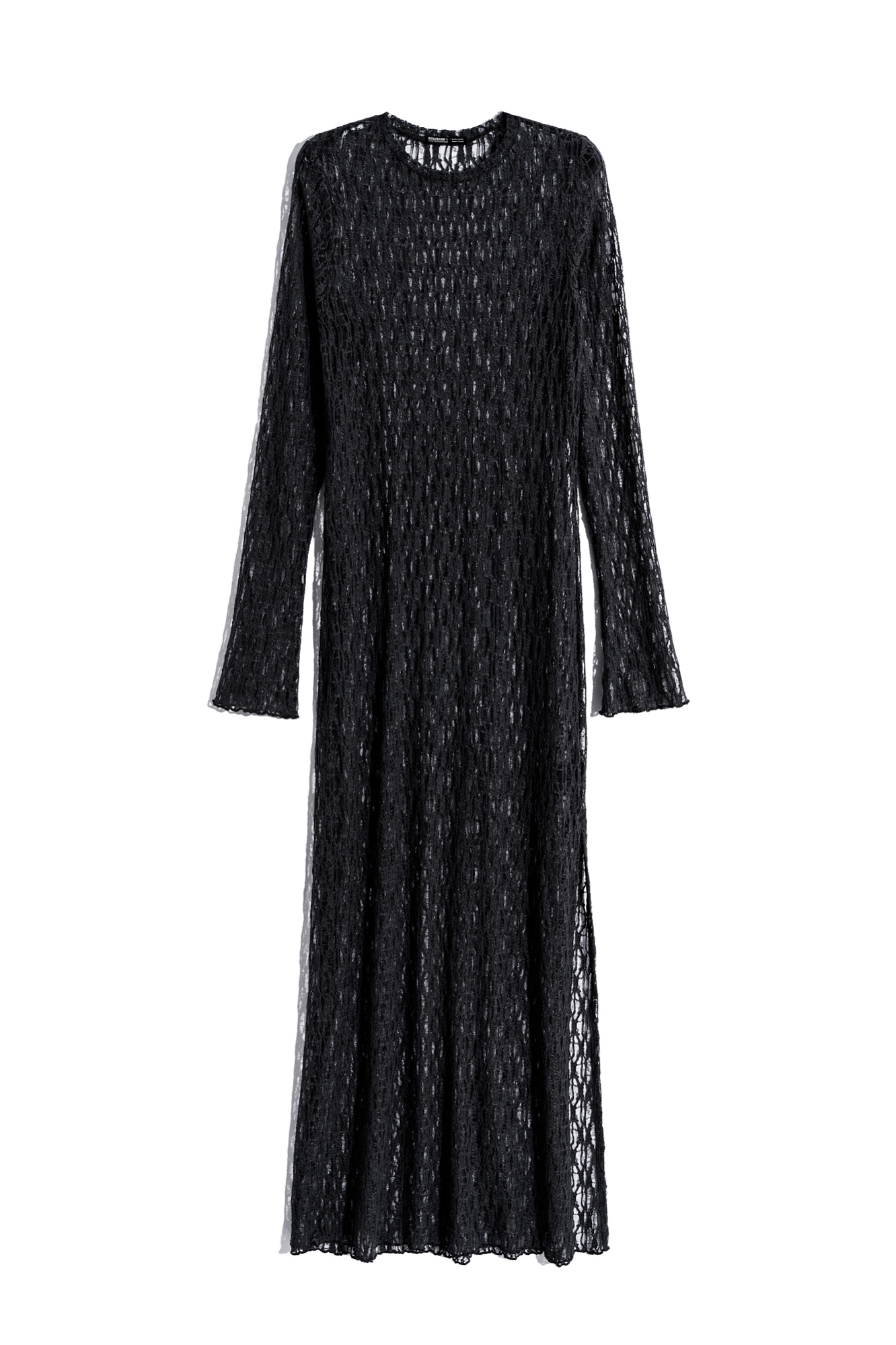 Платье длины макси из легкого кружева. Модель свободного силуэта с длинными рукавами, круглой горловиной и высоким разрезом на подоле. Изделие выполнено без подкладки.