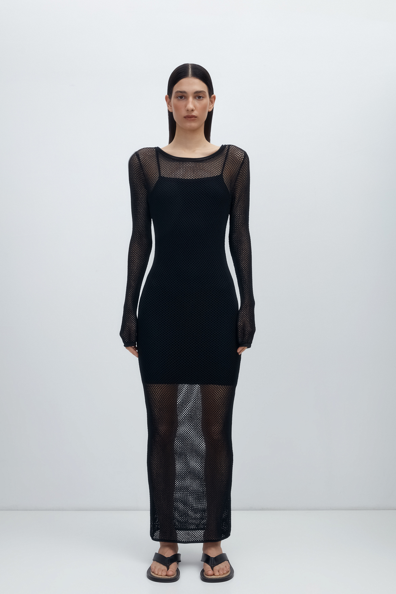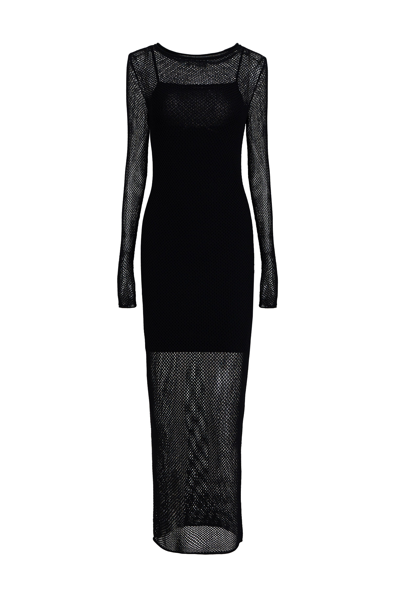 Трикотажное платье из вискозы с длинным рукавом. Модель приталенного силуэта длины макси, выполнена полностью ажурным переплетением с имитацией "сетки". В комплекте нижнее платье-комбинация.