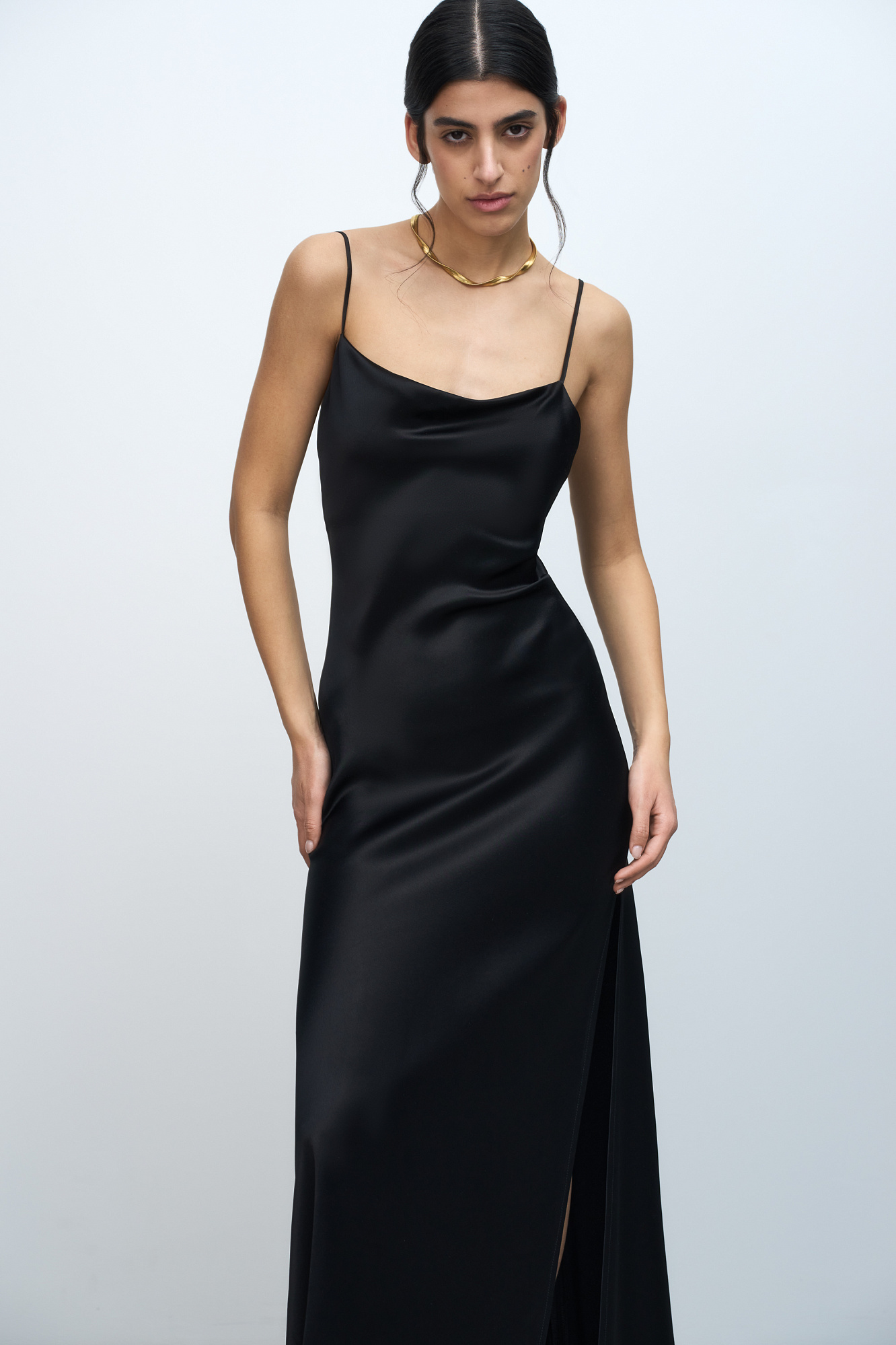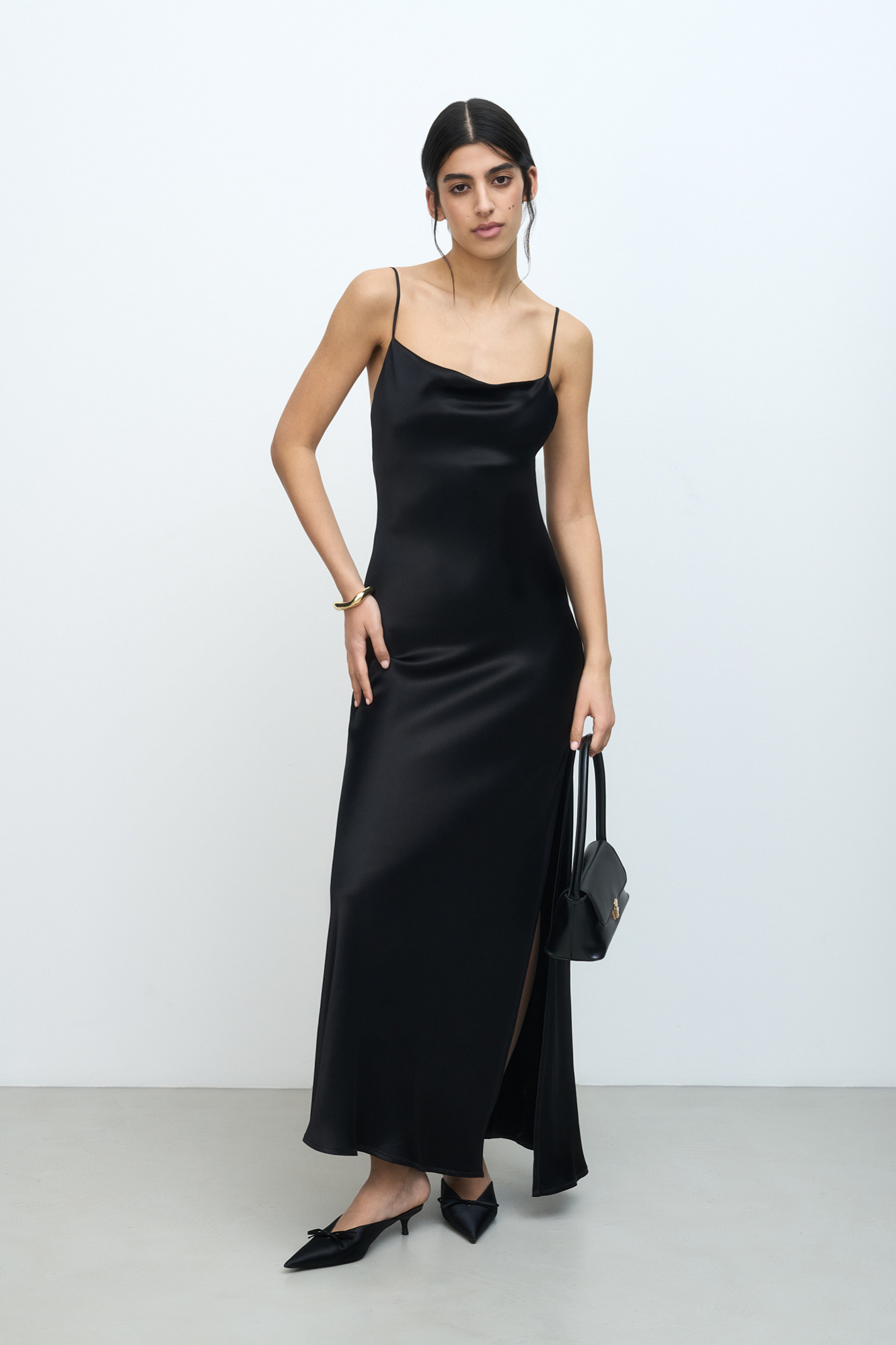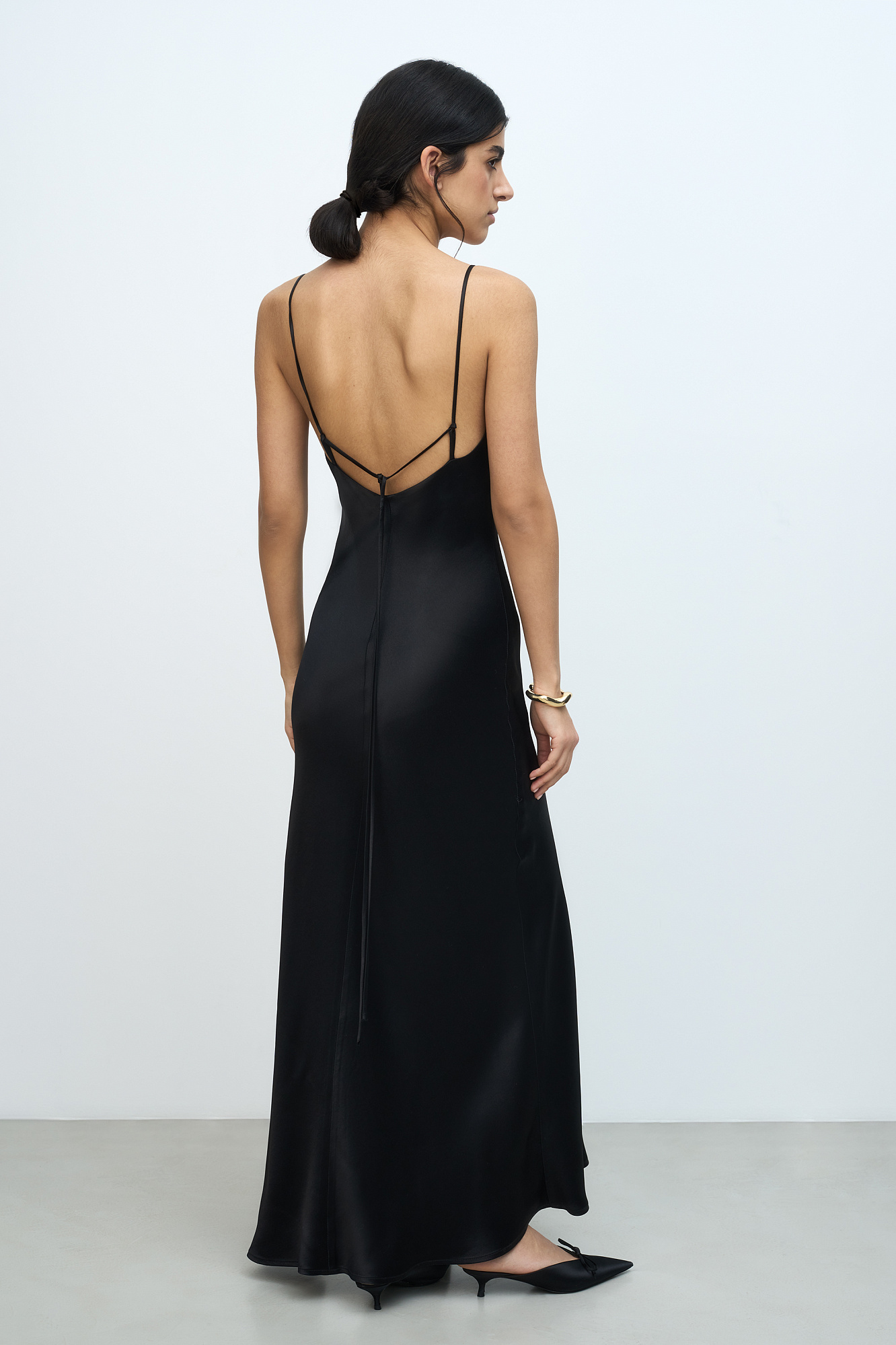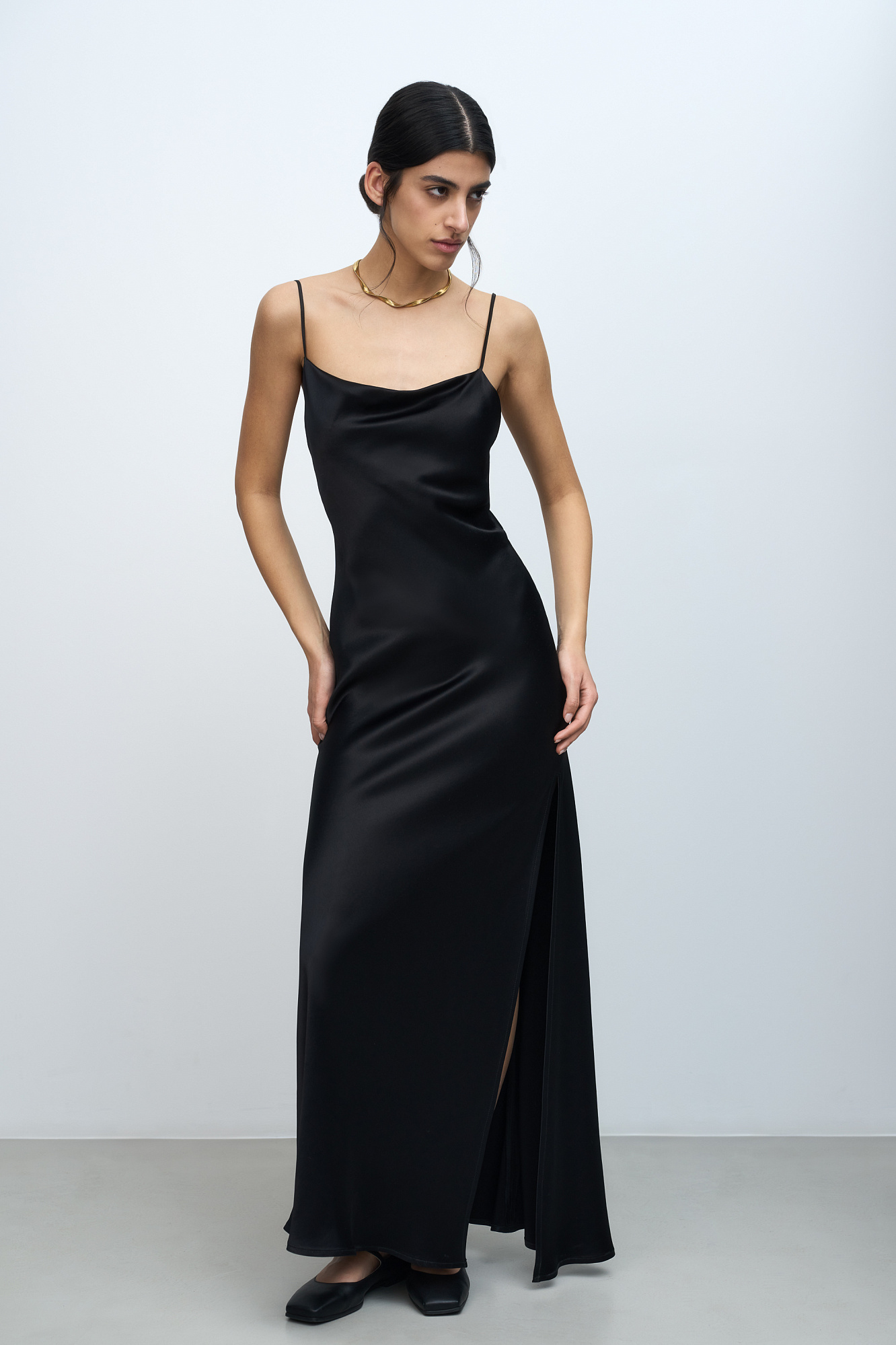 Атласное платье-комбинация длины миди из 100% вискозы. Модель приталенного силуэта, с высоким разрезом сбоку и открытой спиной, Изделие выполнено на тонких регулируемых бретелях.