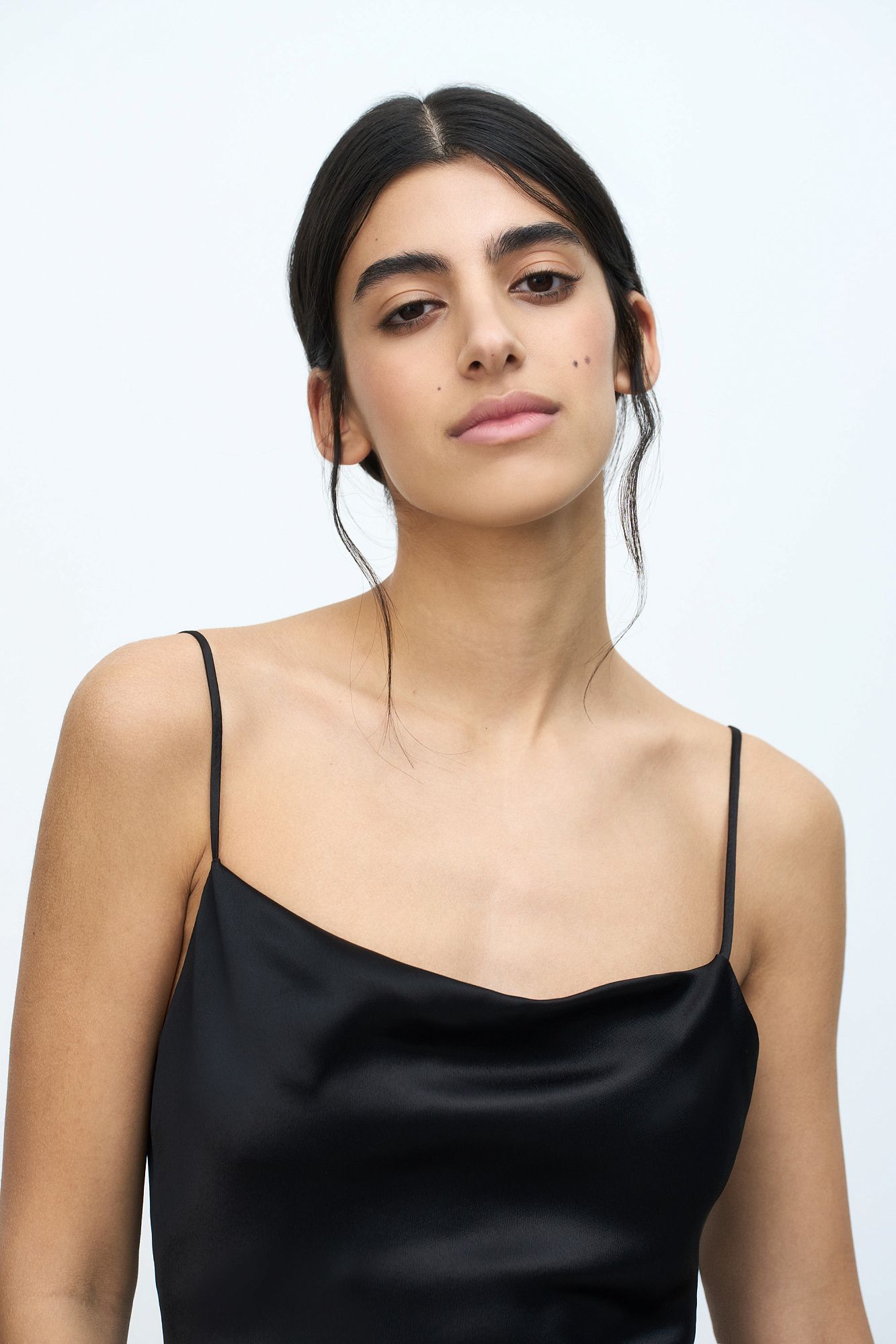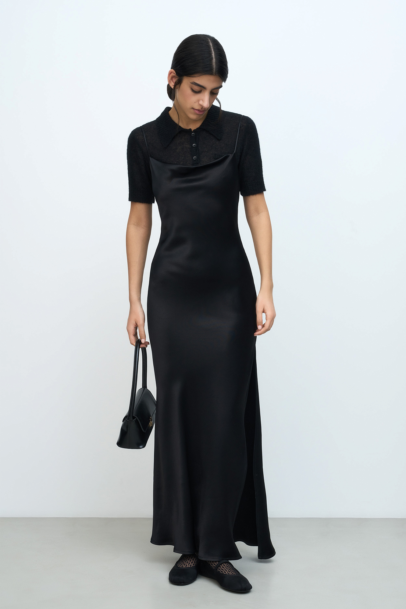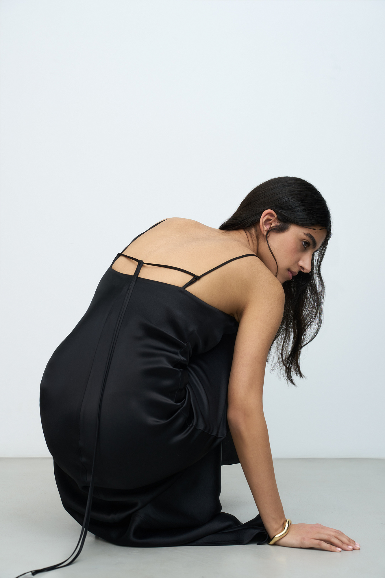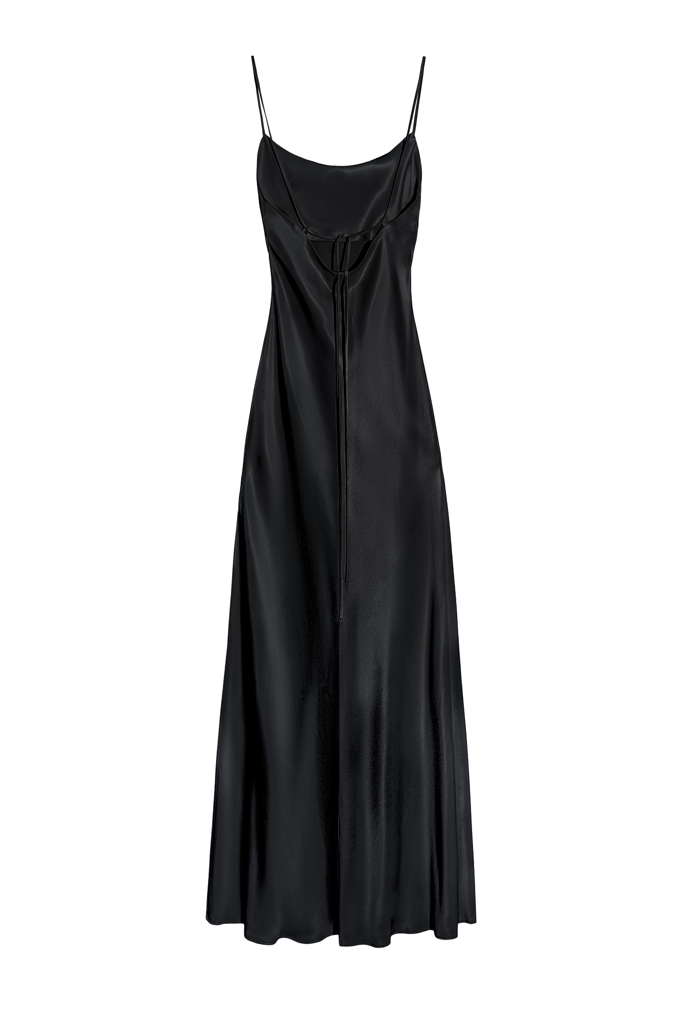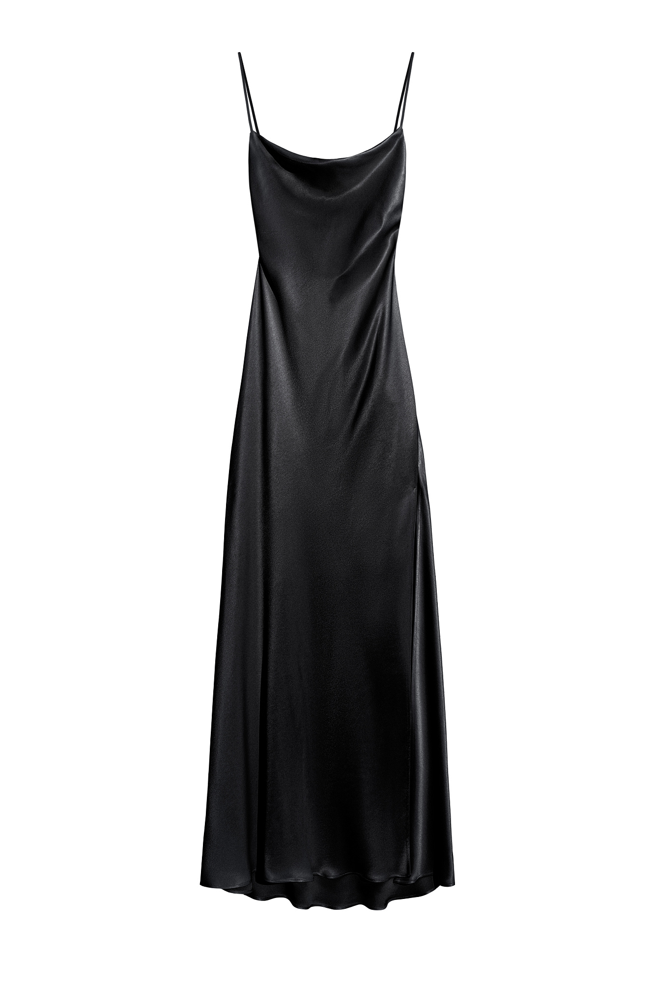 Атласное платье-комбинация длины миди из 100% вискозы. Модель приталенного силуэта, с высоким разрезом сбоку и открытой спиной, Изделие выполнено на тонких регулируемых бретелях.