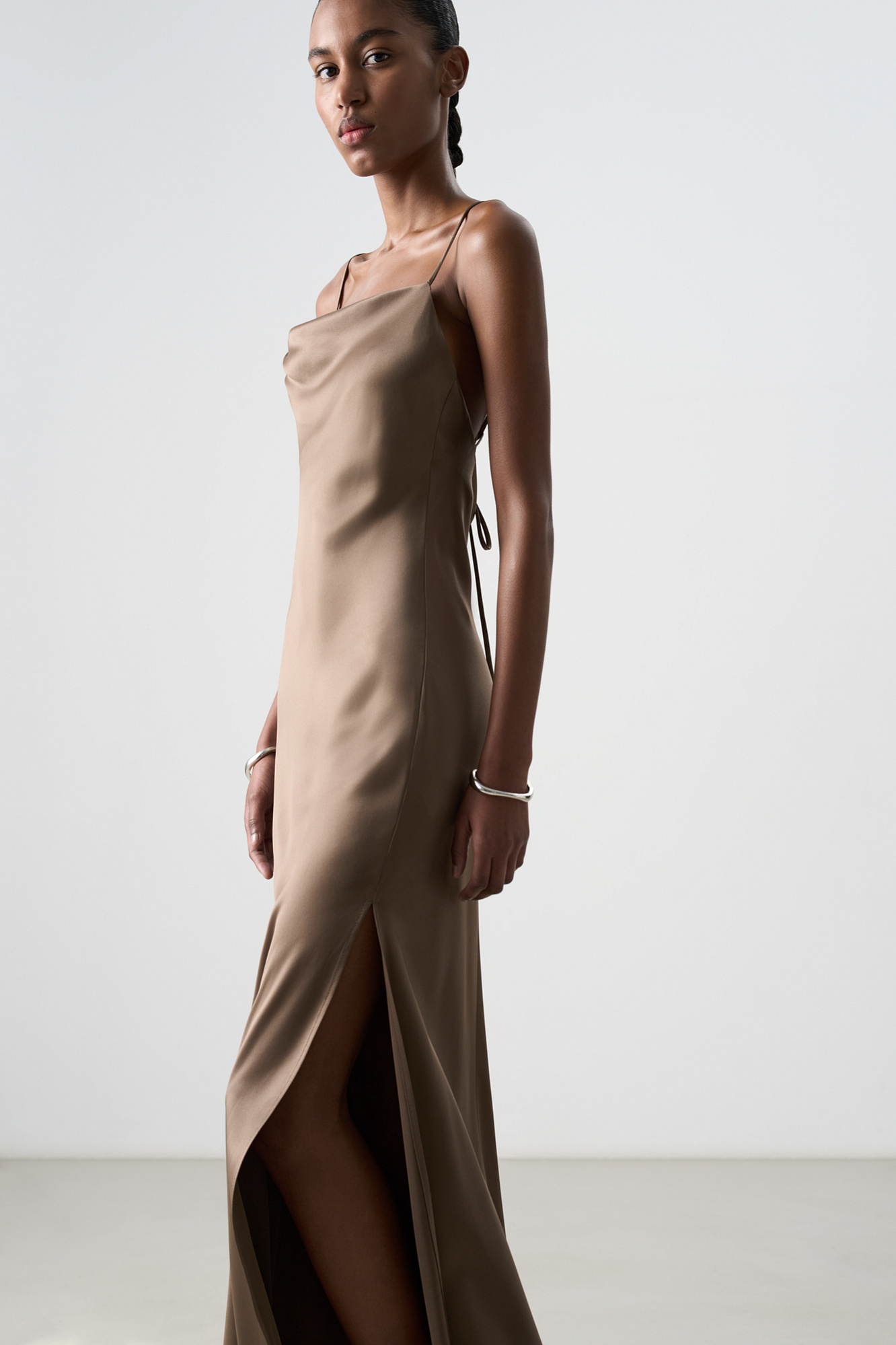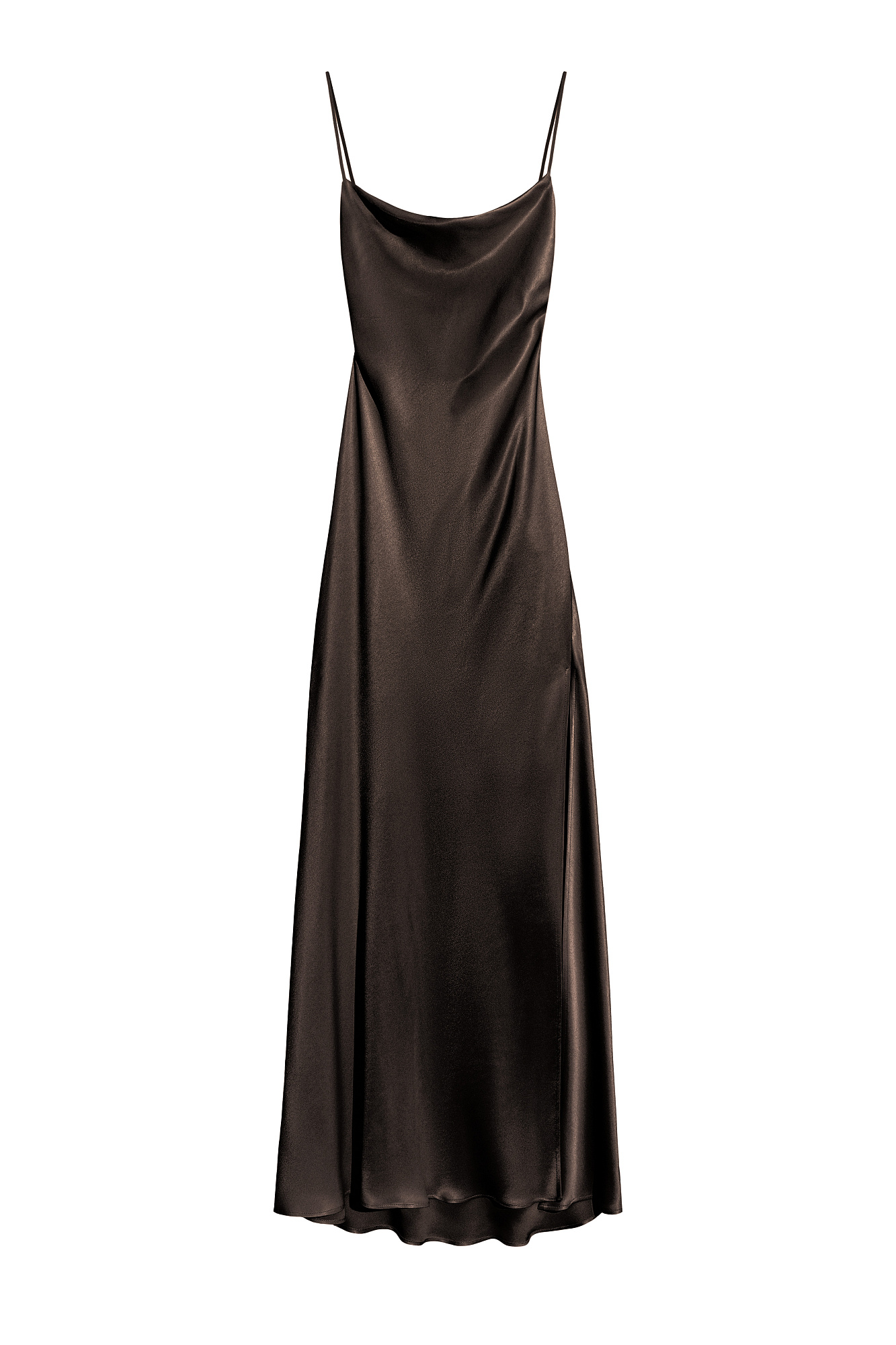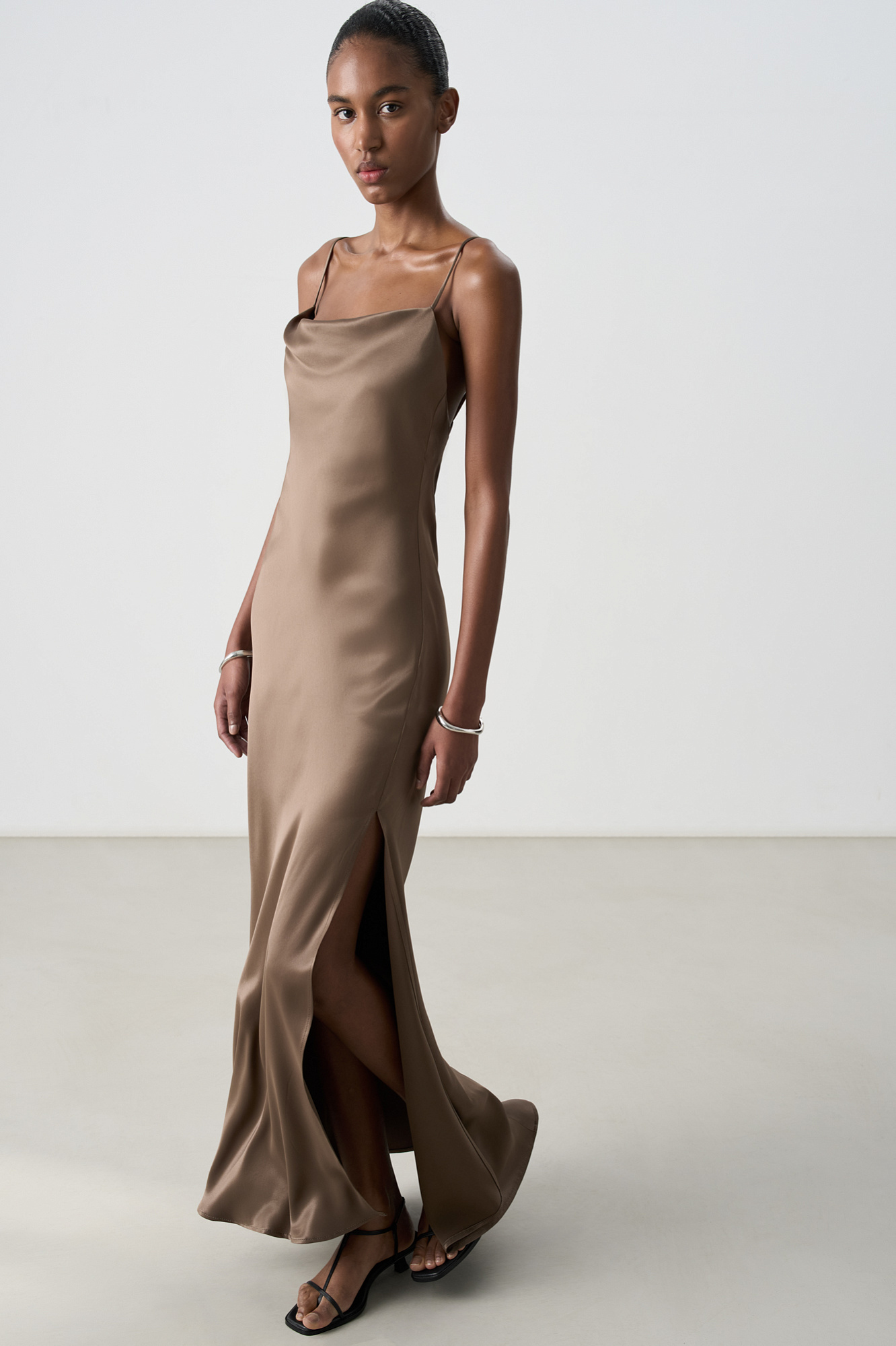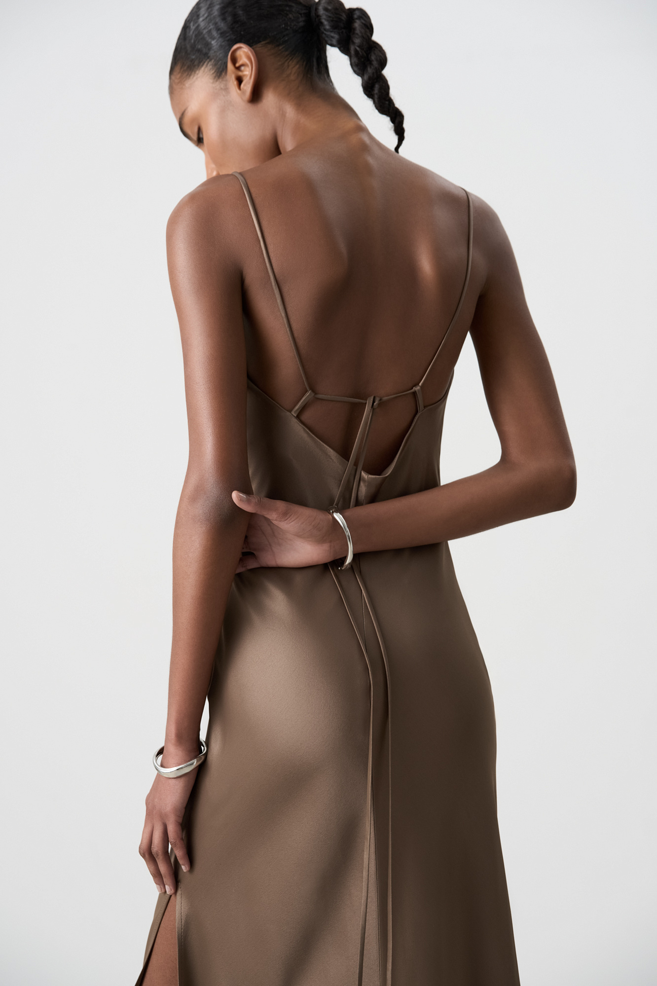 Атласное платье-комбинация длины миди из 100% вискозы. Модель приталенного силуэта, с высоким разрезом сбоку и открытой спиной, Изделие выполнено на тонких регулируемых бретелях.