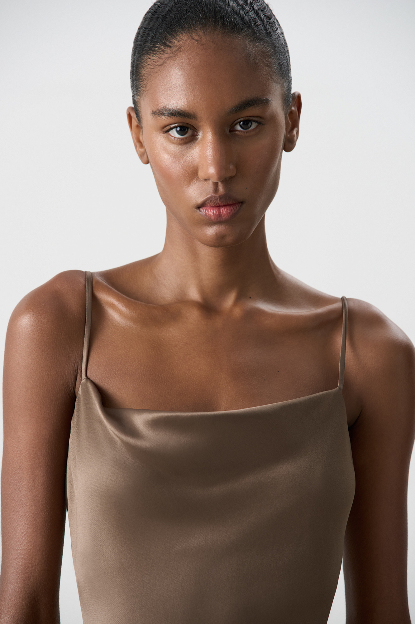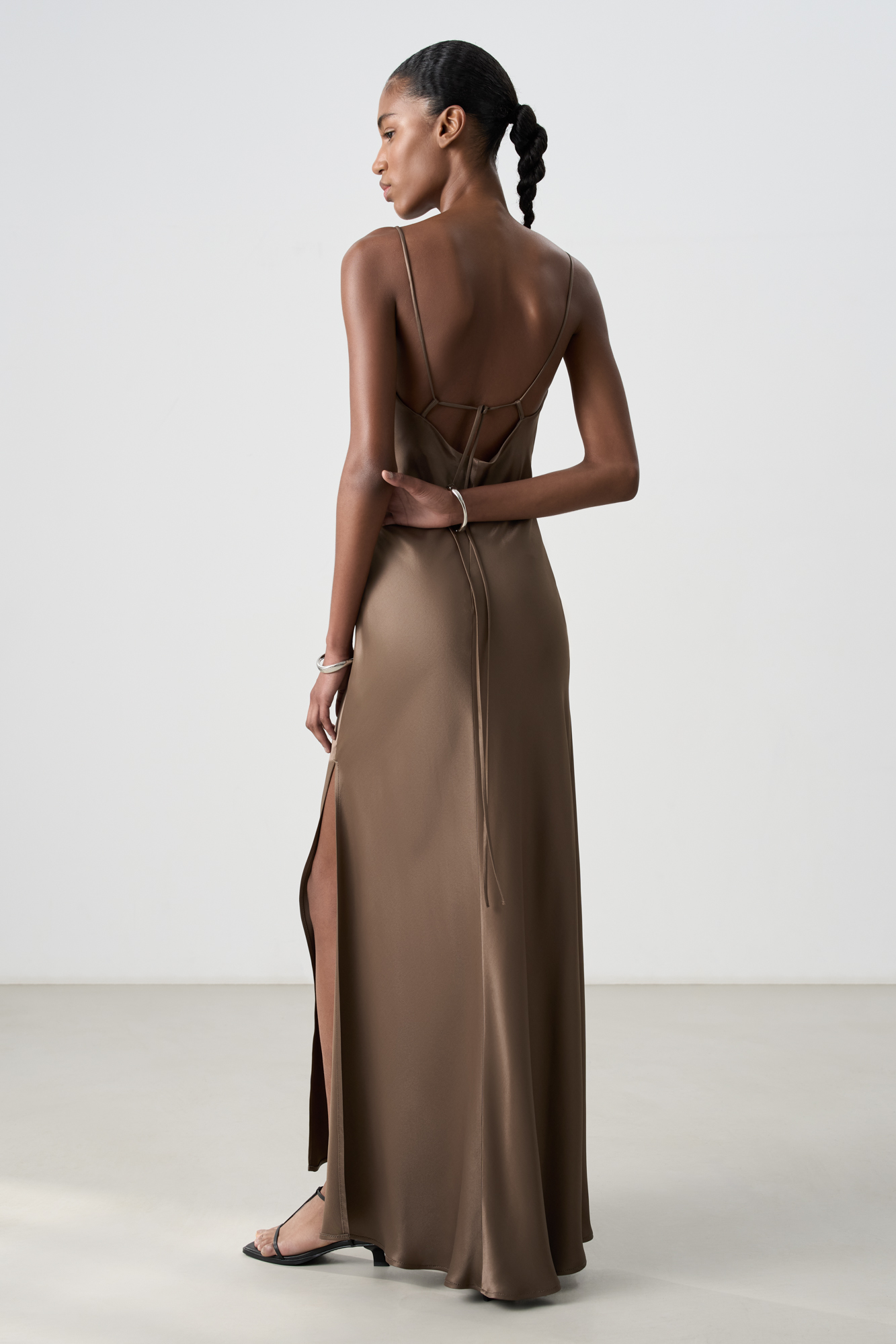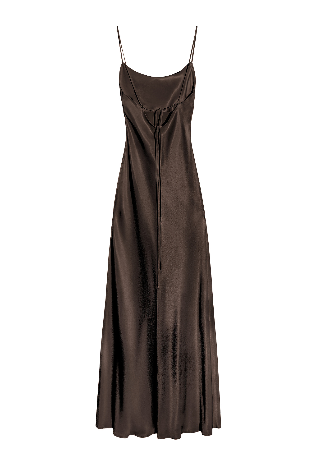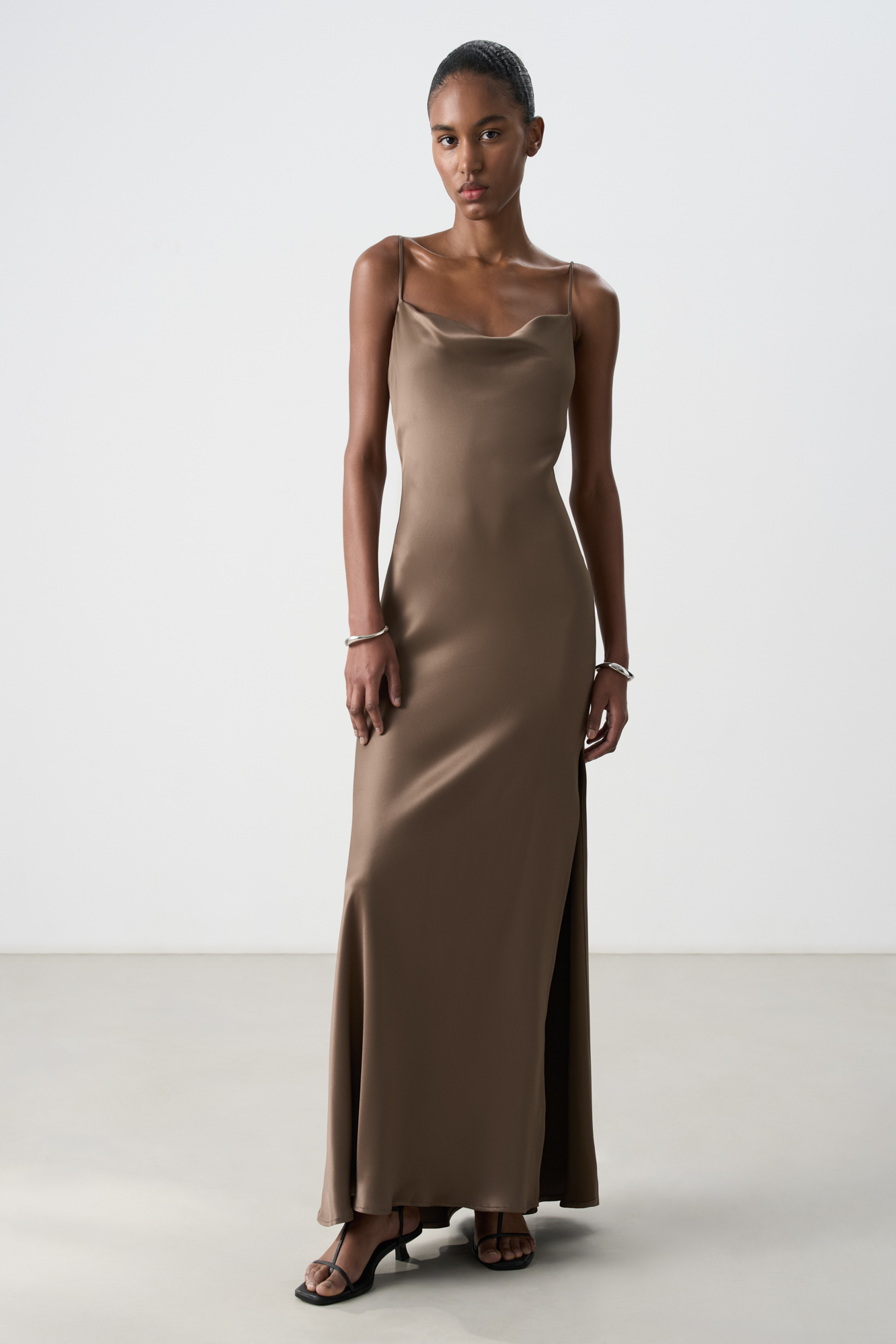 Атласное платье-комбинация длины миди из 100% вискозы. Модель приталенного силуэта, с высоким разрезом сбоку и открытой спиной, Изделие выполнено на тонких регулируемых бретелях.