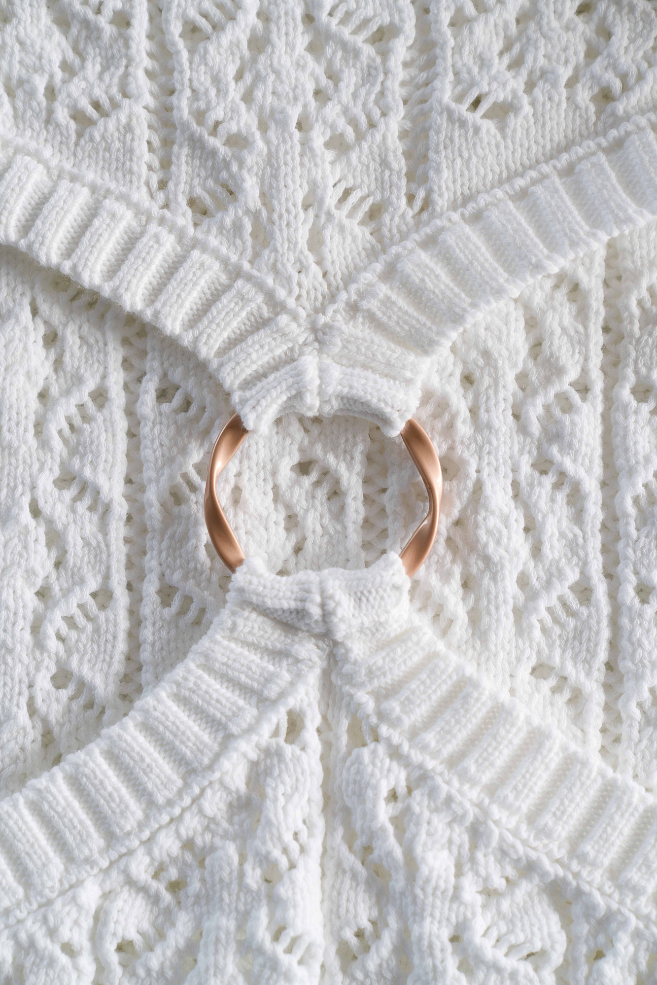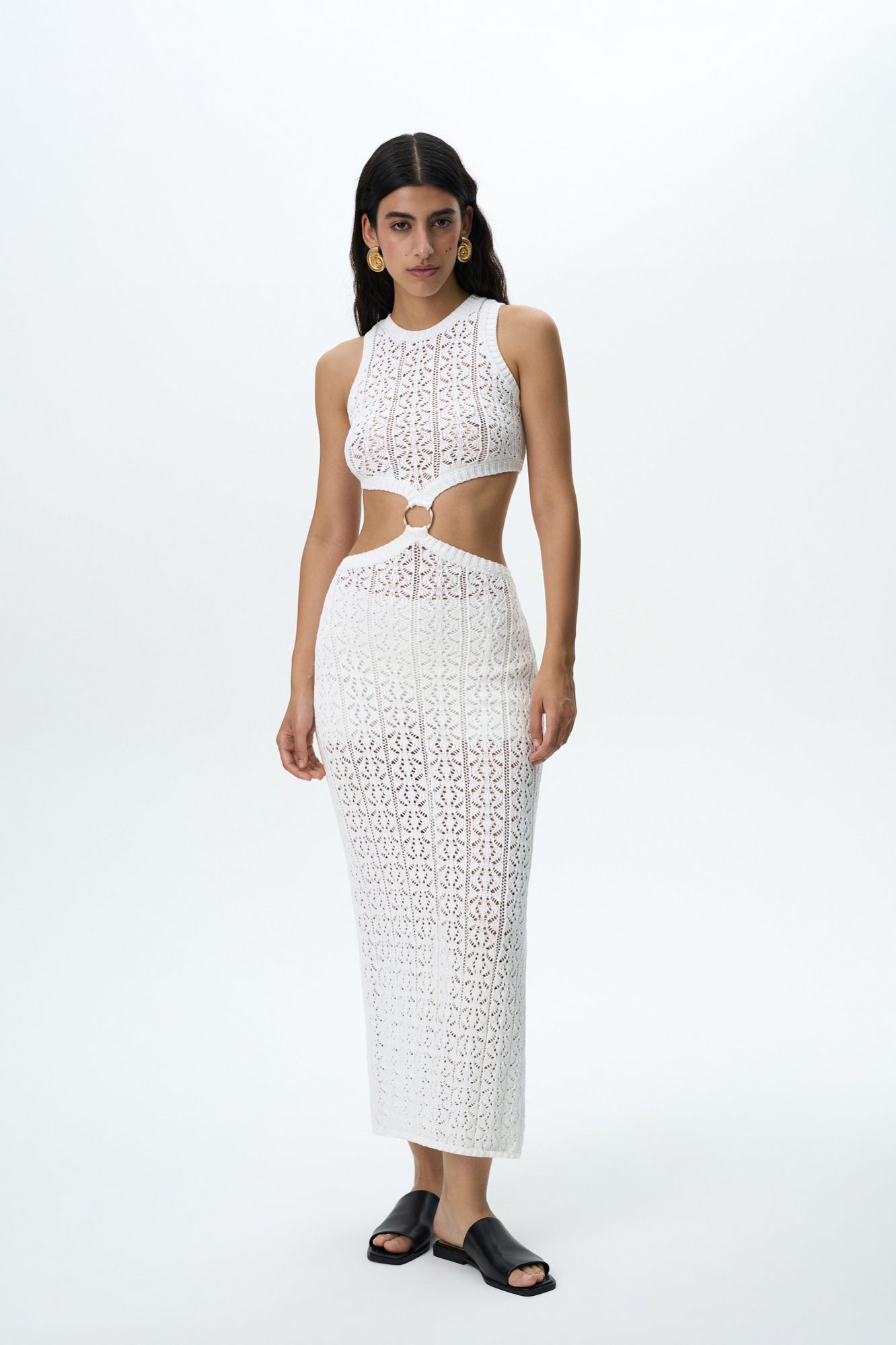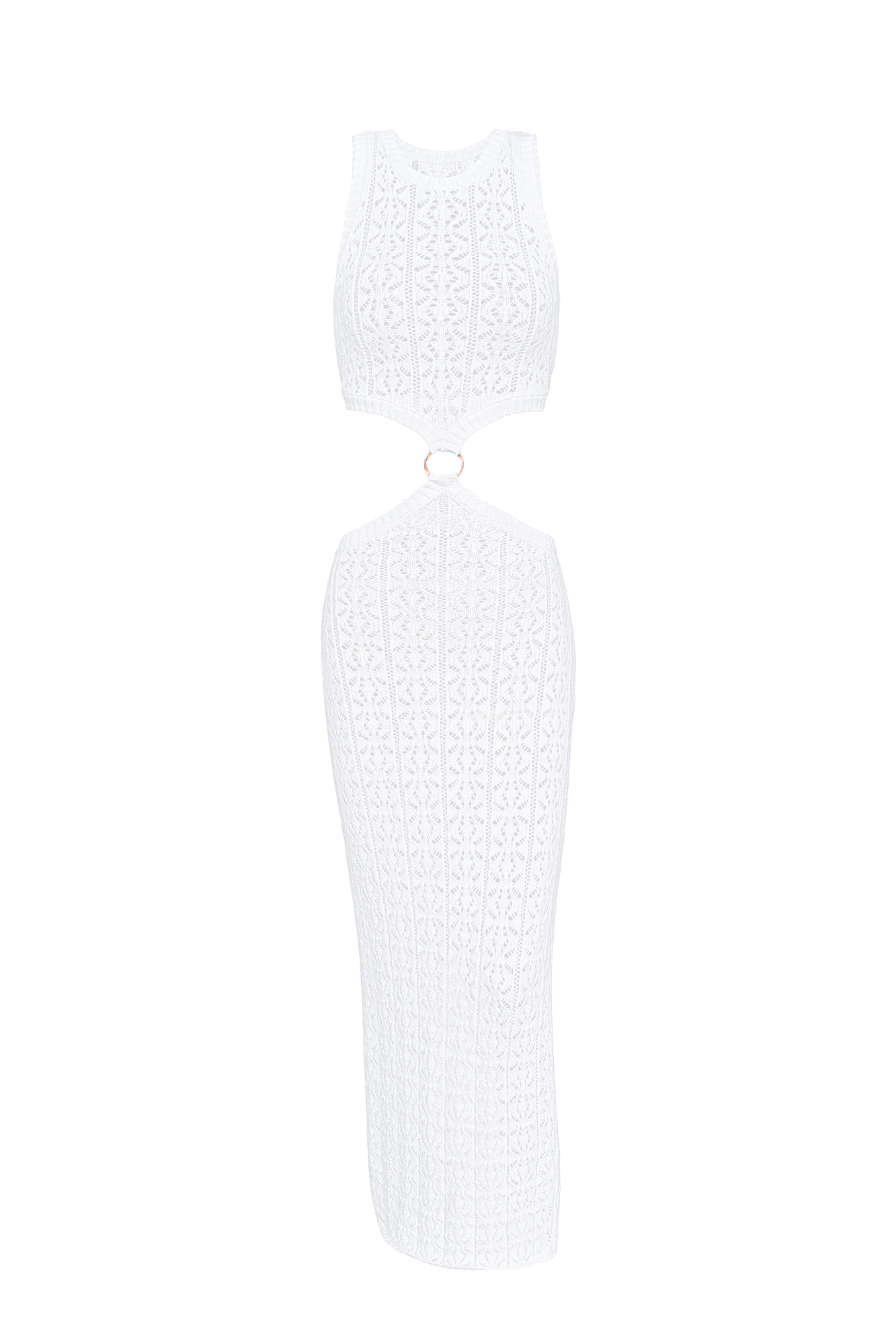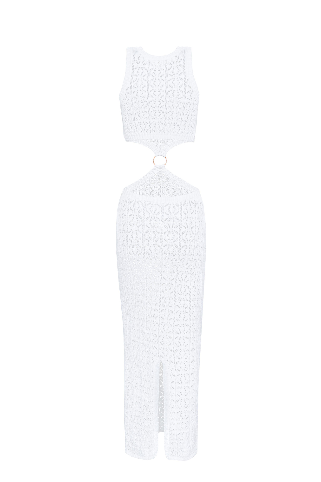 Трикотажный ажурный сарафан из хлопка с добавлением эластана. Модель без рукавов, с круглым вырезом горловины. Сарафан декорирован кольцом, соединящим верх и юбку изделия. Края выполнены в рубчик.