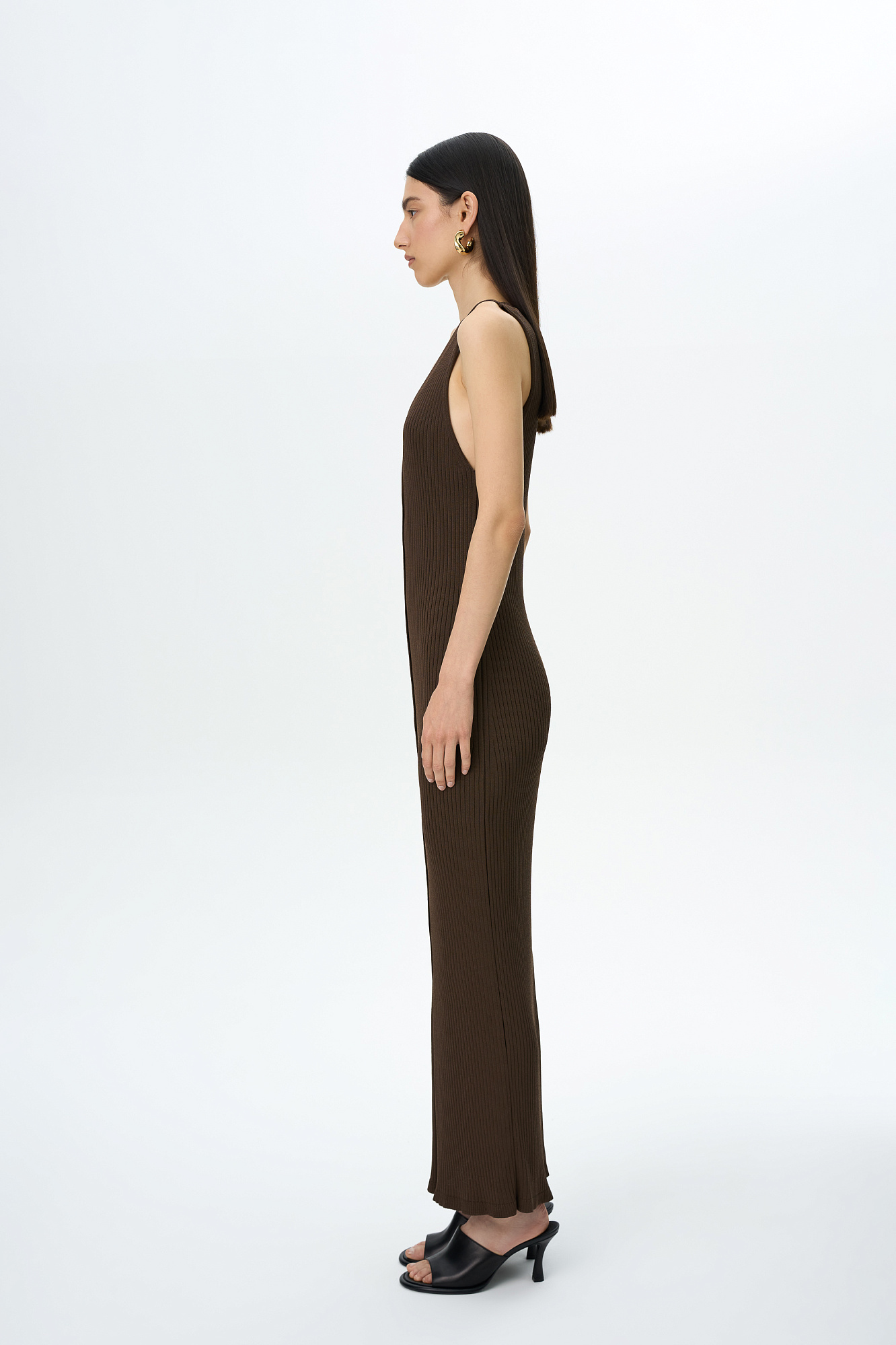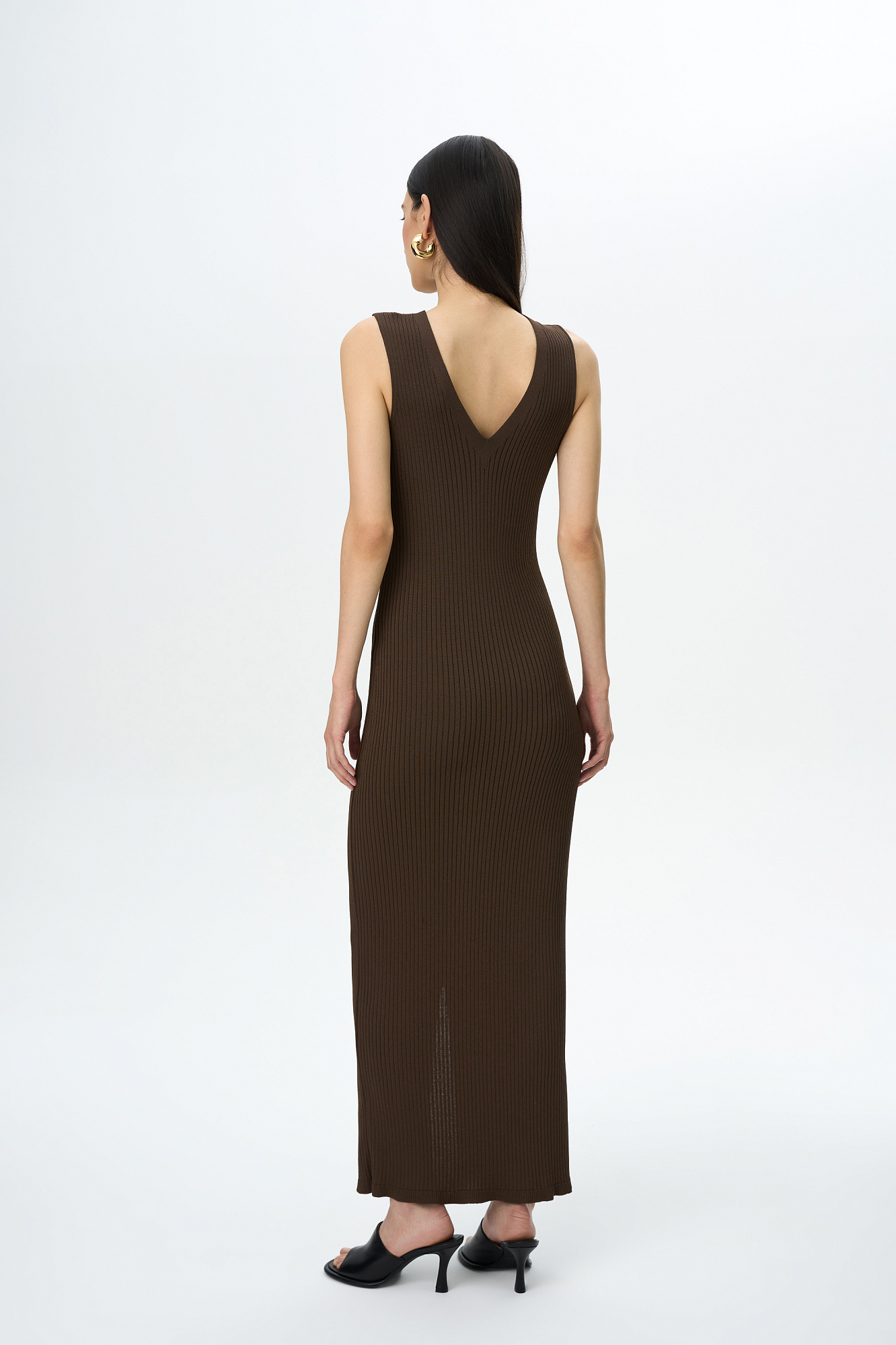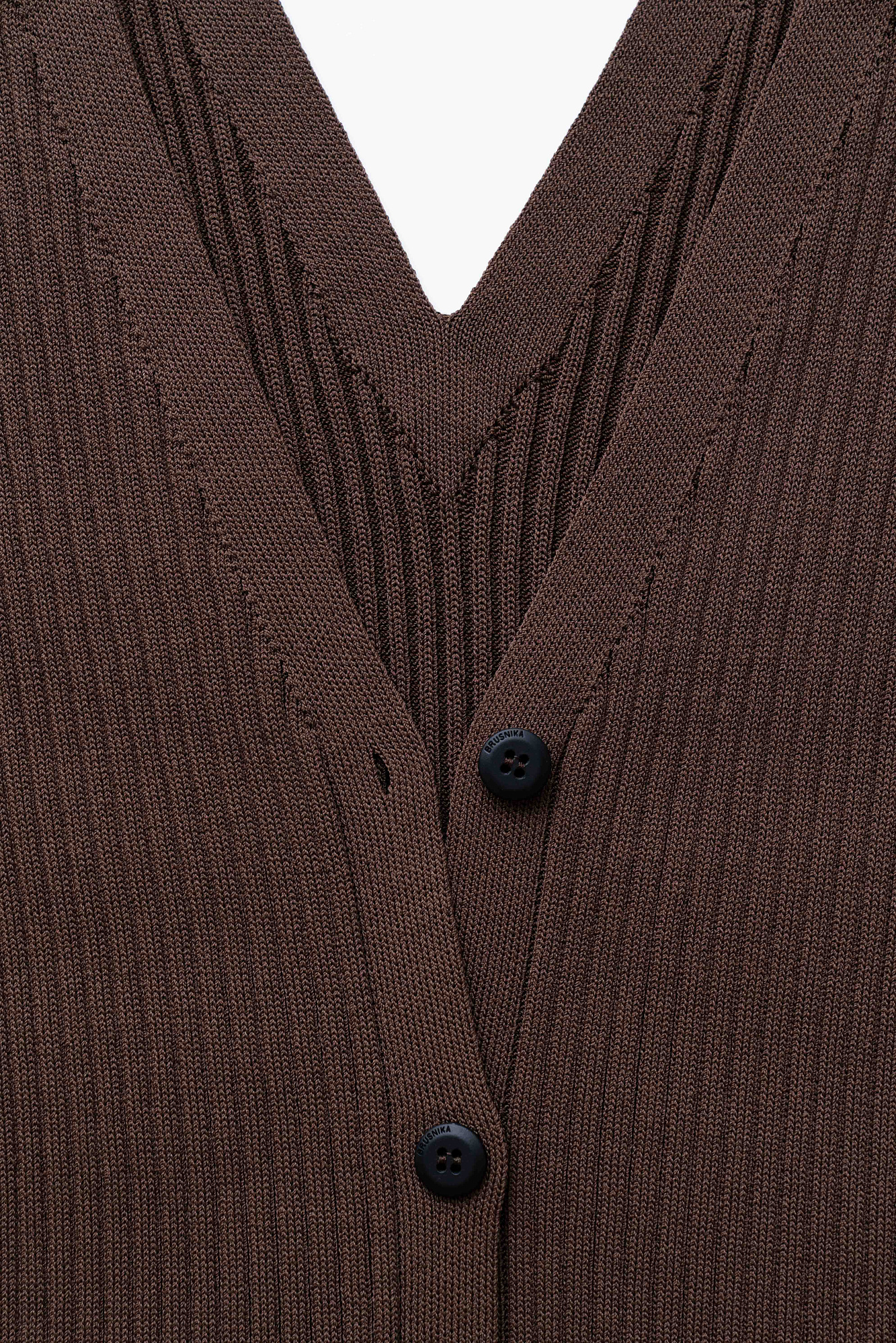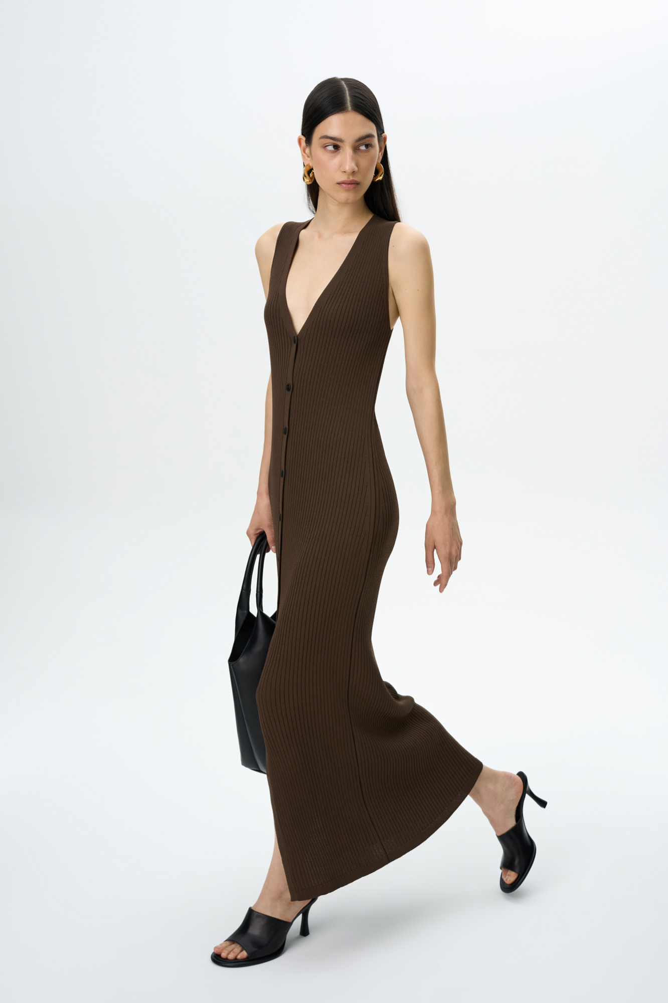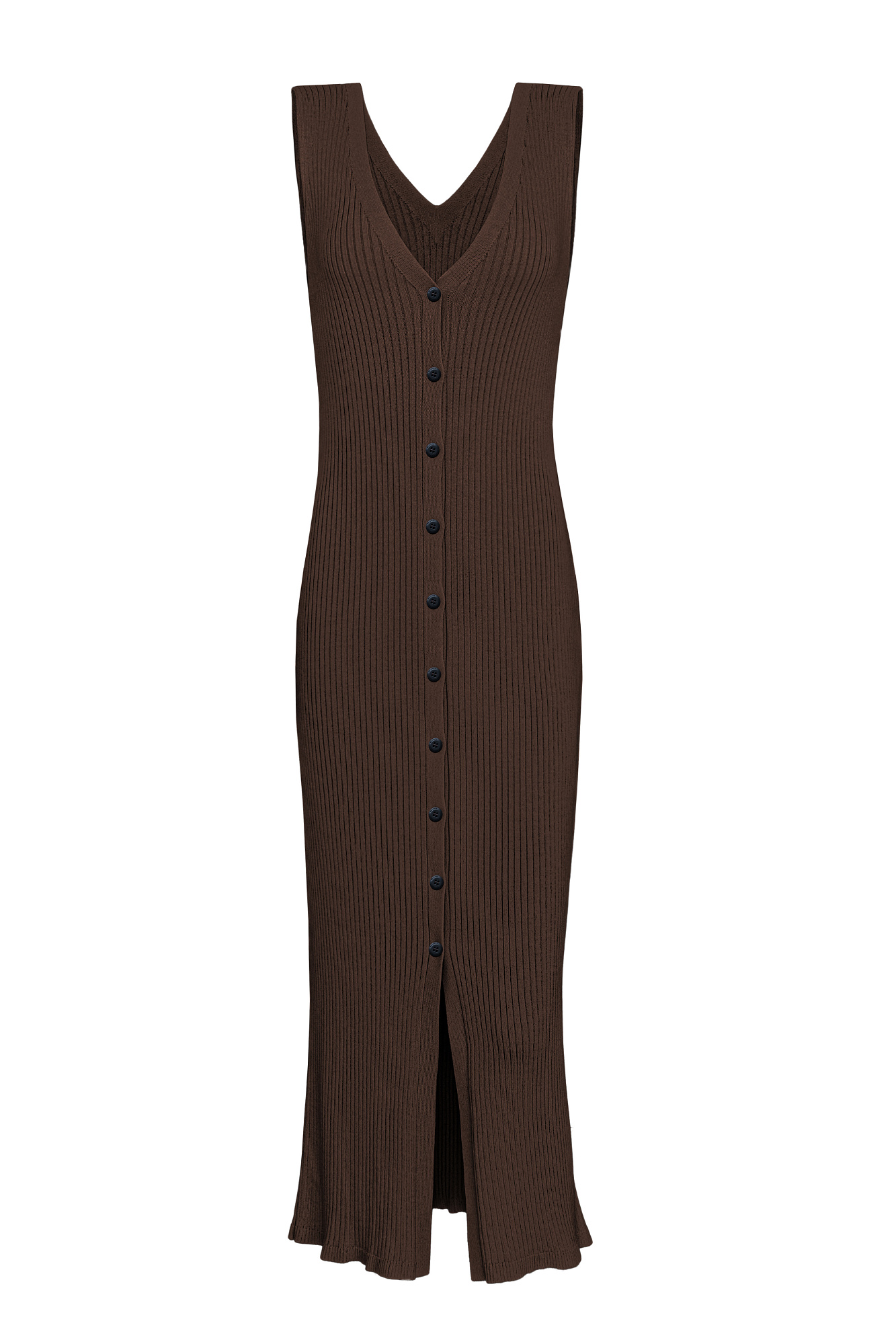 Трикотажное платье-жилет длины миди из вискозы. Модель приталенного силуэта, без рукавов, глубоким V-образным вырезом и застежкой на пуговицы по всей длине. Изделие выполнено в рубчик.