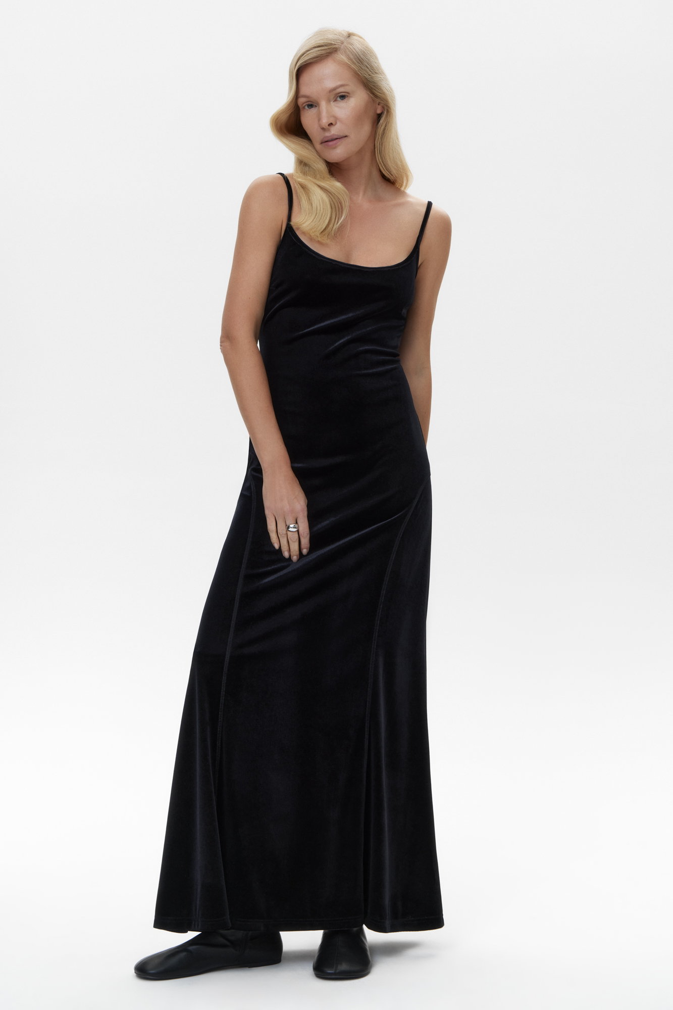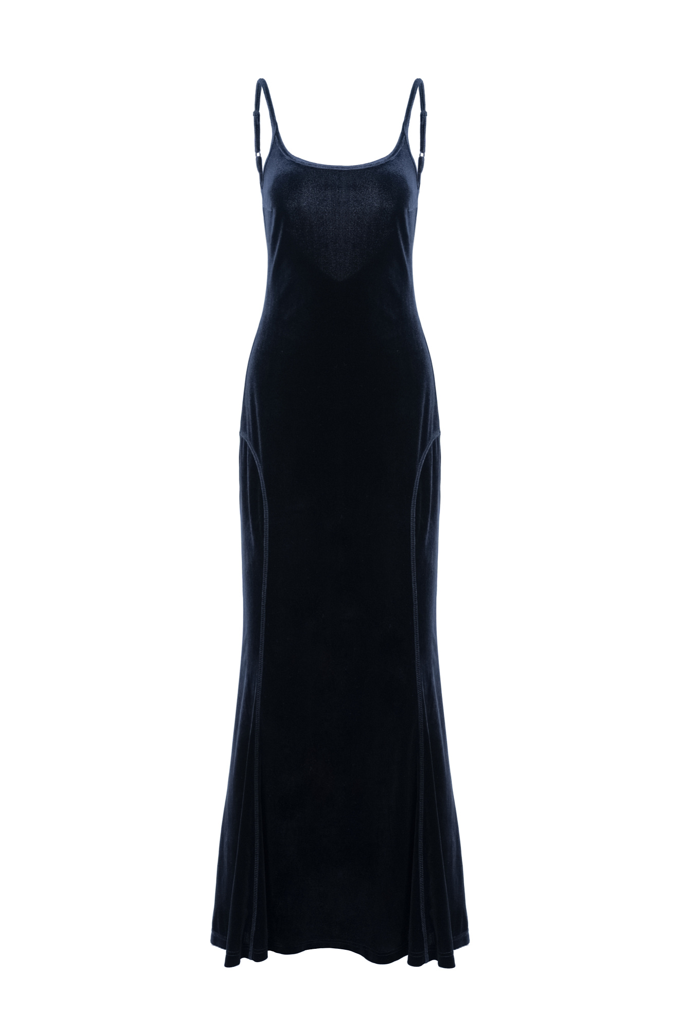 Бархатное платье длины макси из полиамида с добавлением вискозы. Модель приталенного силуэта, без рукавов, на тонких регулируемых бретельках и глубоким вырезом на спине.