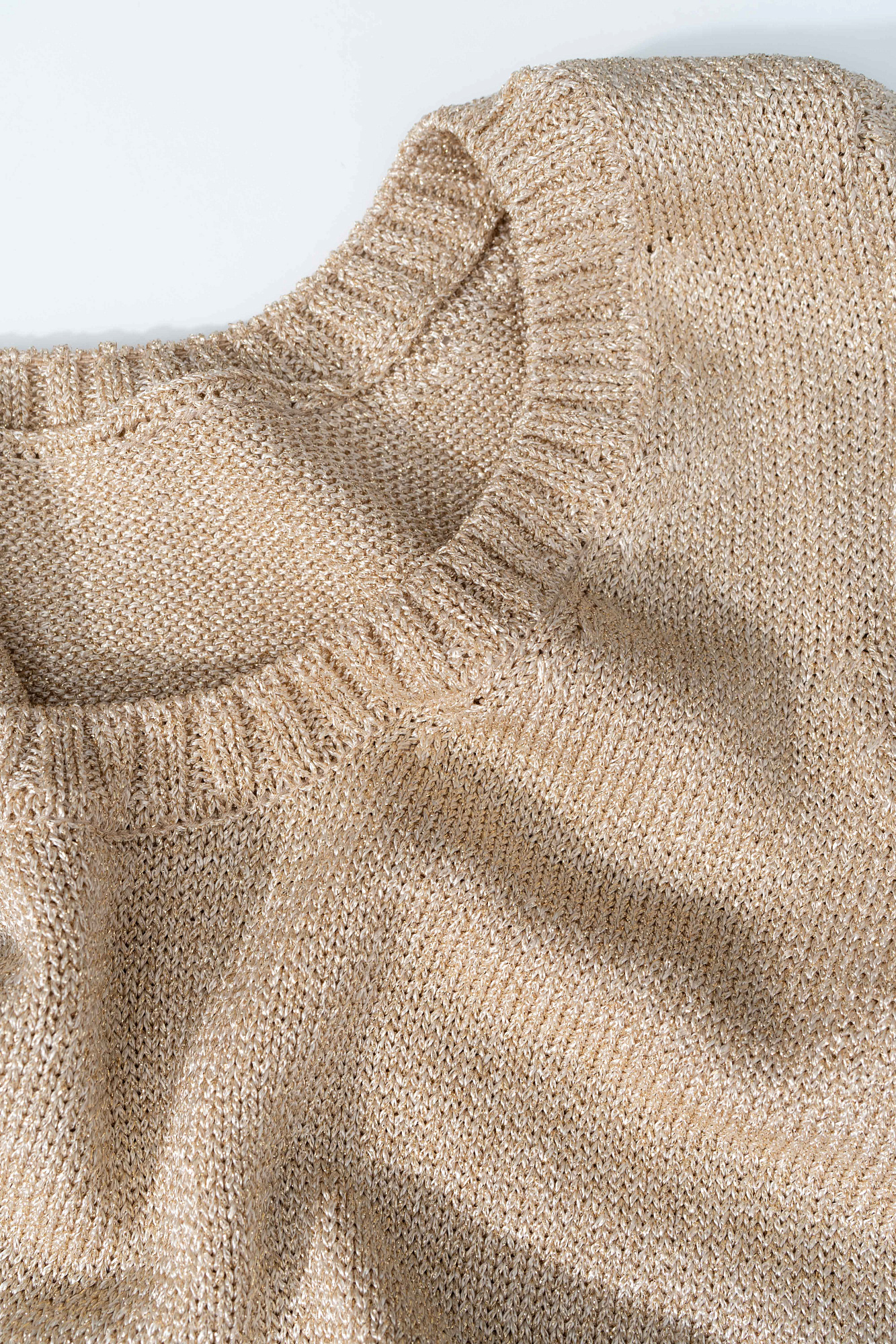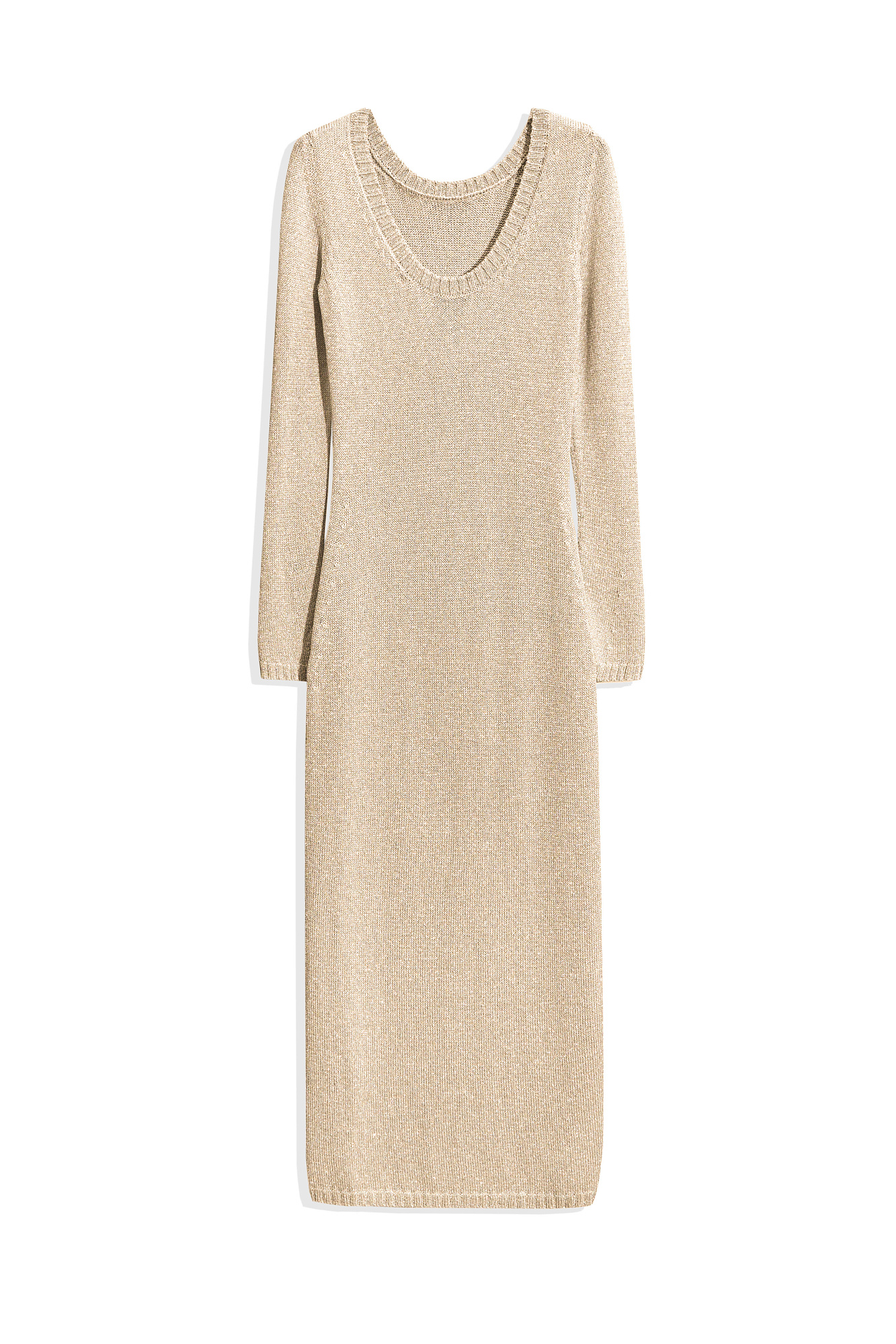 Трикотажное платье длины макси из вискозы с добавлением люрекса. Модель по фигуре с длинными рукавами, круглым вырезом горловины, вырезом на спине и разрезом на подоле сбоку. Края изделия выполнены в рубчик.