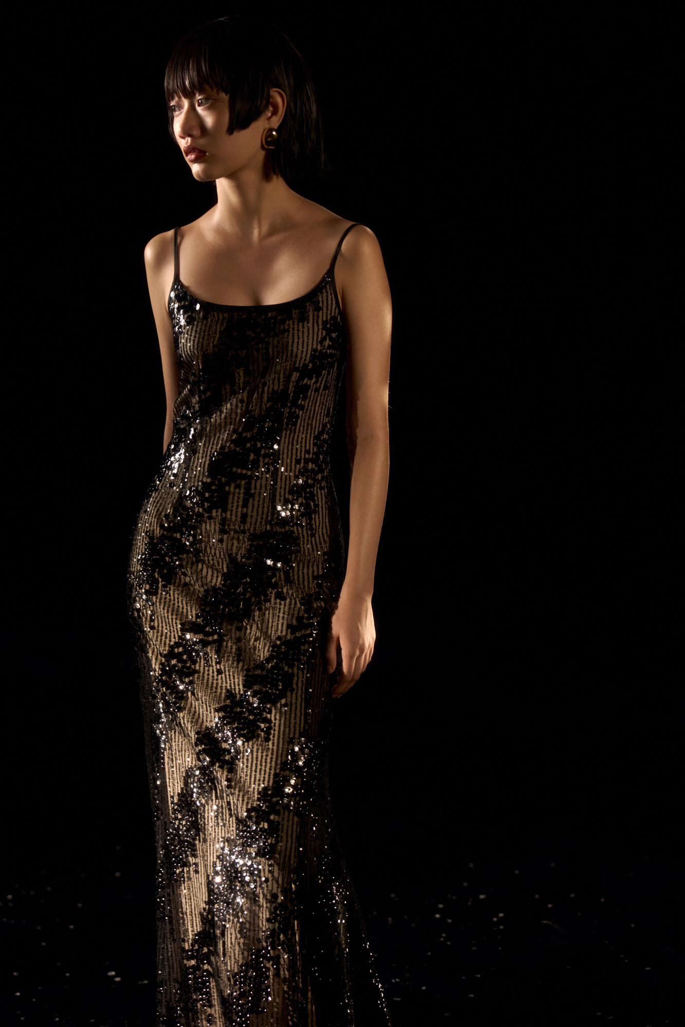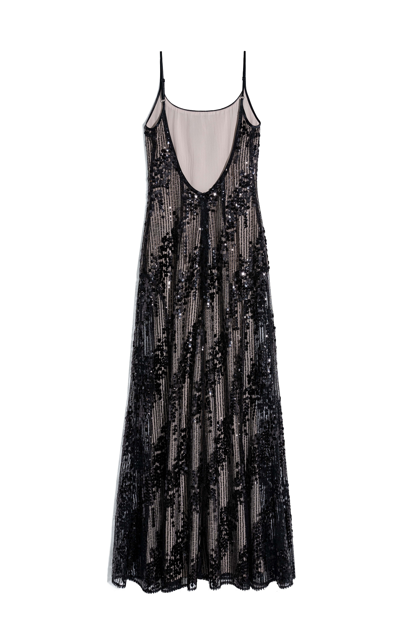 Платье с пайетками на тонких бретелях. Модель приталенного силуэта длины макси с вырезом на спине и застежкой на молнию.