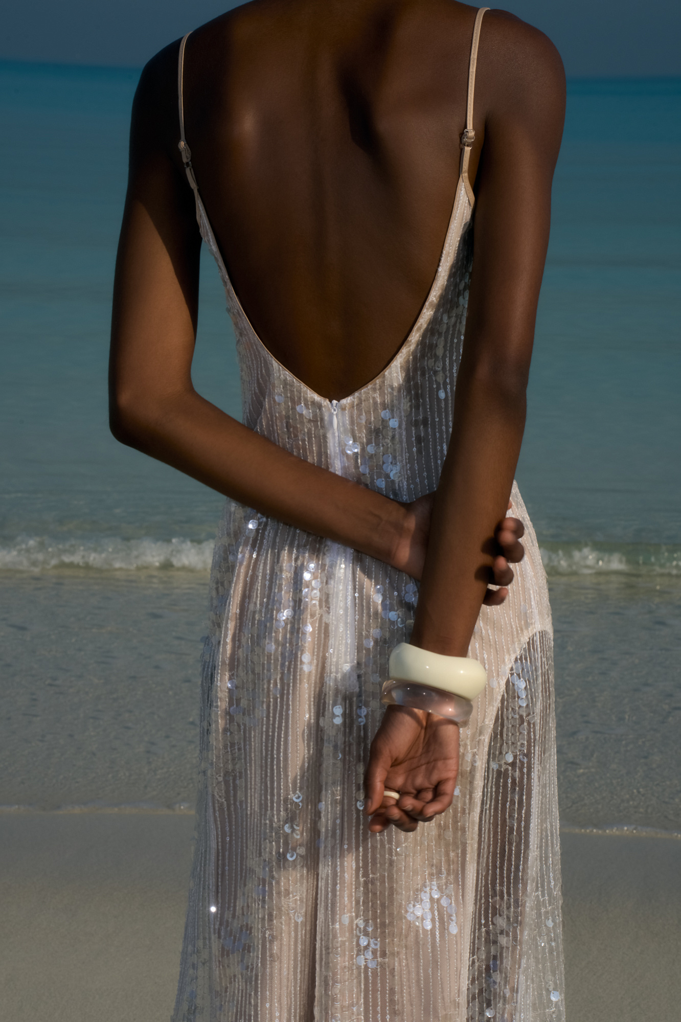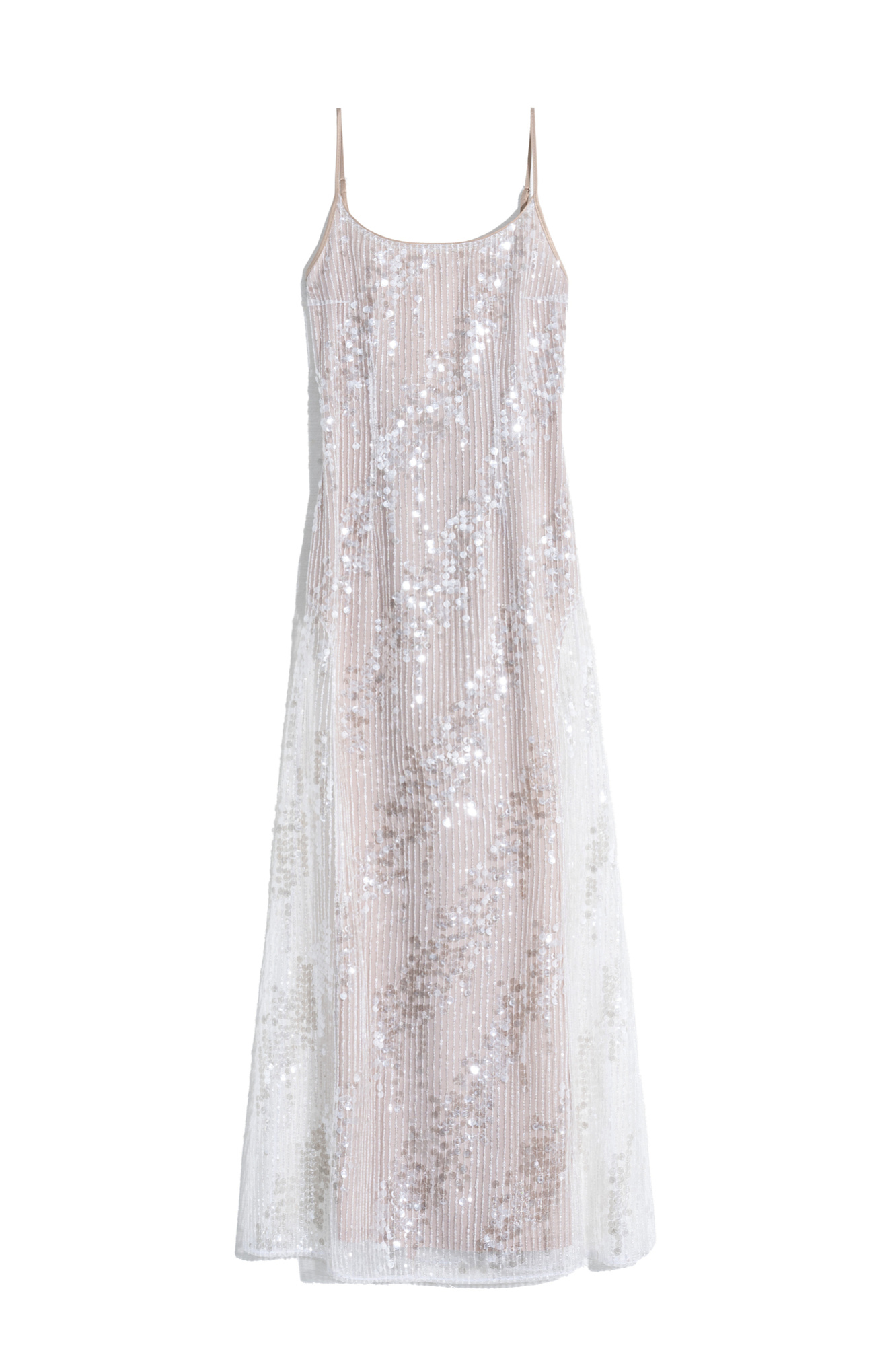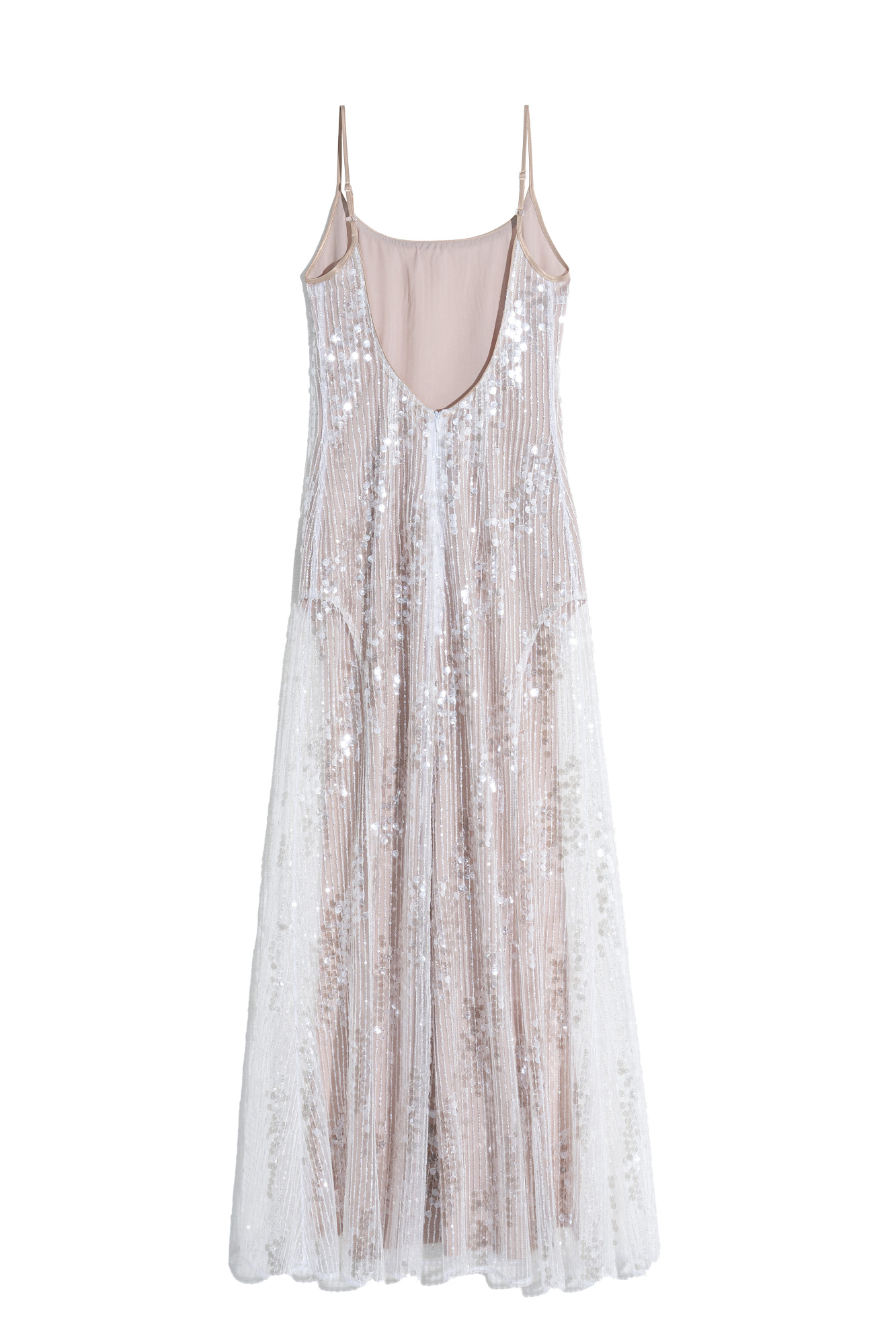 Платье с пайетками на тонких бретелях. Модель приталенного силуэта длины макси с вырезом на спине и застежкой на молнию.