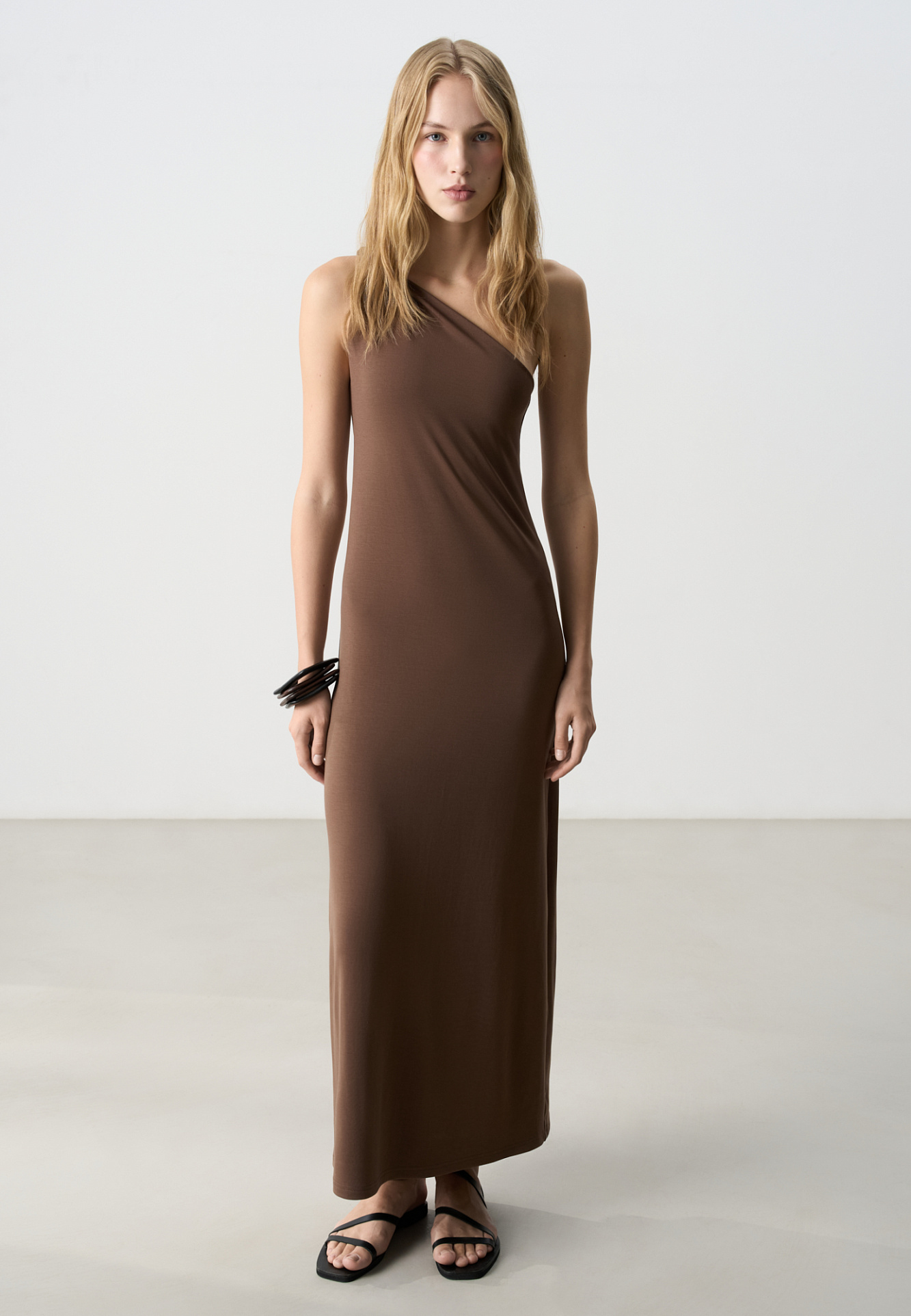 Платье длины макси из модала. Модель свободного кроя, с асимметричным верхом и перекрученной лямкой на одно плечо.