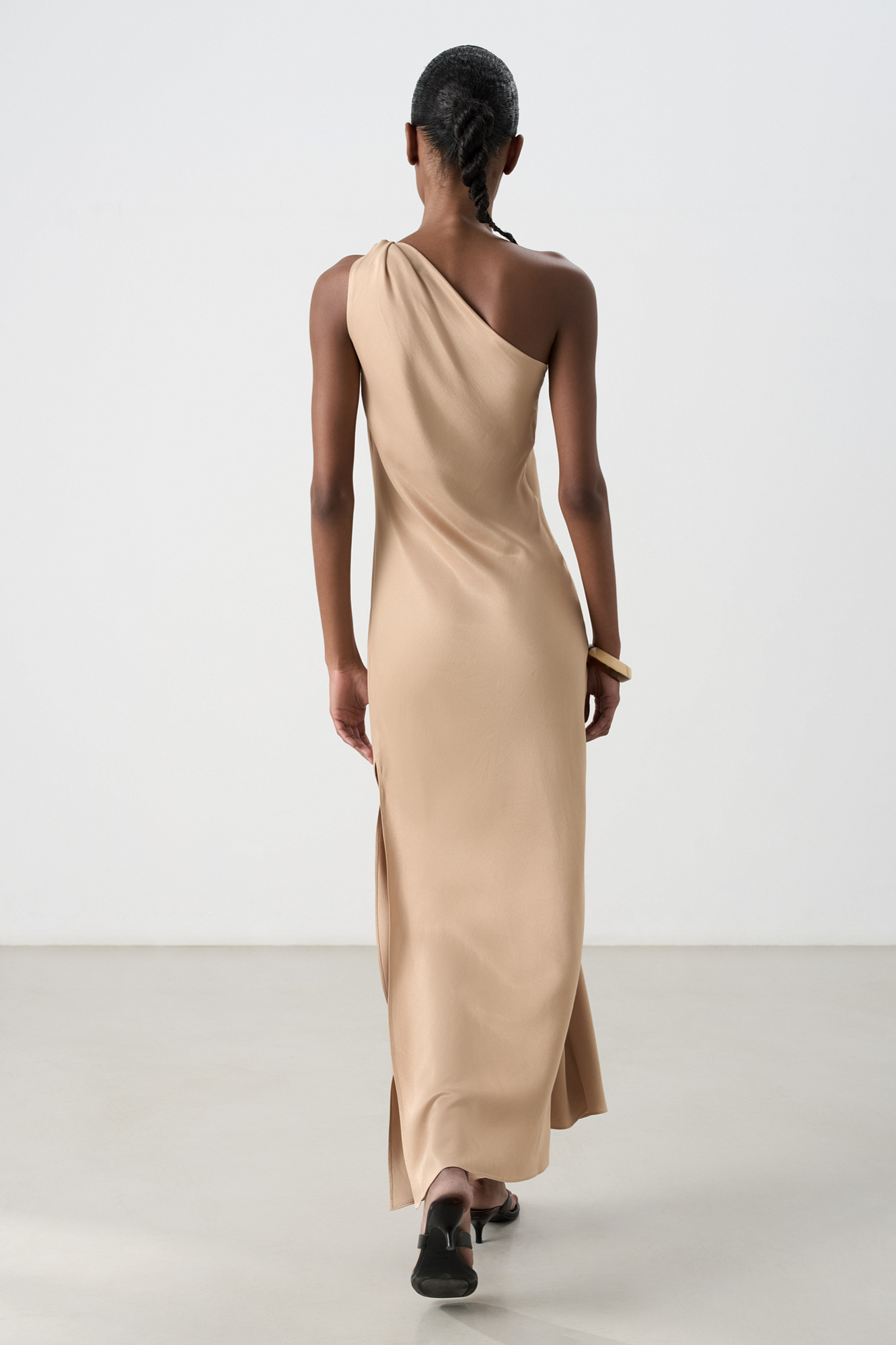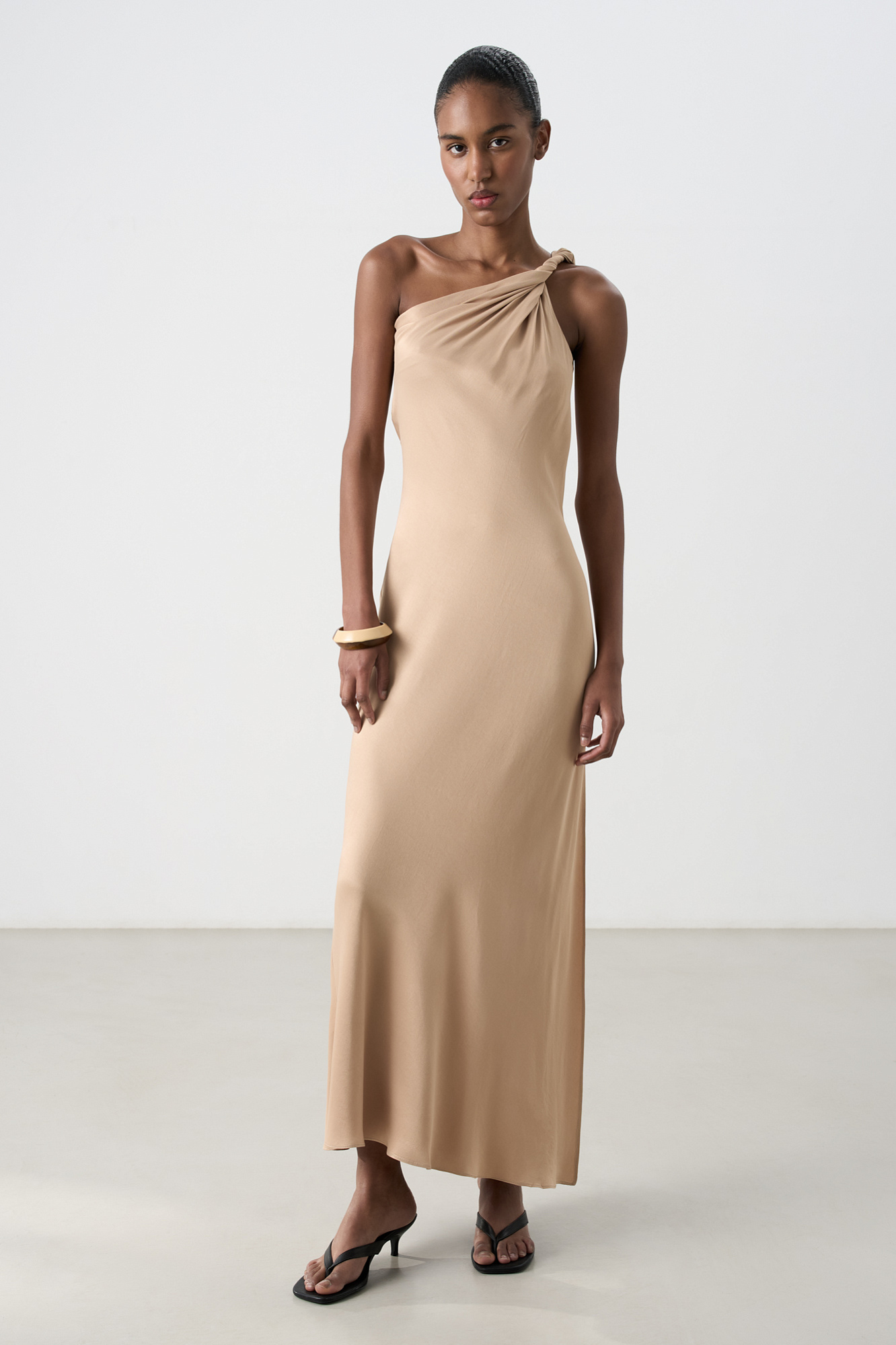 Платье длины макси из атласной вискозы. Модель приталенного силуэта, без рукавов, с перекрученной лямкой на одно плечо и разрезом сбоку.