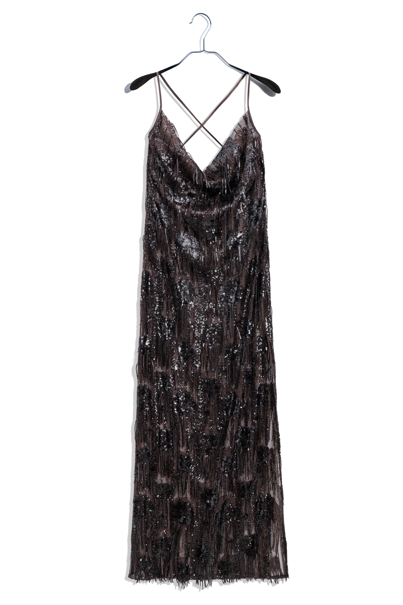 Платье длины макси с геометрическим орнаментом и бахромой, выполненными пайетками. Модель на тонких бретелях, без застежки. Изделие выполнено без подкладки.