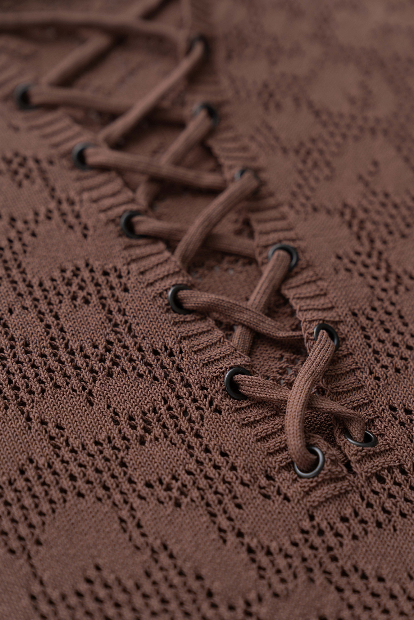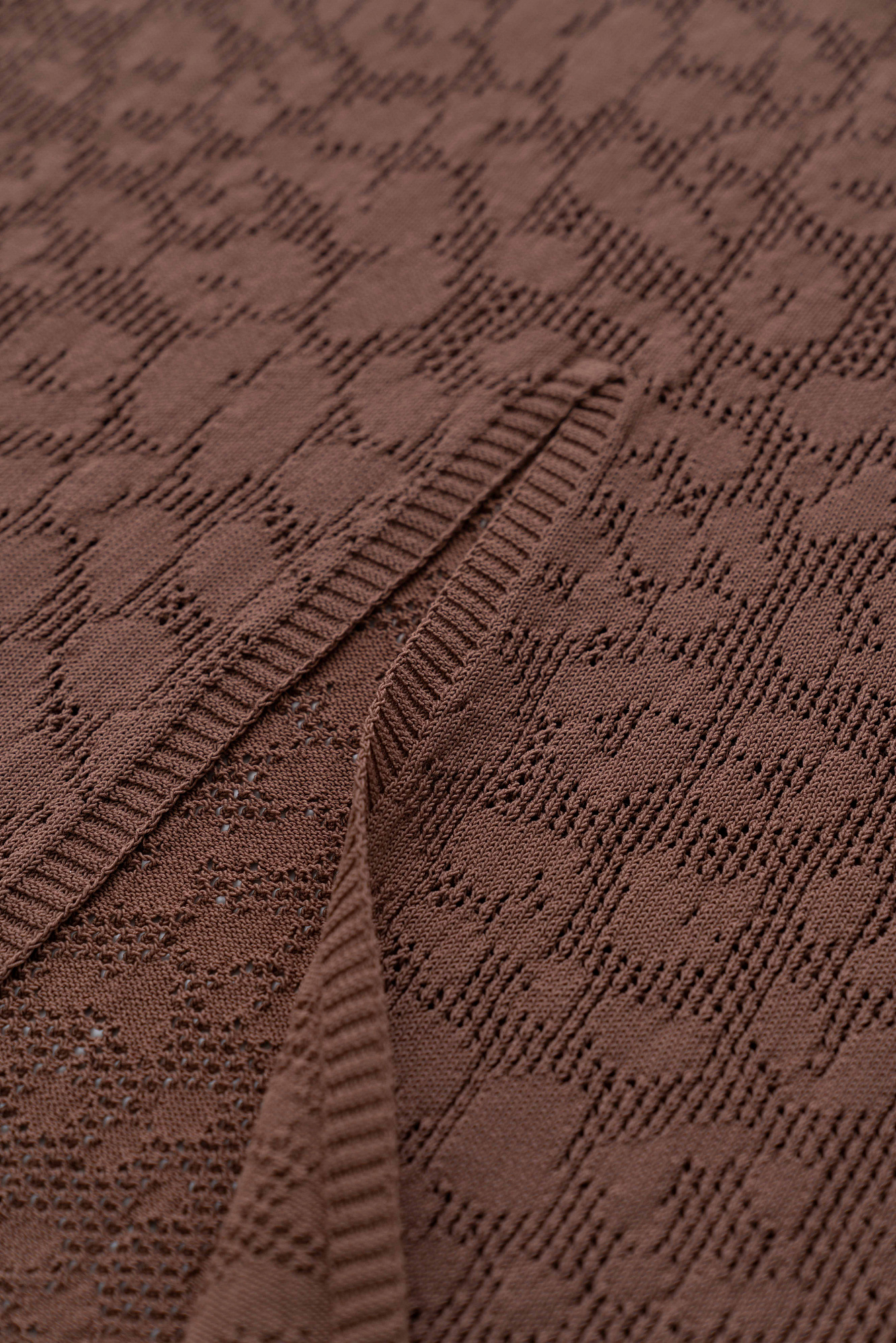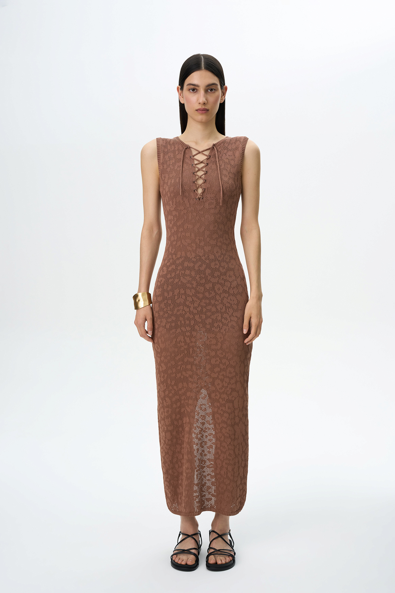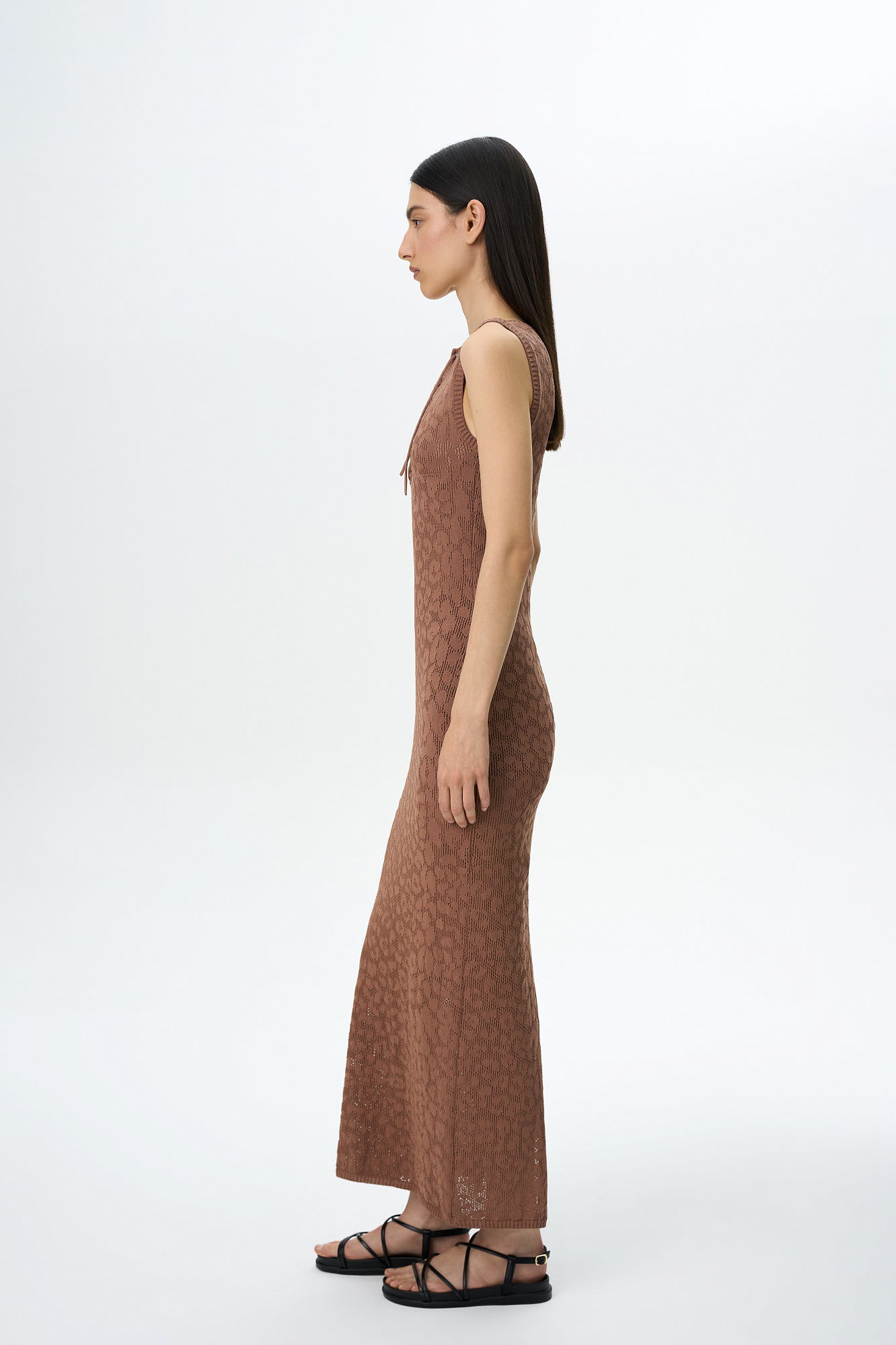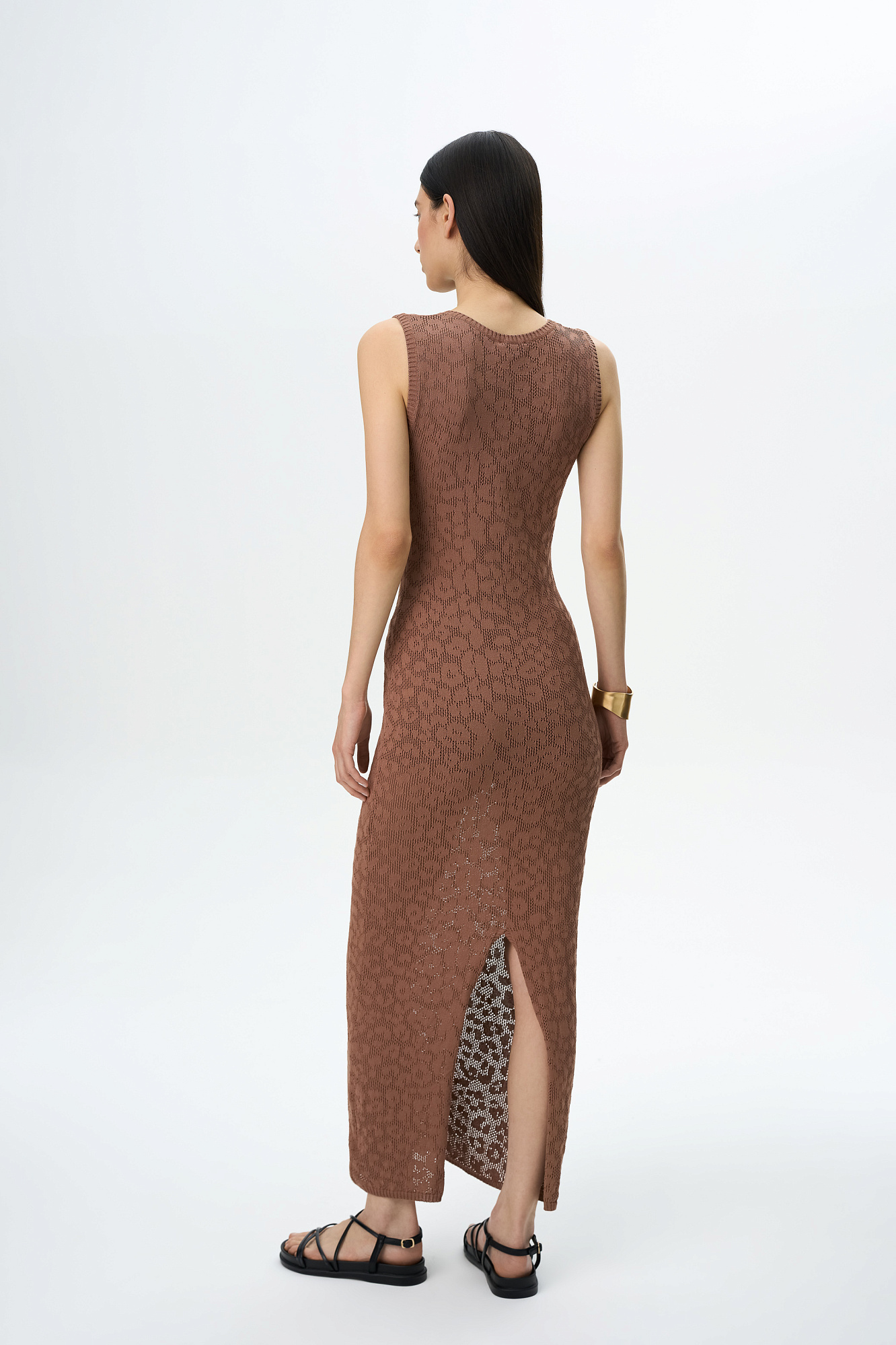 Трикотажное ажурное платье длины макси из органического хлопка. Модель приталенного силуэта, без рукавов, разрезом сзади и на груди. Изделие декорировано жаккардовым рисунком, имитирующим пятна леопарда.