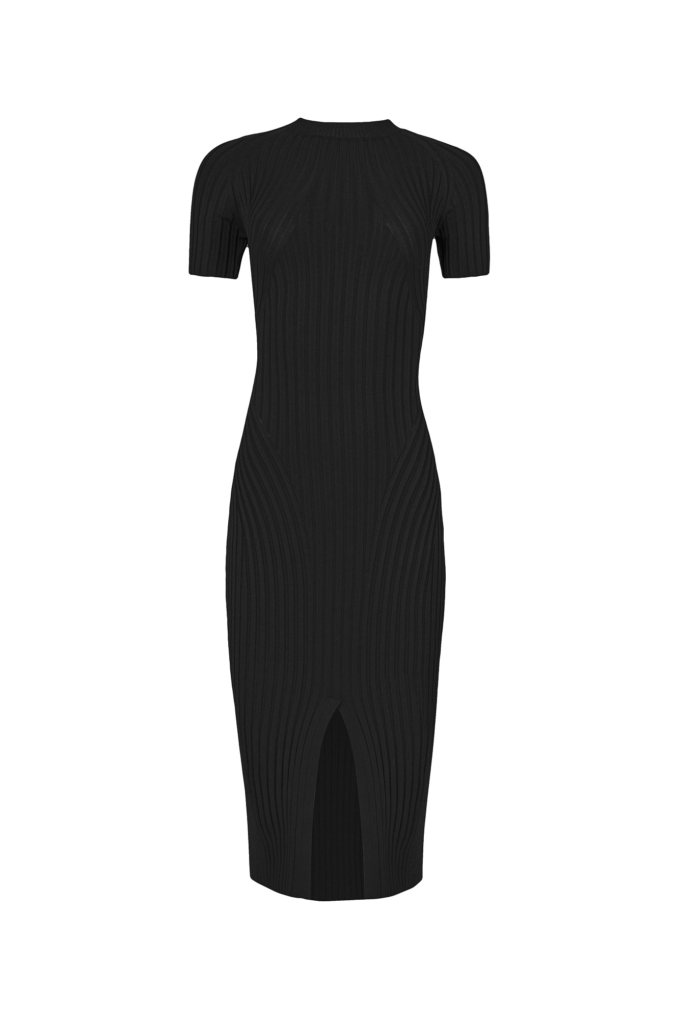 Трикотажное платье по фигуре в широкий рубчик с перекрутом на спине и разрезом спереди.