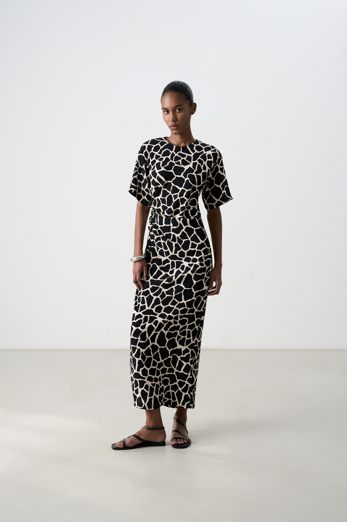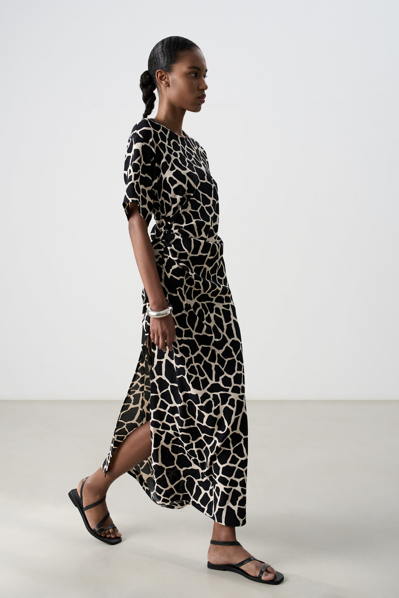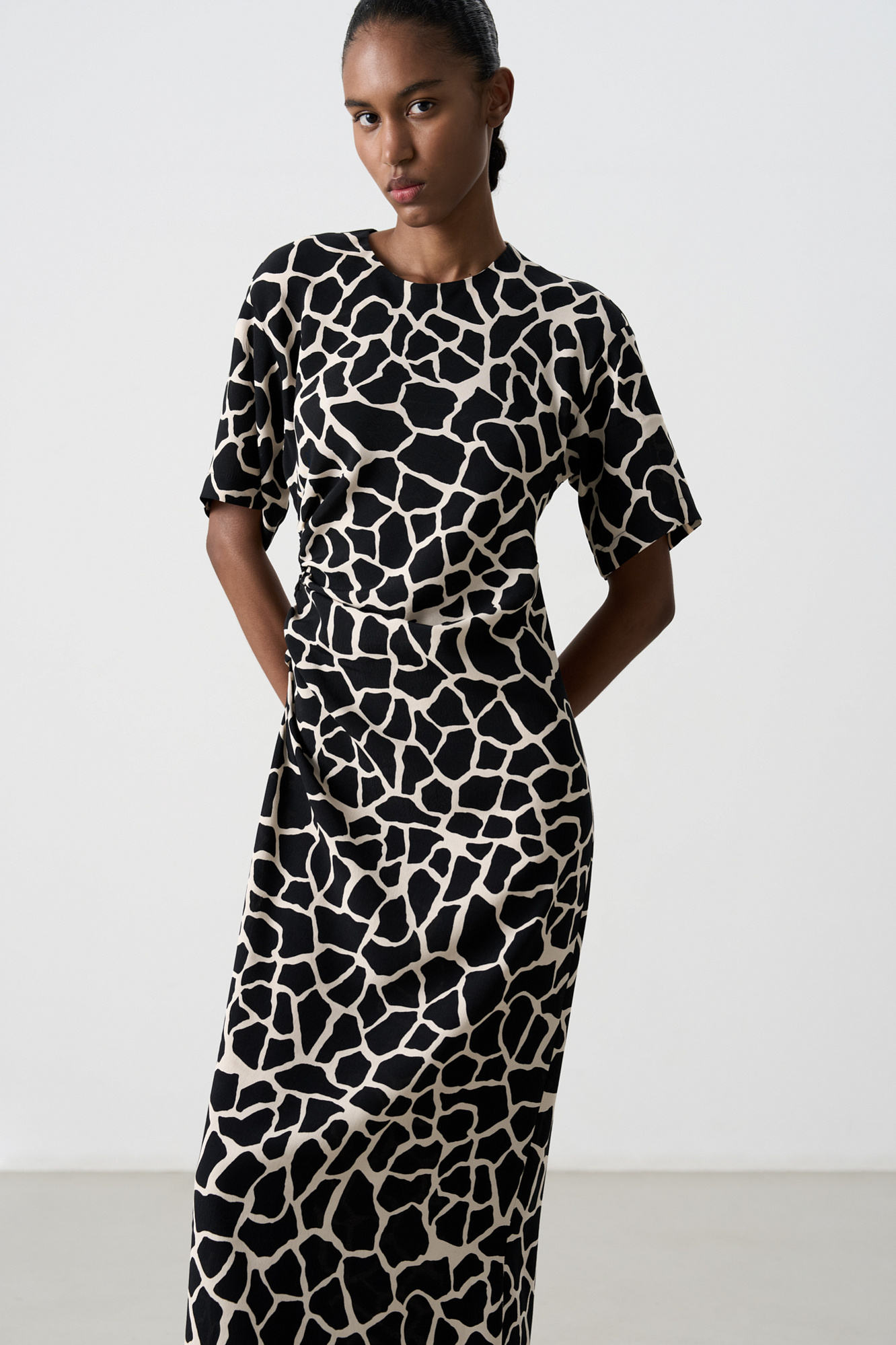 Платье длины миди из 100% вискозы с анималистичным принтом, имитирующим пятна жирафа. Модель приталенного силуэта, со спущенной линией плеча, коротким рукавом и круглым вырезом горловины. Изделие декорировано драпировкой сбоку.