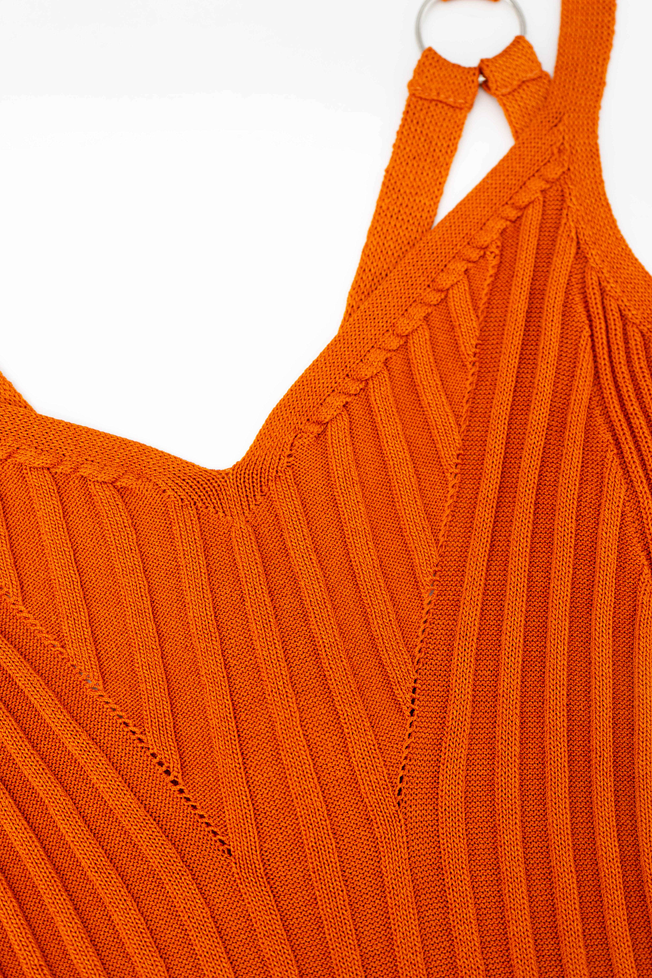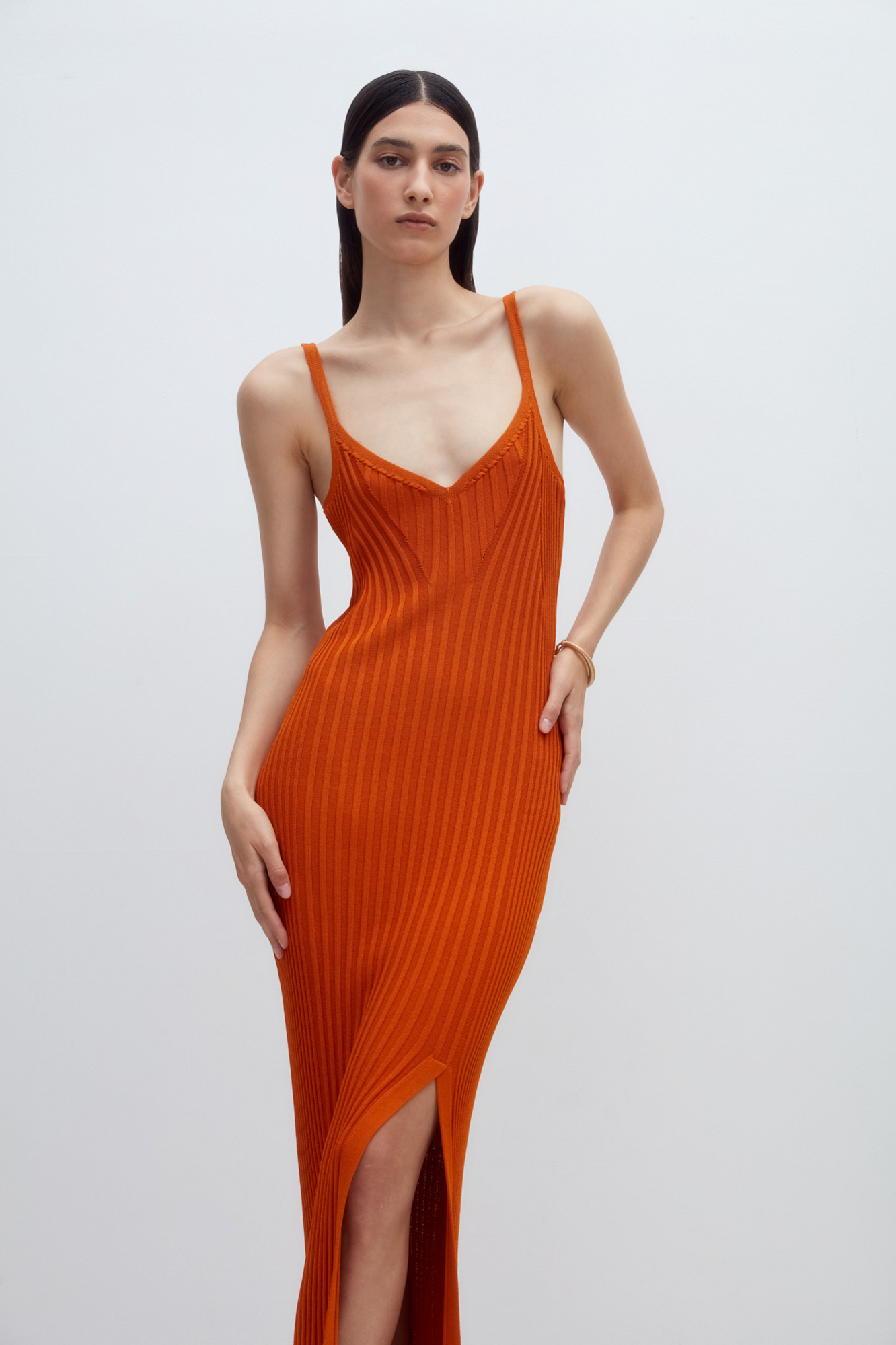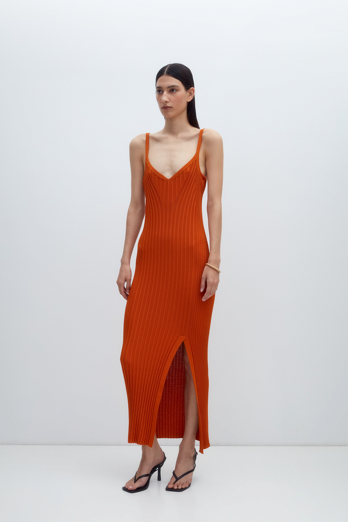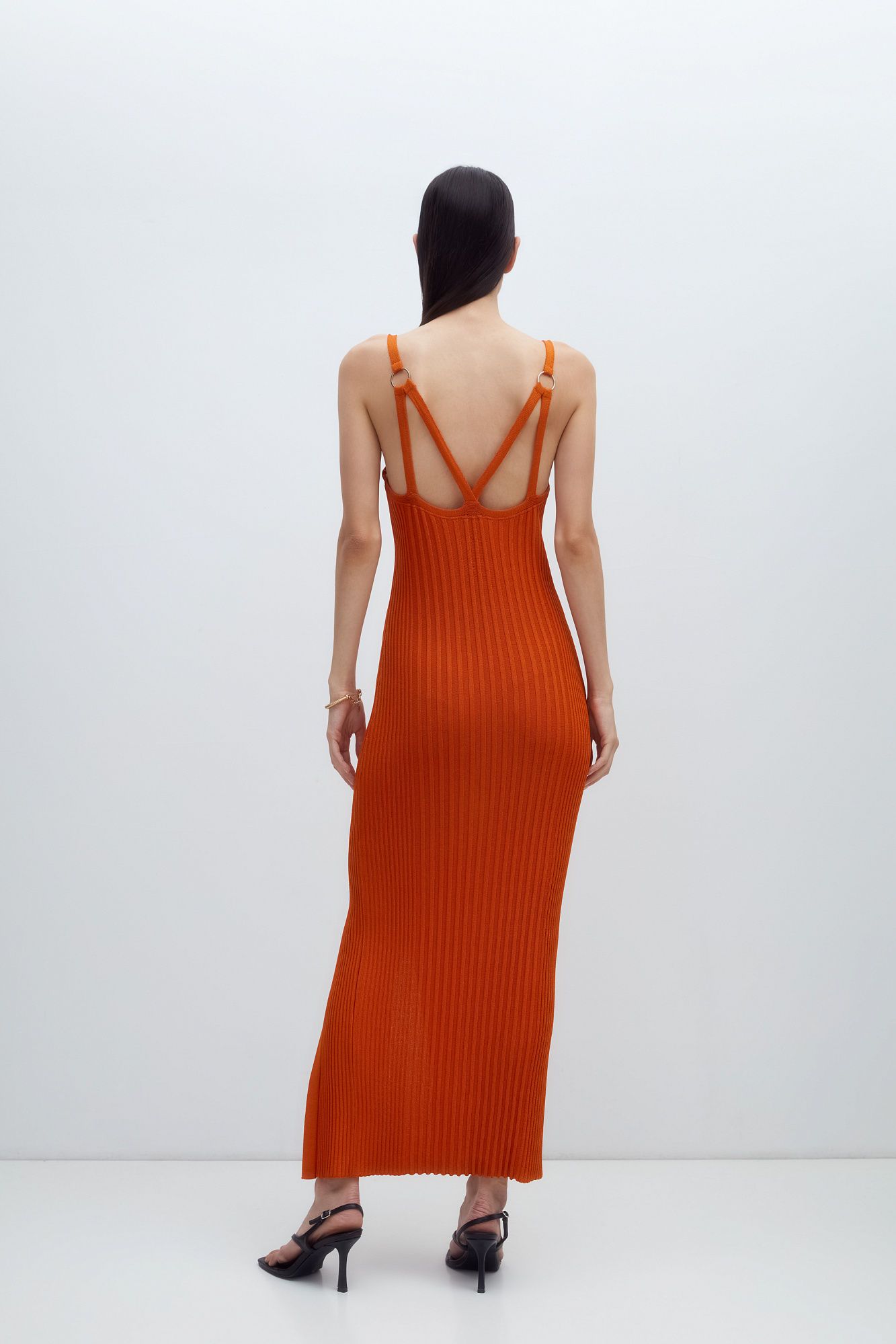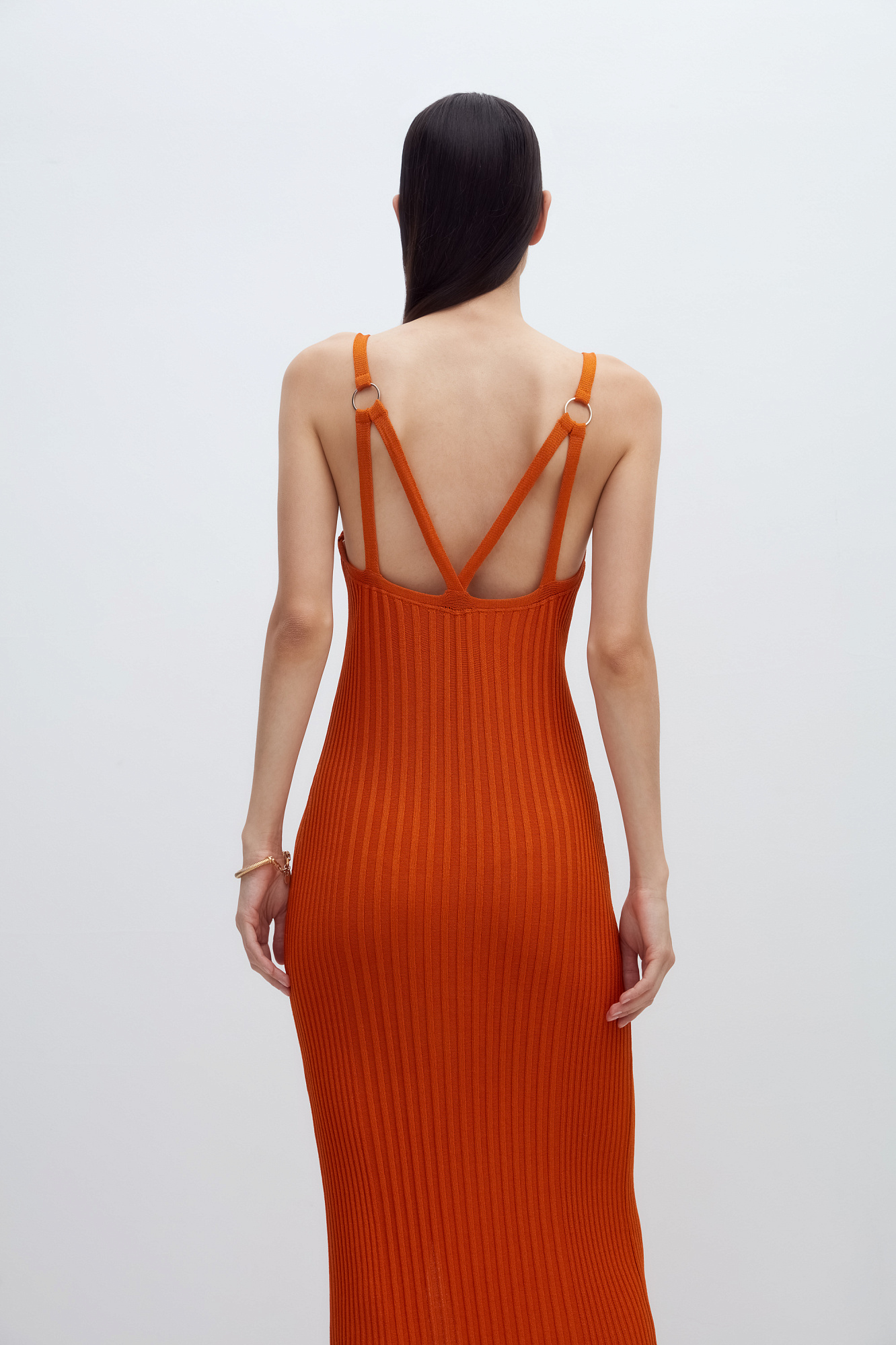 Трикотажное платье в фактурный рубчик прилегающего силуэта. Длина миди с разрезом сбоку. Перекрестные бретели с кольцами на спине.