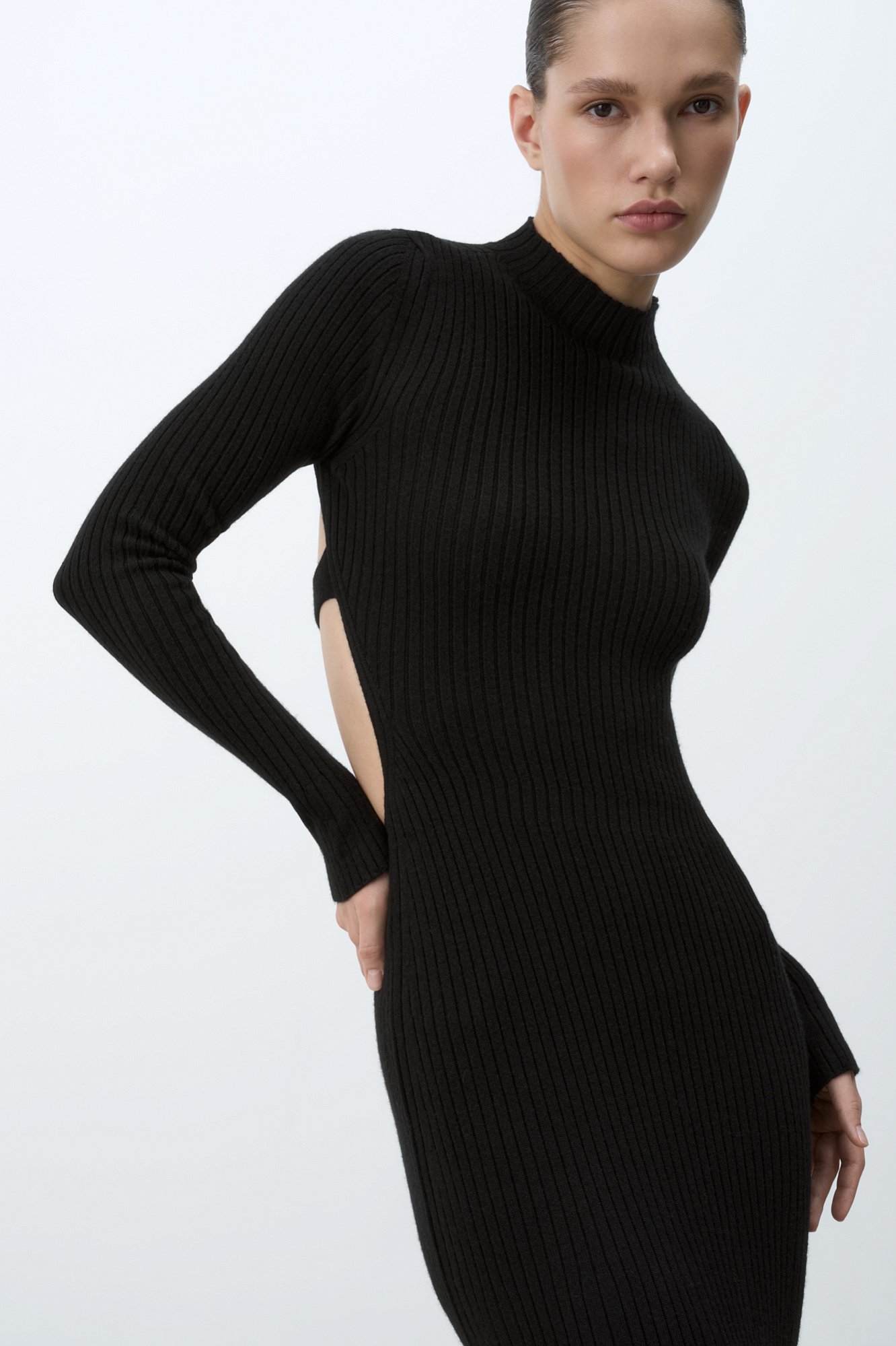 Трикотажное платье из кашемира и шерсти. Модель приталенного силуэта с длинными рукавами, расклешенными рукавами и невысоким воротником. Изделие декорировано глубоким вырезом на спине.