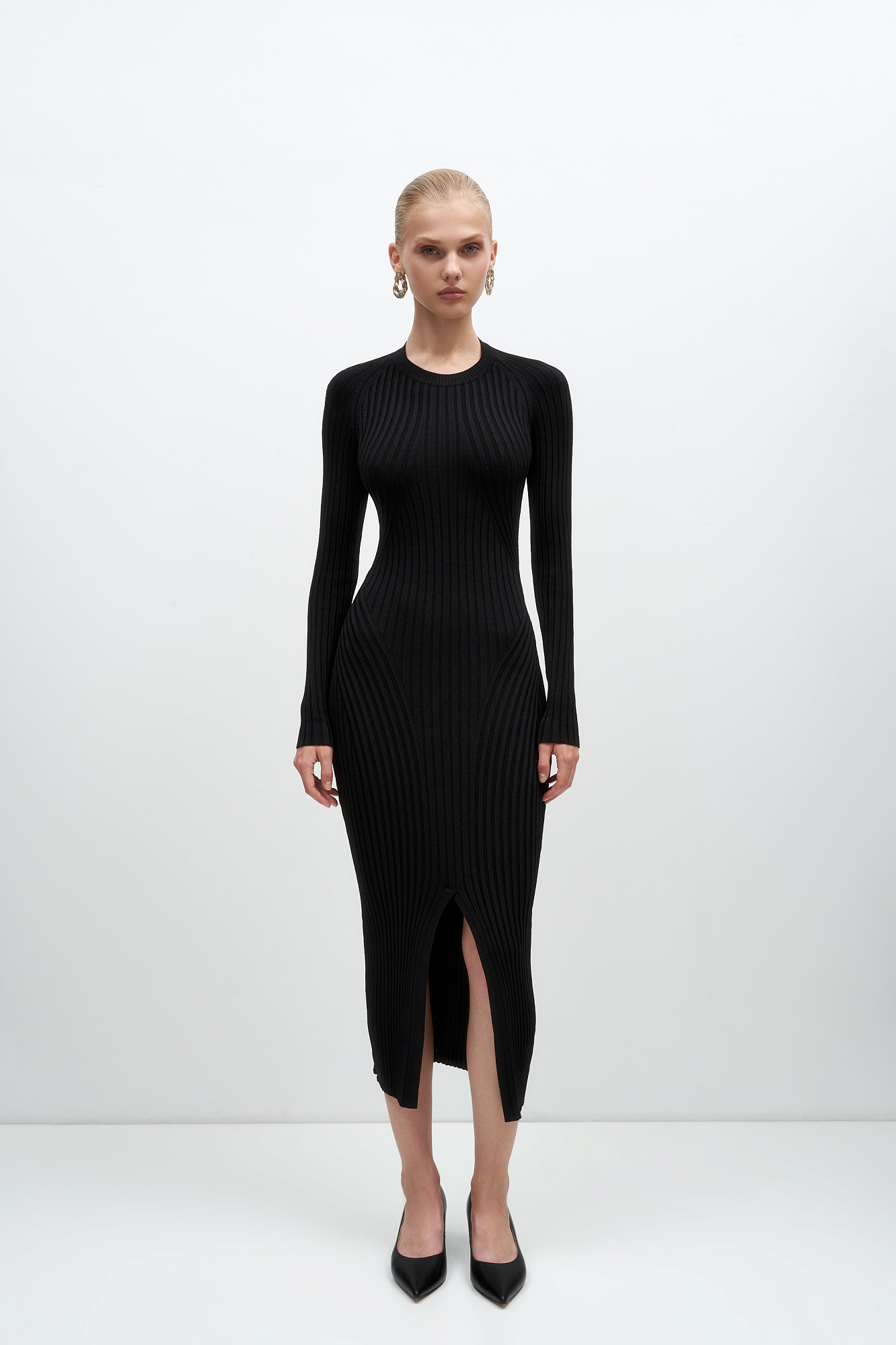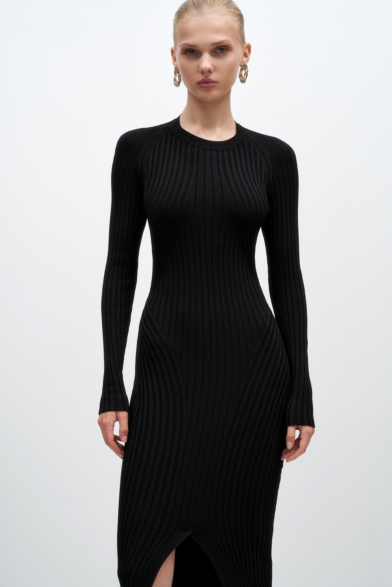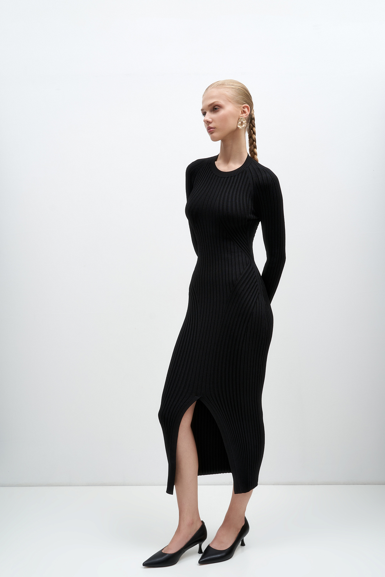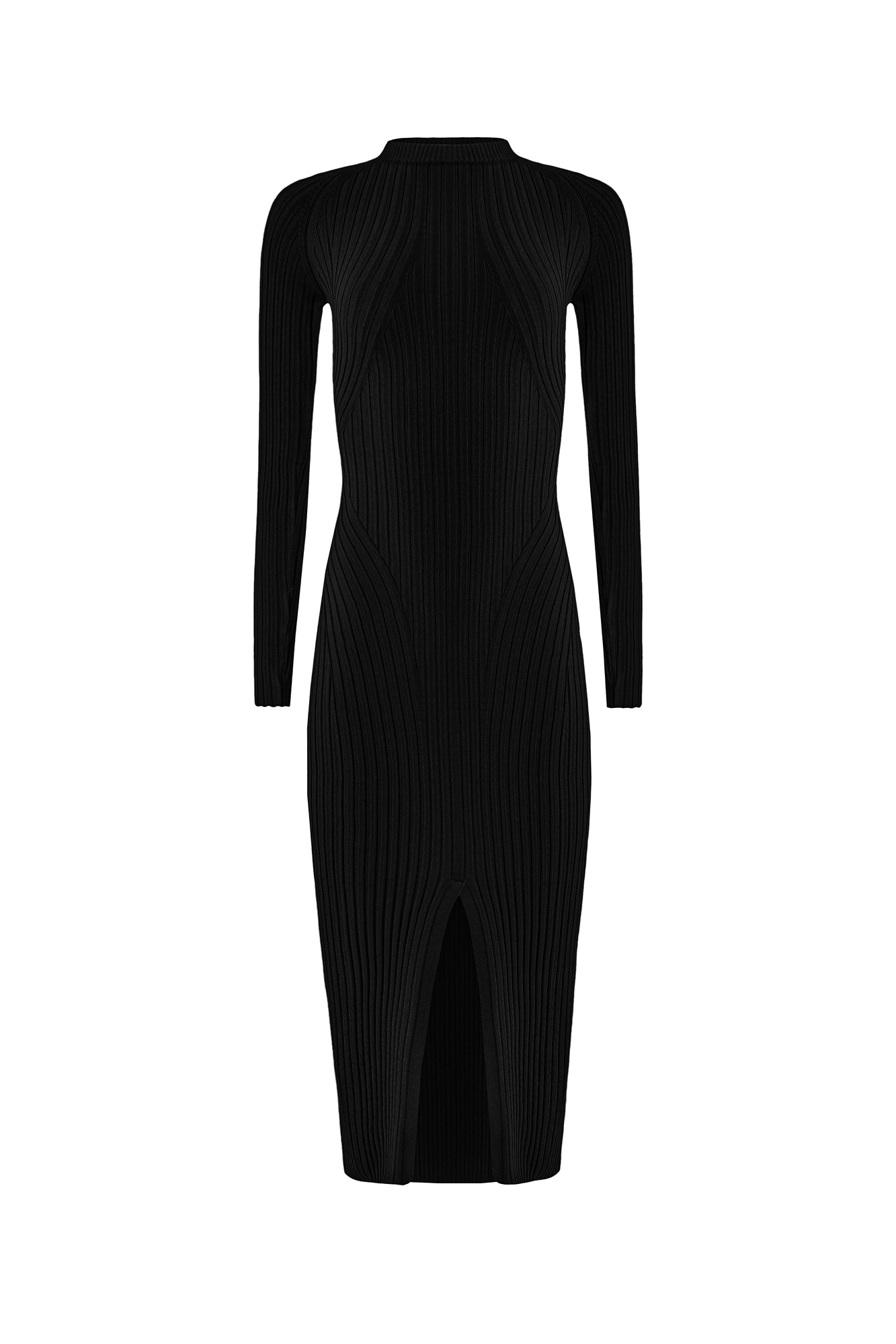 Платье из вискозы с длинным рукавом, разрезом спереди и перекрученной спинкой.