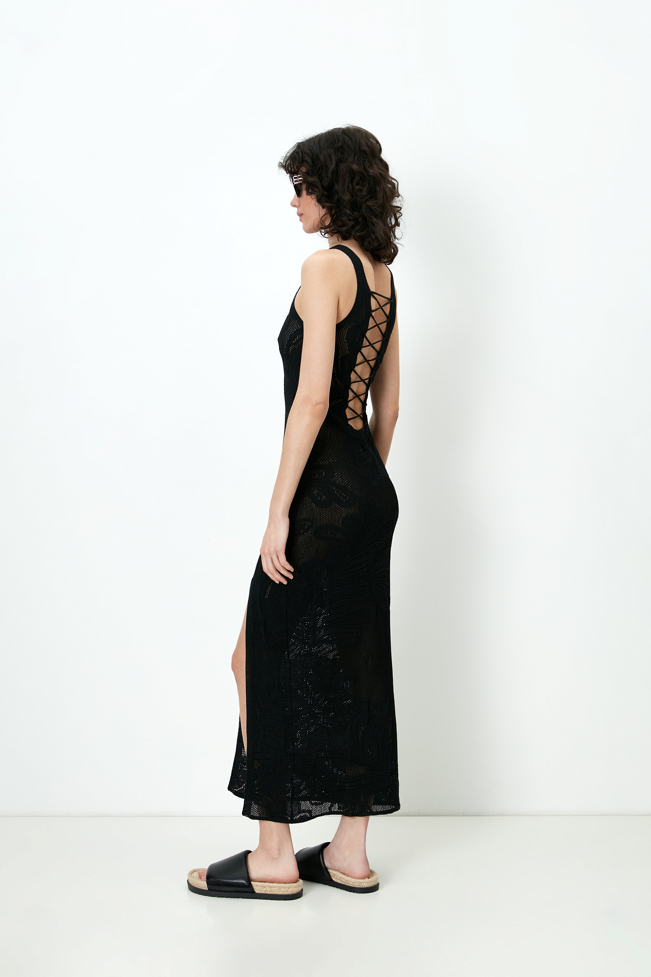 Трикотажное платье длины миди из органического хлопка. Модель приталенного силуэта, без рукавов. круглым вырезом горловины, разрезом спереди и шнуровкой на спине. Изделие декорировано растительным орнаментом.