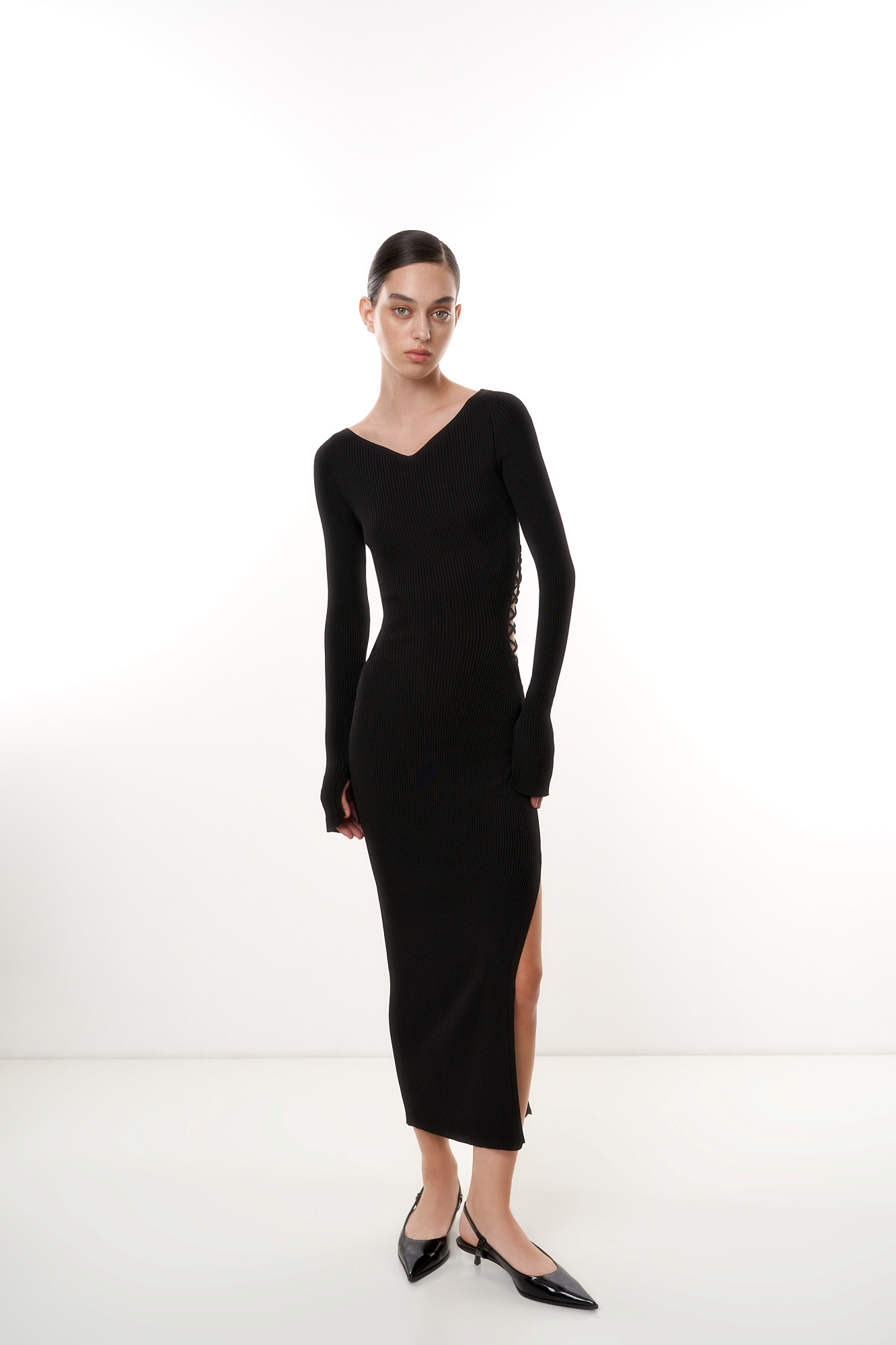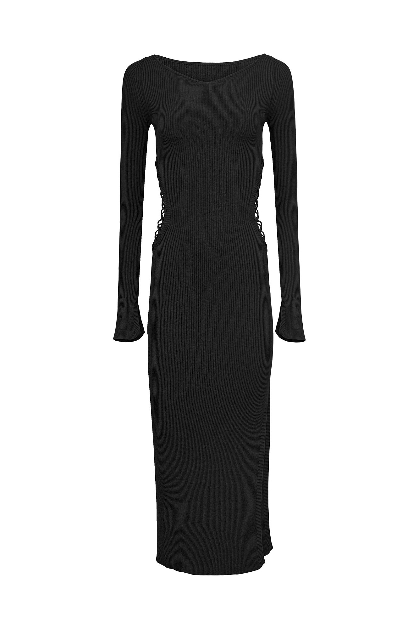 Трикотажное платье из вискозы с разрезом сбоку и шнуровкой по бокам. Модель приталенного силуэта длины миди с длинным рукавом и V-образным вырезом.