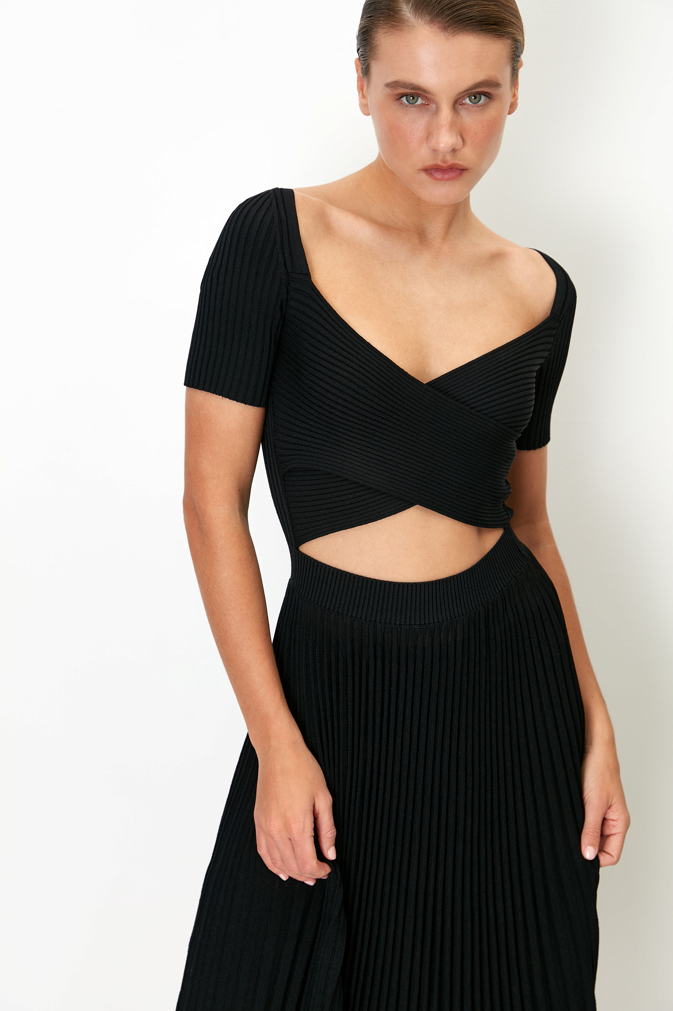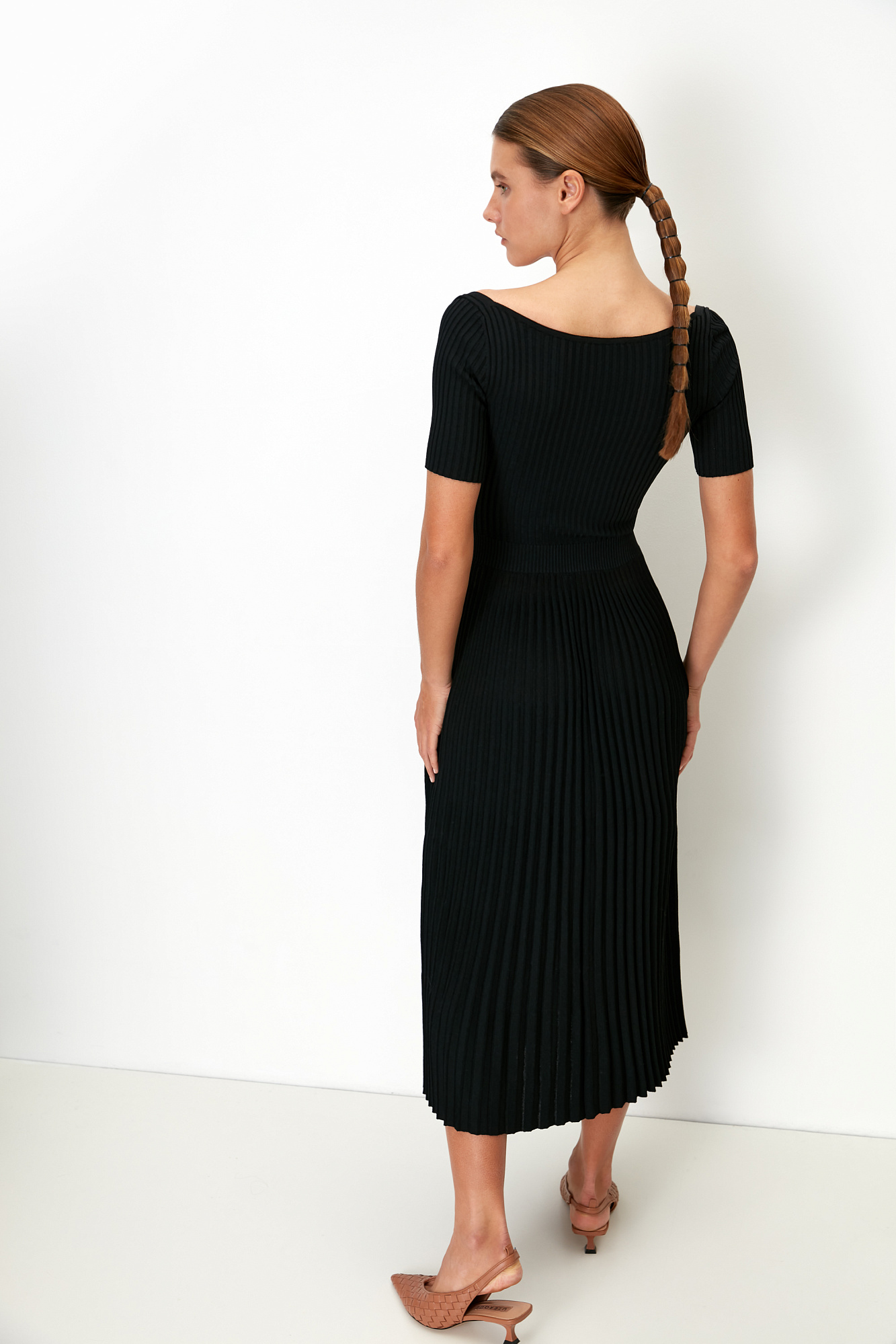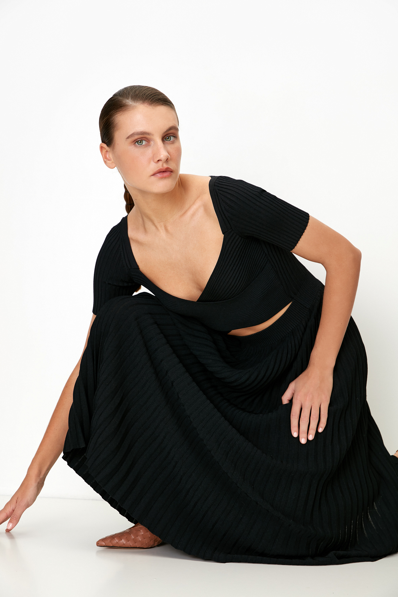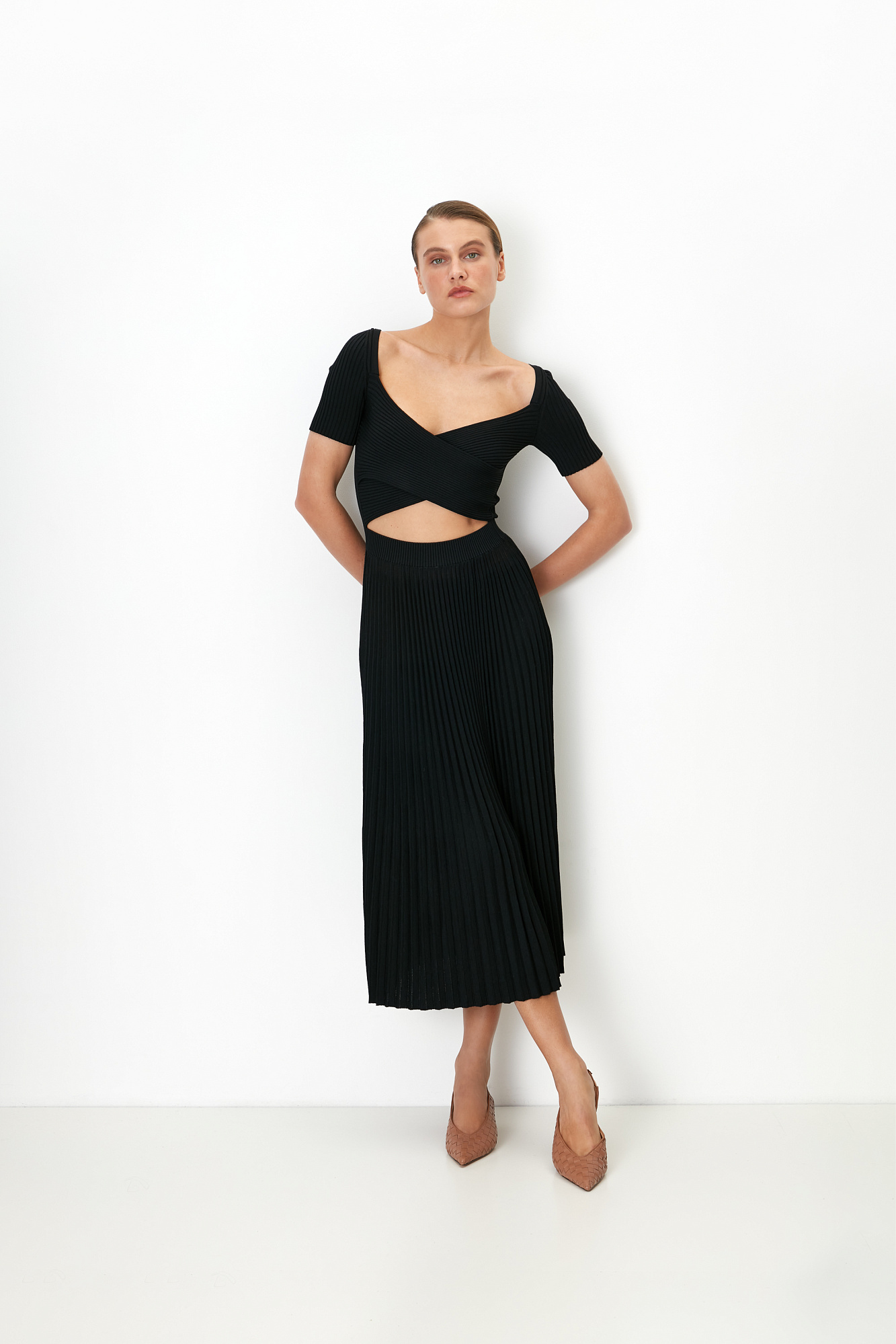 Трикотажное платье из плотной вискозы с юбкой плиссе. Короткие рукава, перекрещенные детали лифа.