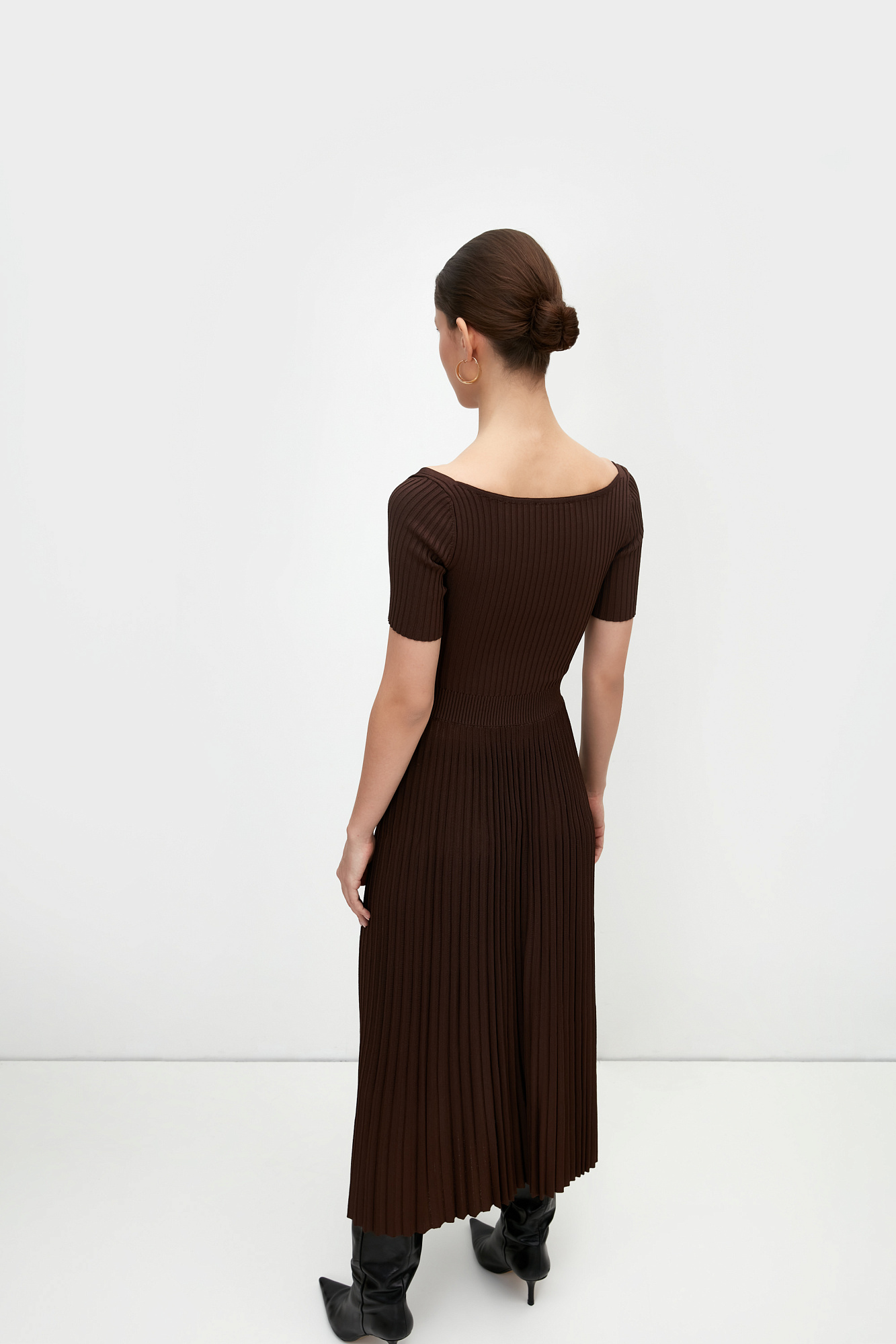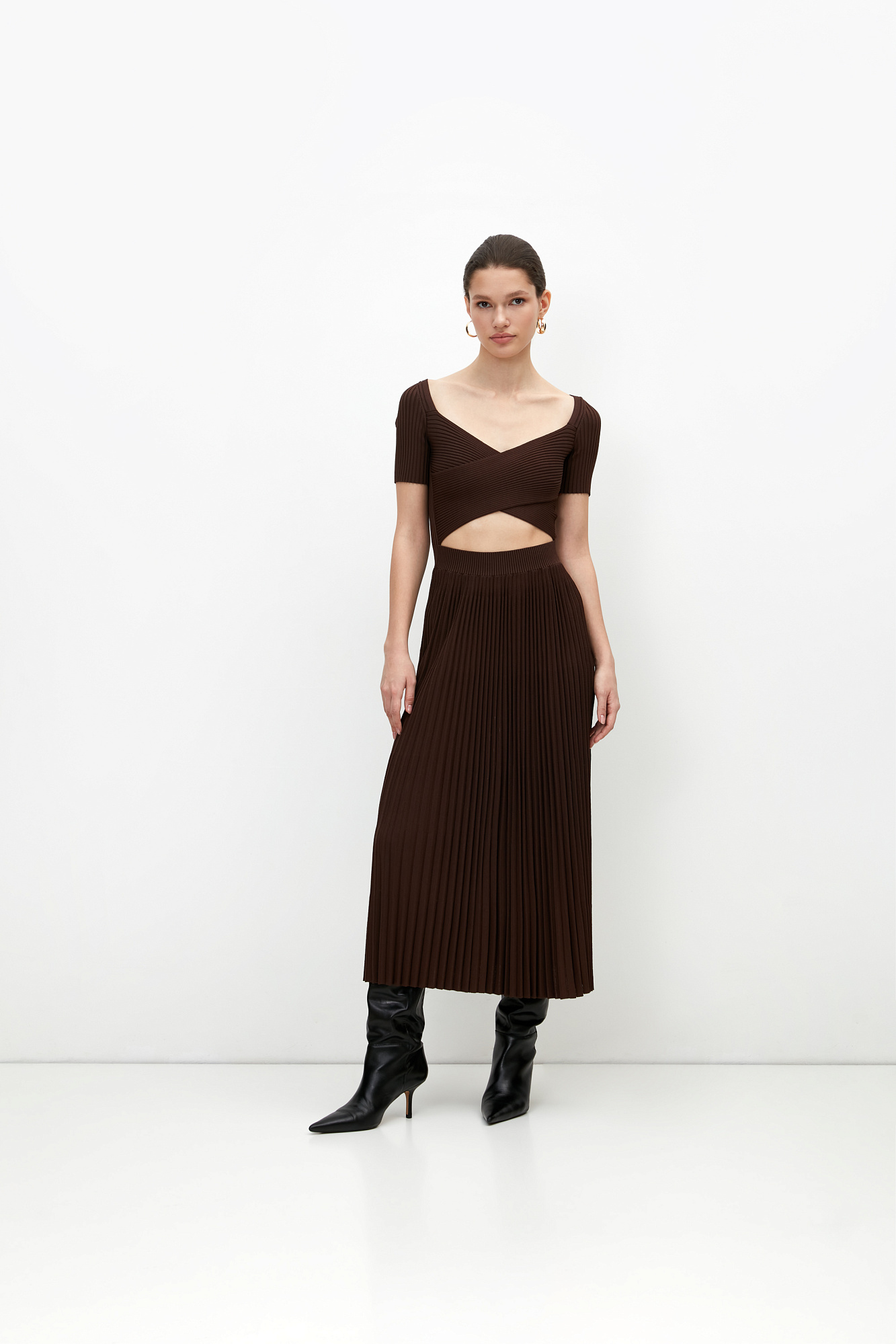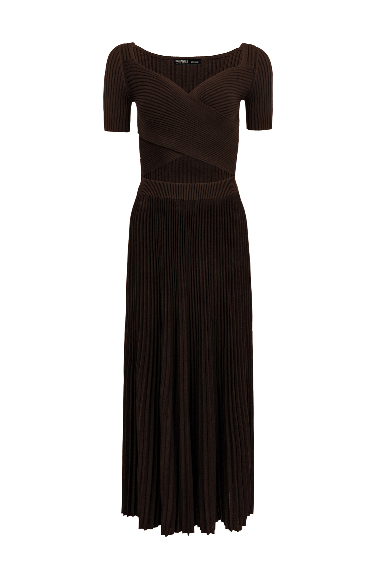 Трикотажное платье из плотной вискозы с юбкой плиссе. Короткие рукава, перекрещенные детали лифа.