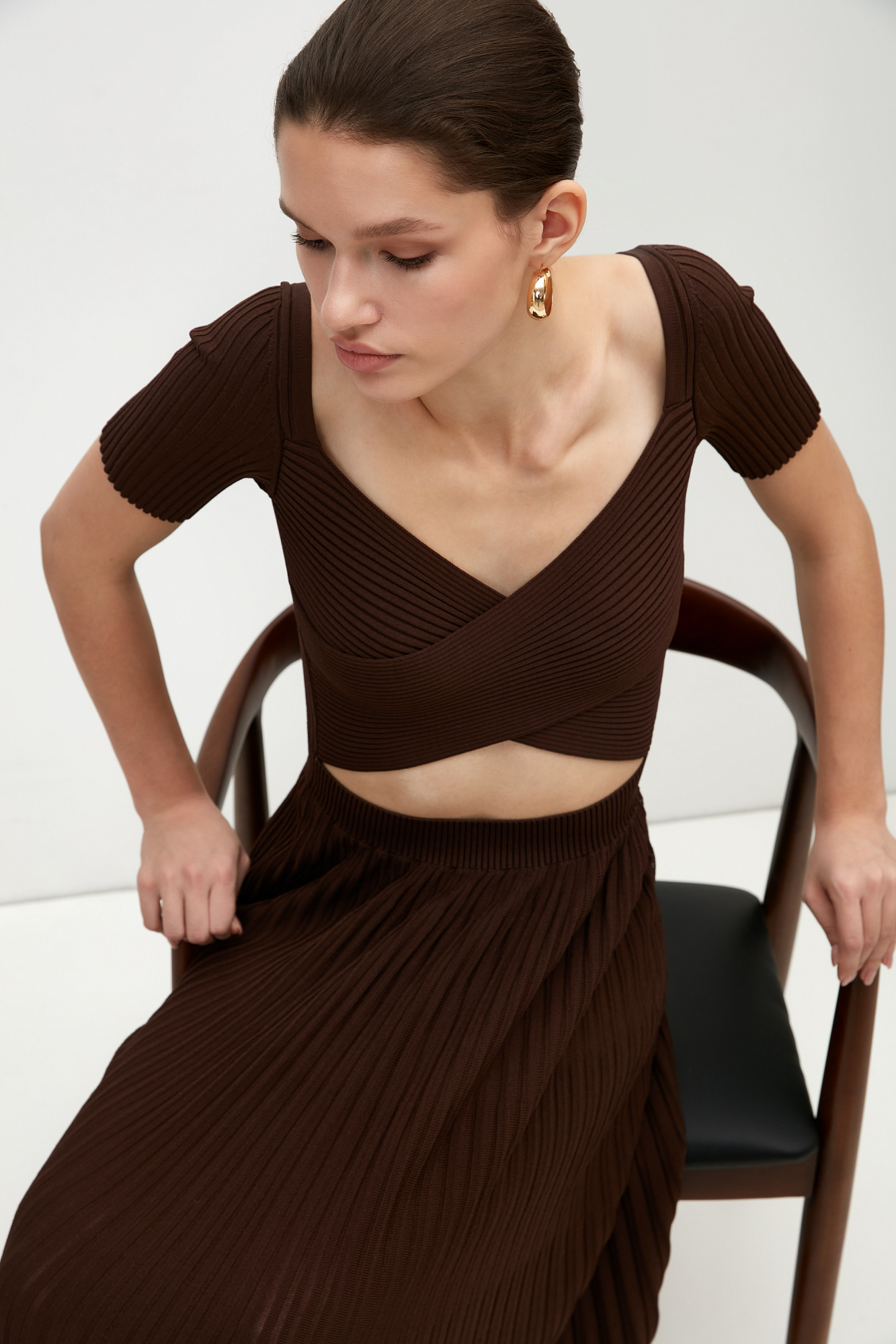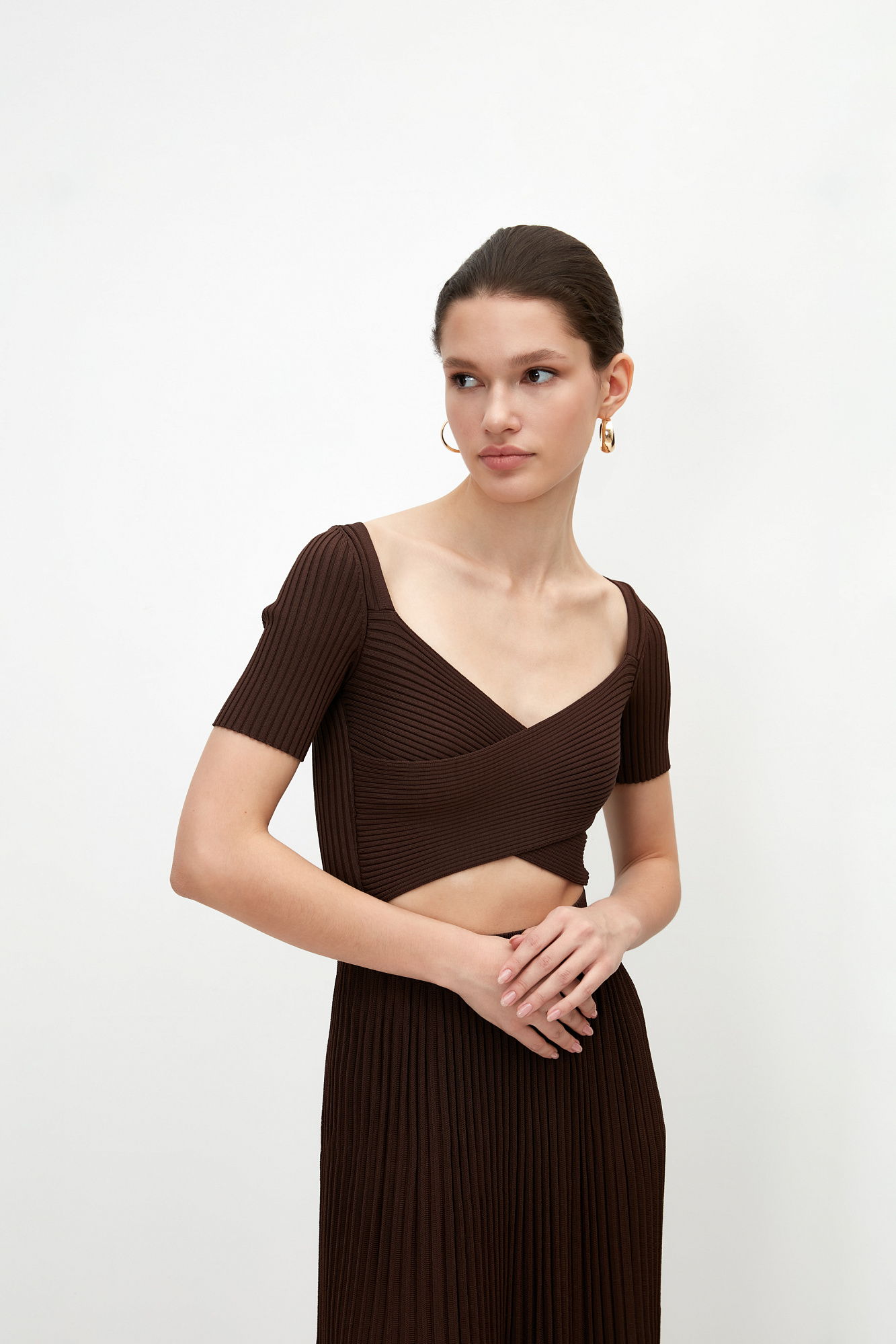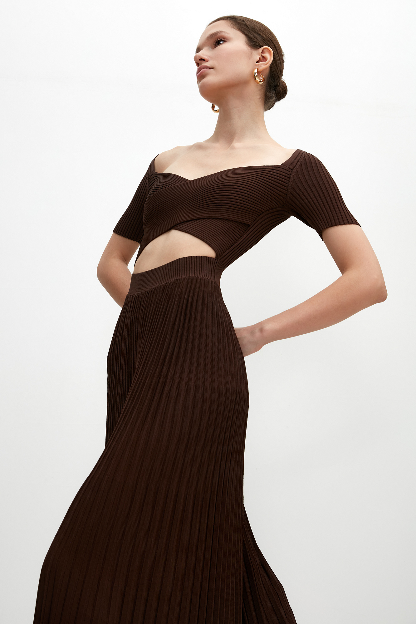 Трикотажное платье из плотной вискозы с юбкой плиссе. Короткие рукава, перекрещенные детали лифа.